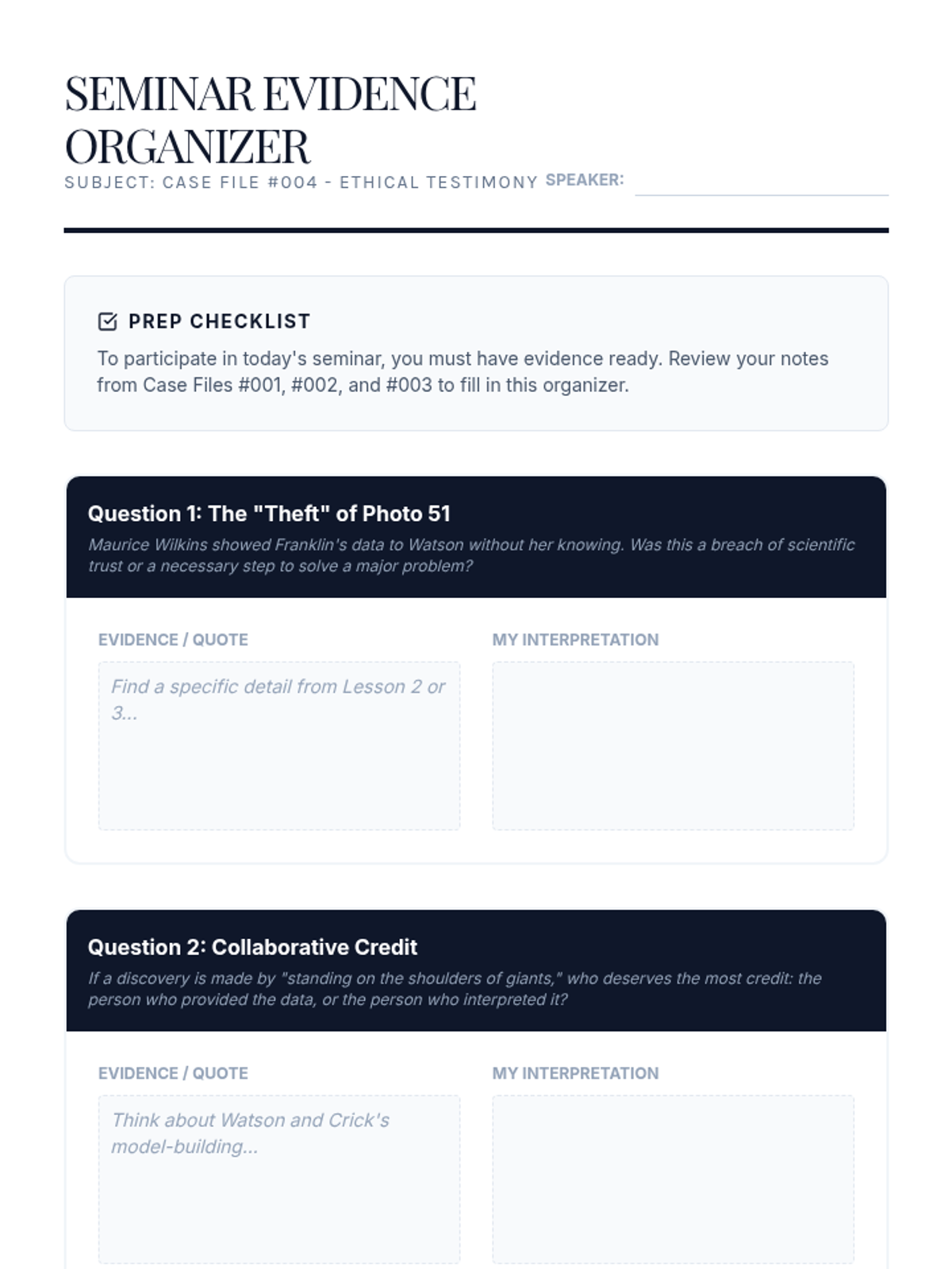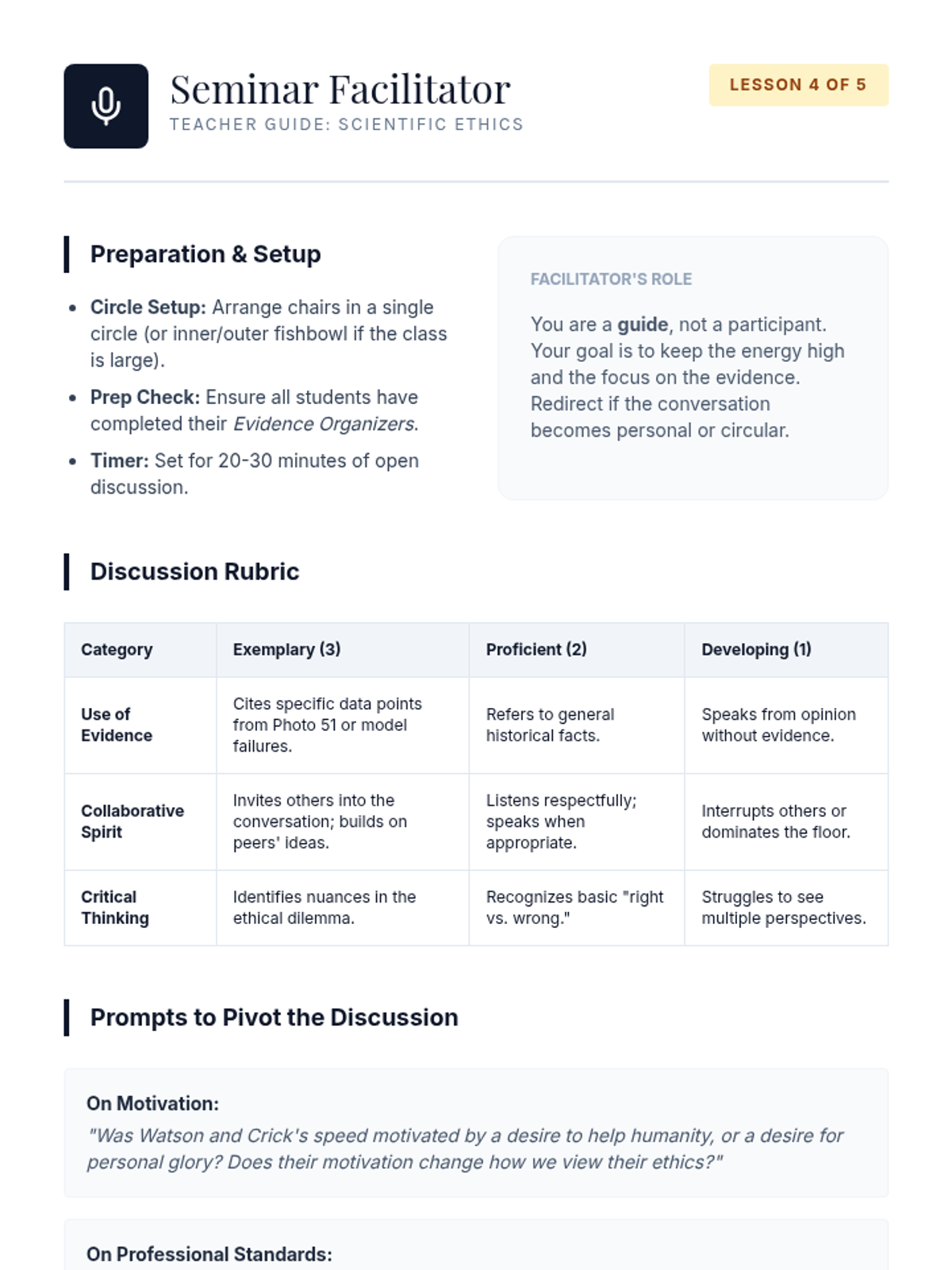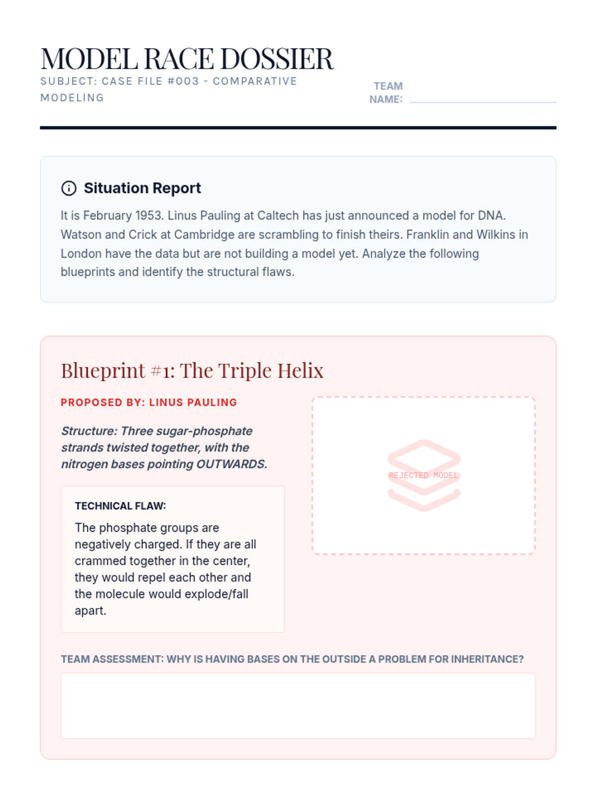 Students engage in a historical case study to understand the human side of scientific discovery surrounding DNA. This sequence examines the race between Watson, Crick, Franklin, and Wilkins, analyzing how data was shared, interpreted, and sometimes stolen. Through primary source analysis and debate, students learn about the collaborative and competitive nature of science.