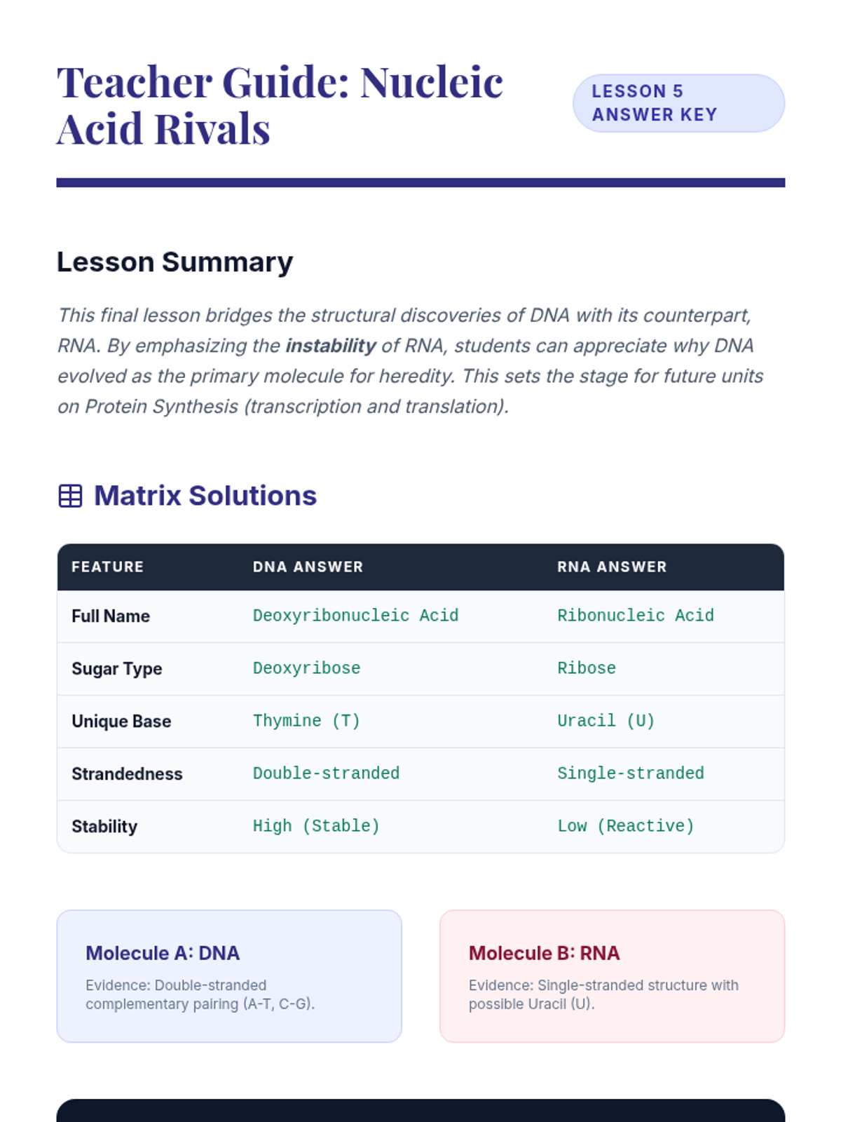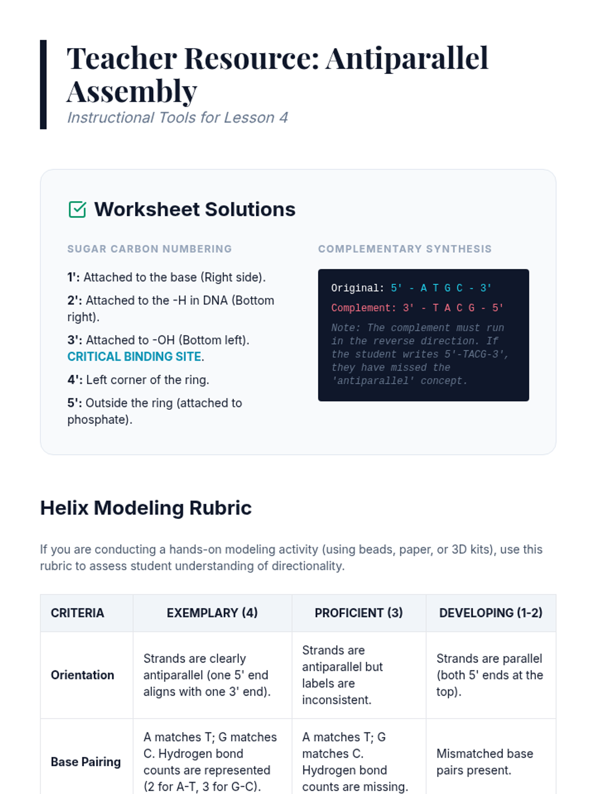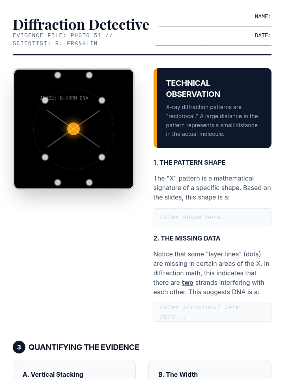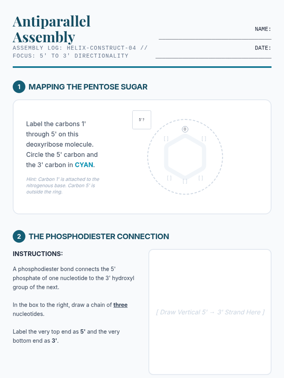 An inquiry-based exploration of DNA structure, from its chemical monomers and historical data to the final antiparallel double helix model. Students act as scientific researchers to deduce the molecular architecture of life.