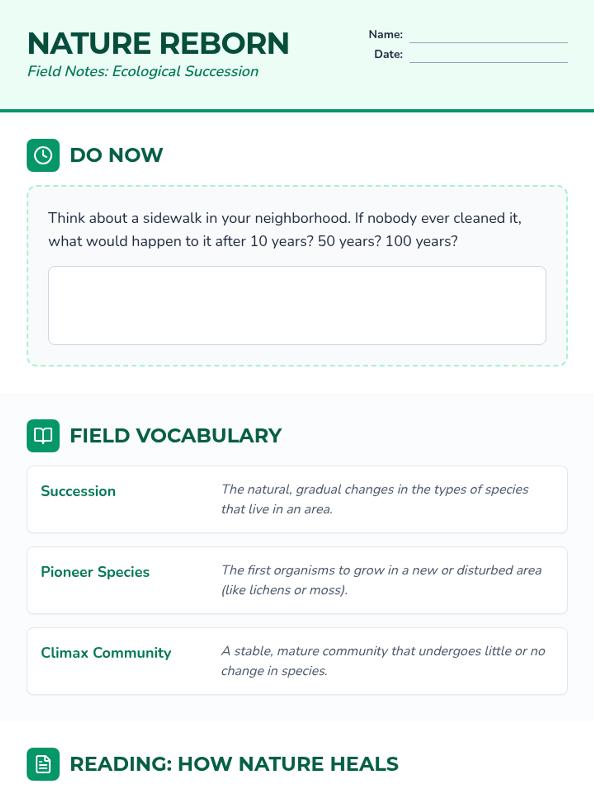A two-week environmental science review sequence focusing on key takeaways: climate change, pollution, renewable energy, and biodiversity. Students compile a 'Field Dossier' review packet as a final course artifact.