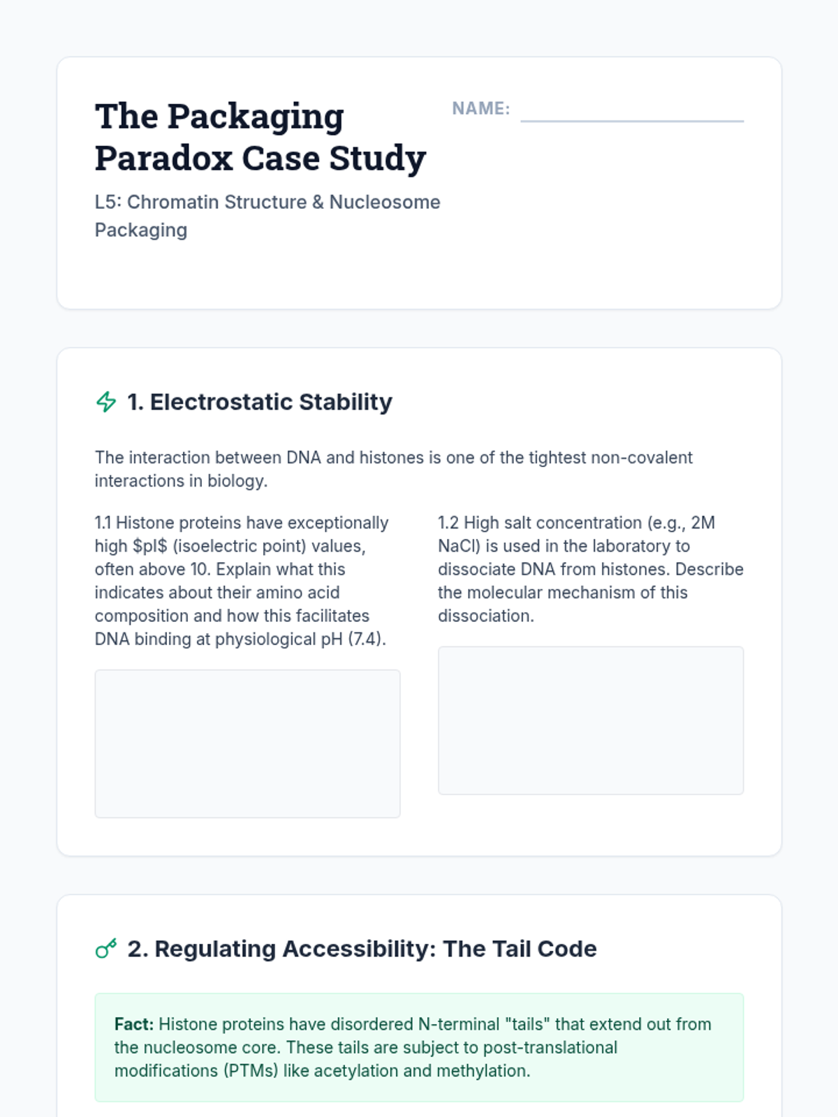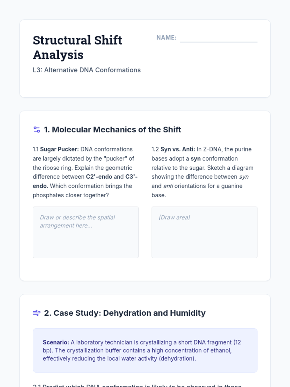 An undergraduate-level sequence exploring the physicochemical properties of DNA, covering nucleotide chemistry, thermodynamic stability, alternative helical conformations, topological constraints, and hierarchical packaging in chromatin.