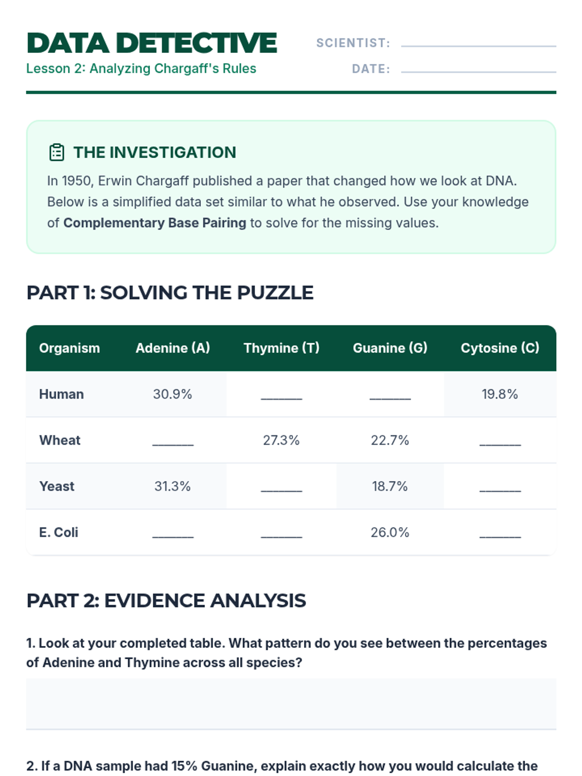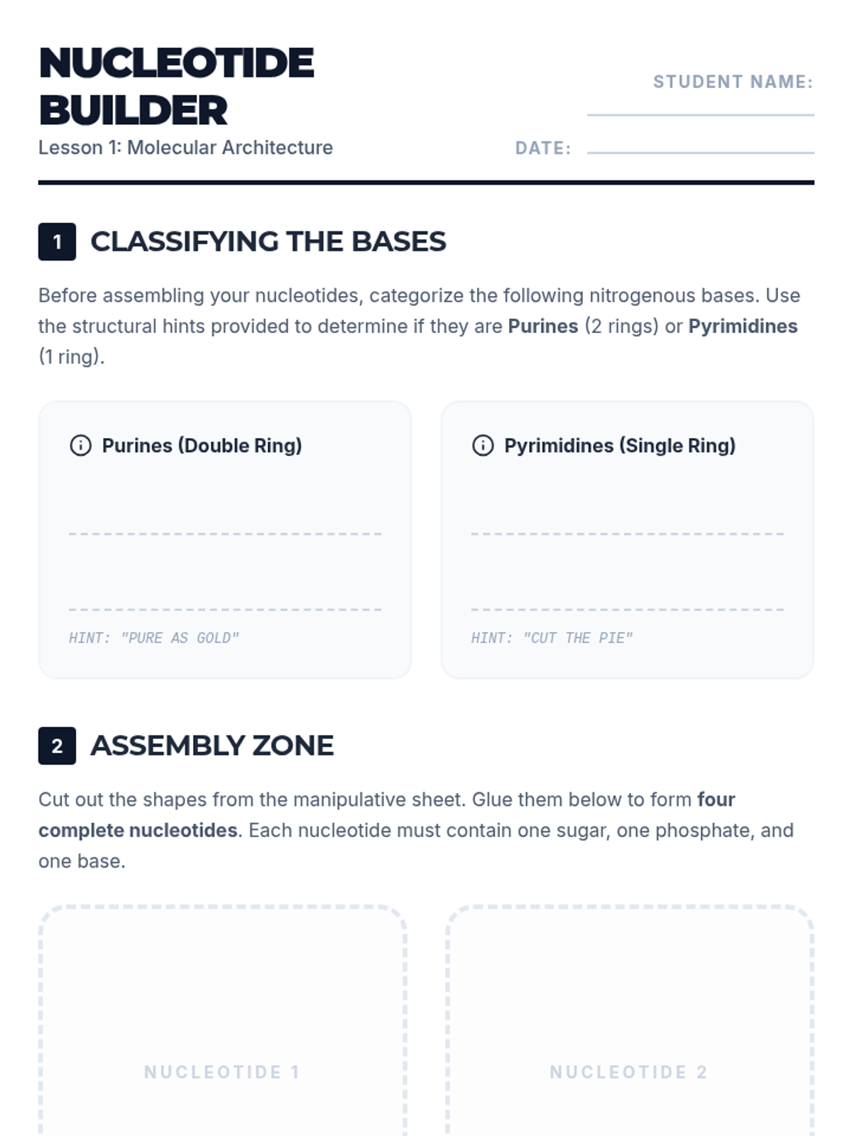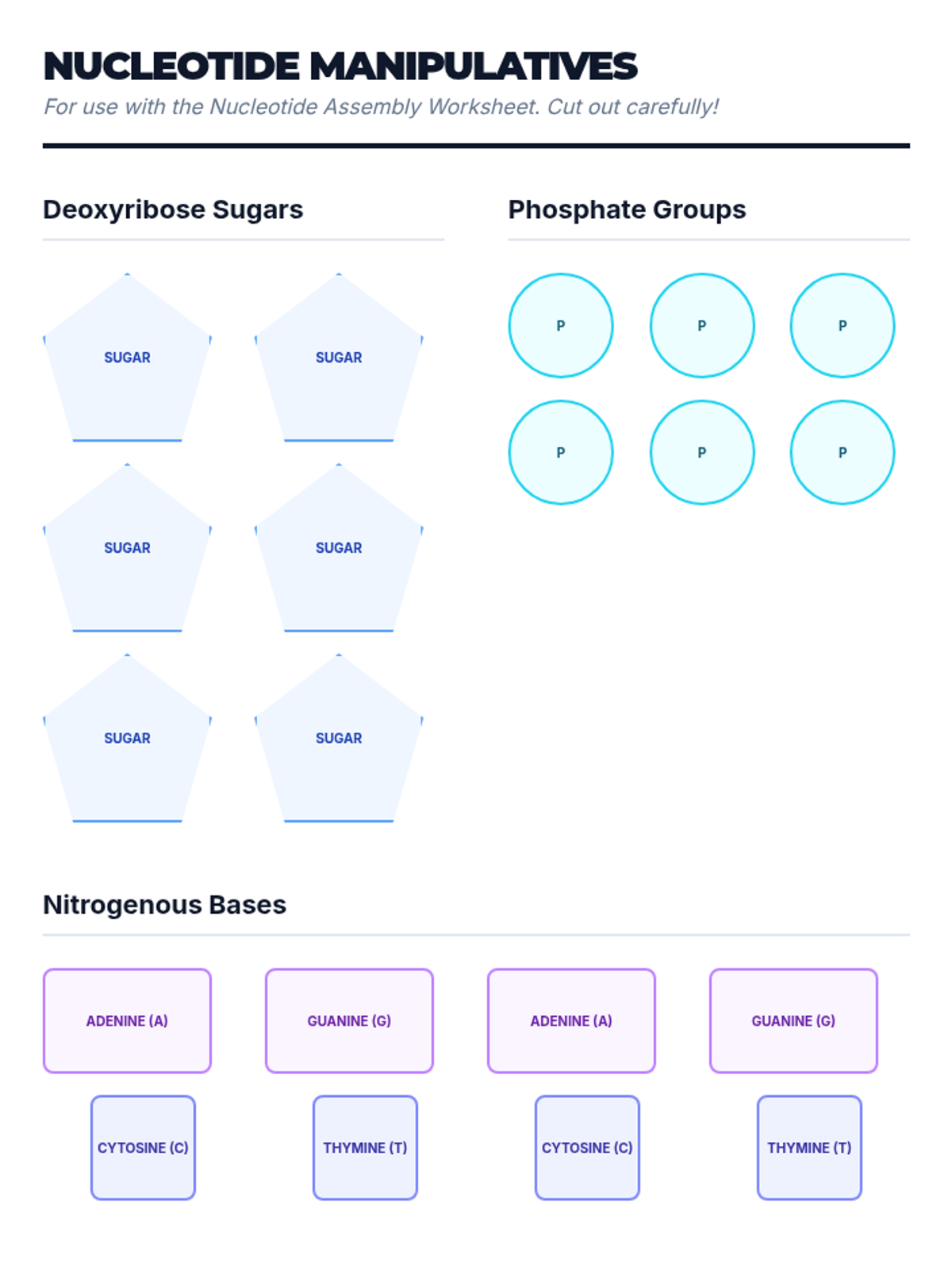 This 5-lesson sequence explores the molecular architecture of DNA. Students journey from identifying basic chemical building blocks to analyzing historical data and performing wet-lab extractions, culminating in a deep understanding of how the double helix structure enables genetic inheritance.