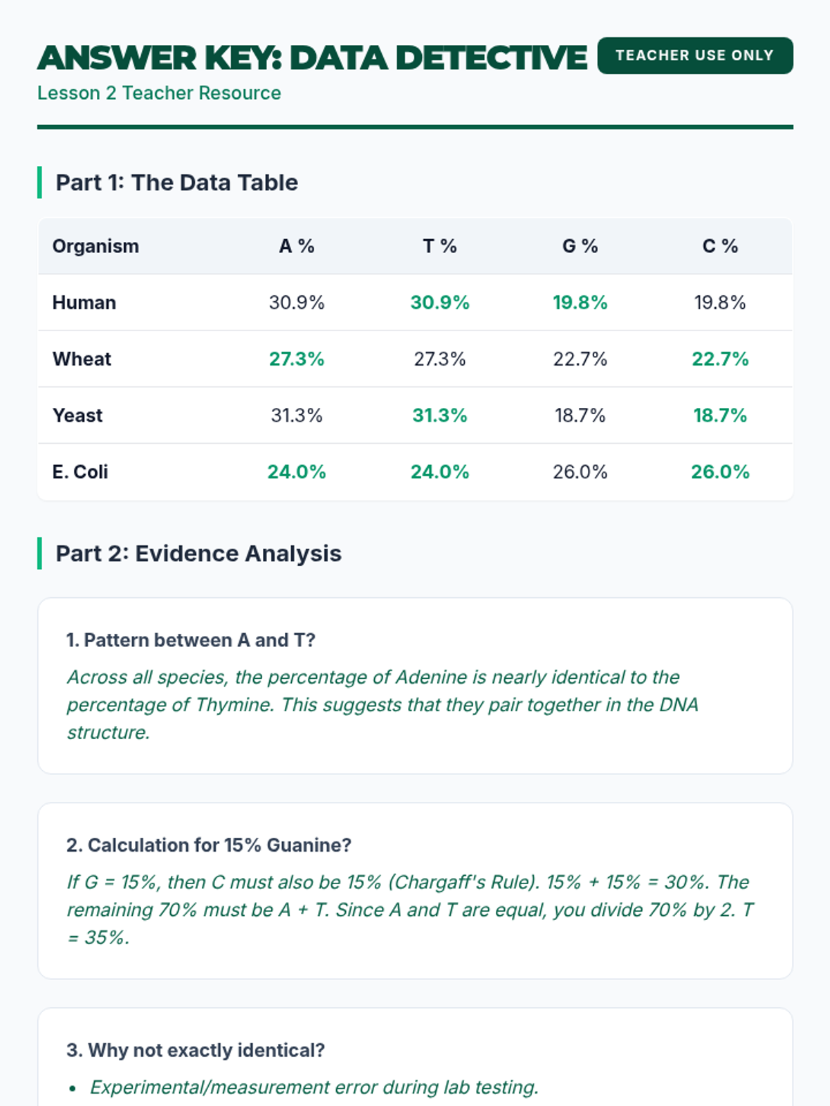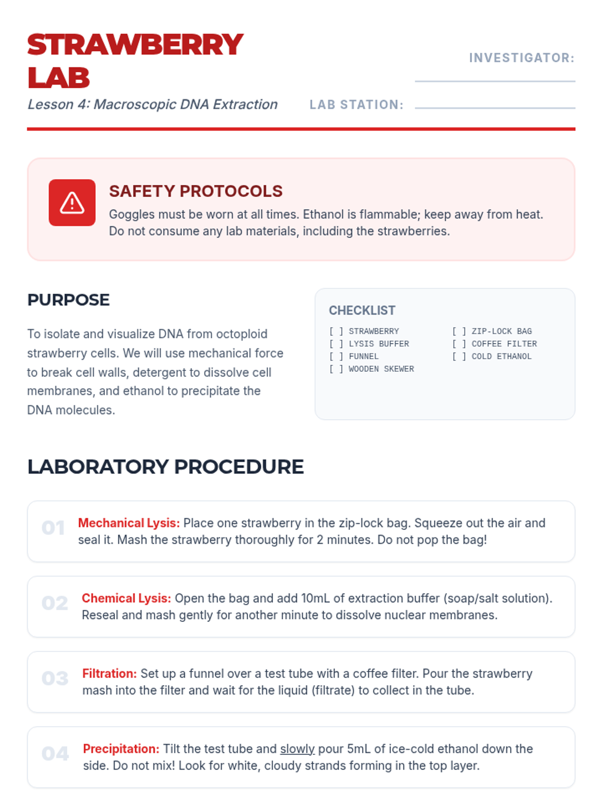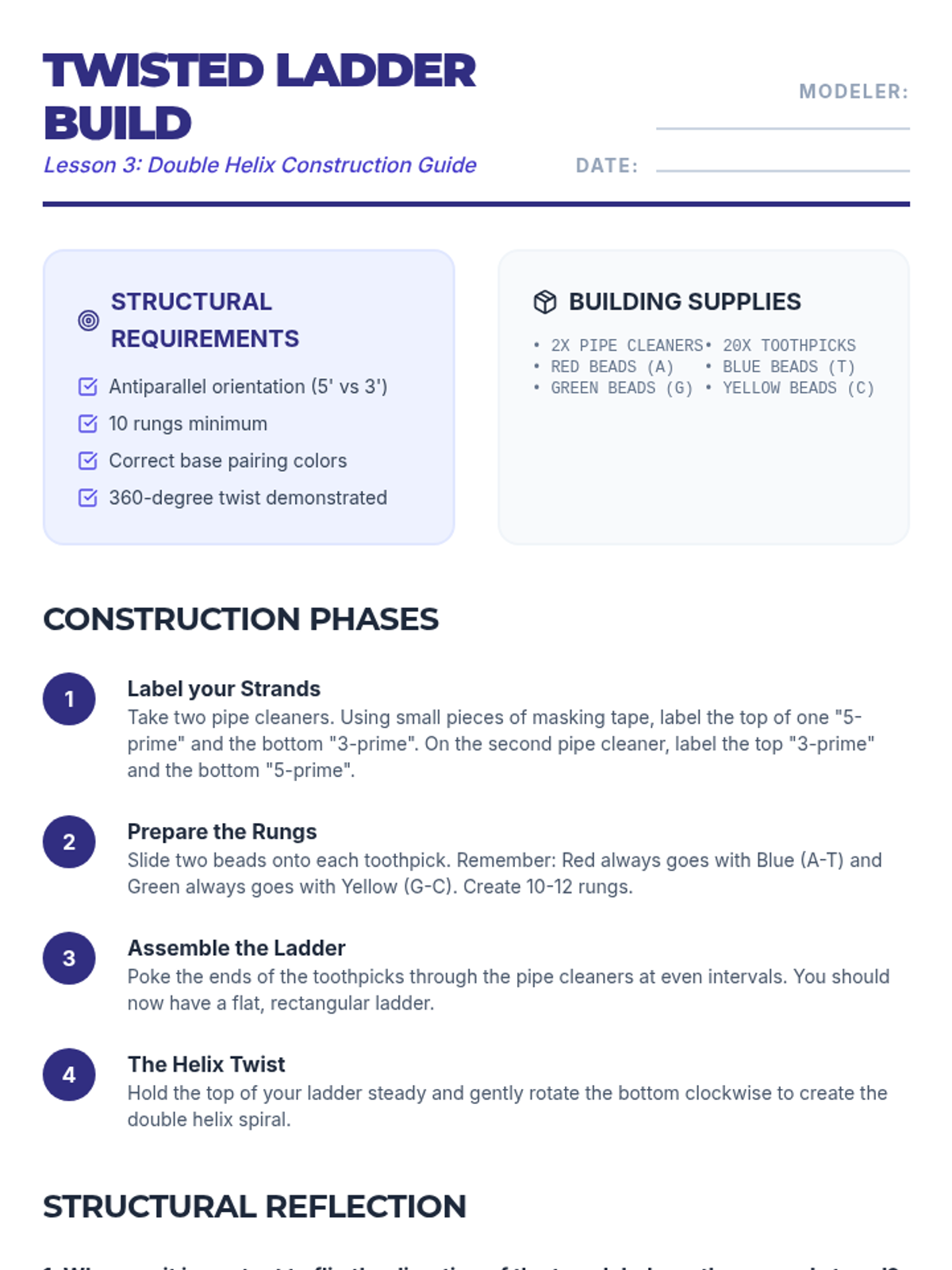 This 5-lesson sequence explores the molecular architecture of DNA. Students journey from identifying basic chemical building blocks to analyzing historical data and performing wet-lab extractions, culminating in a deep understanding of how the double helix structure enables genetic inheritance.