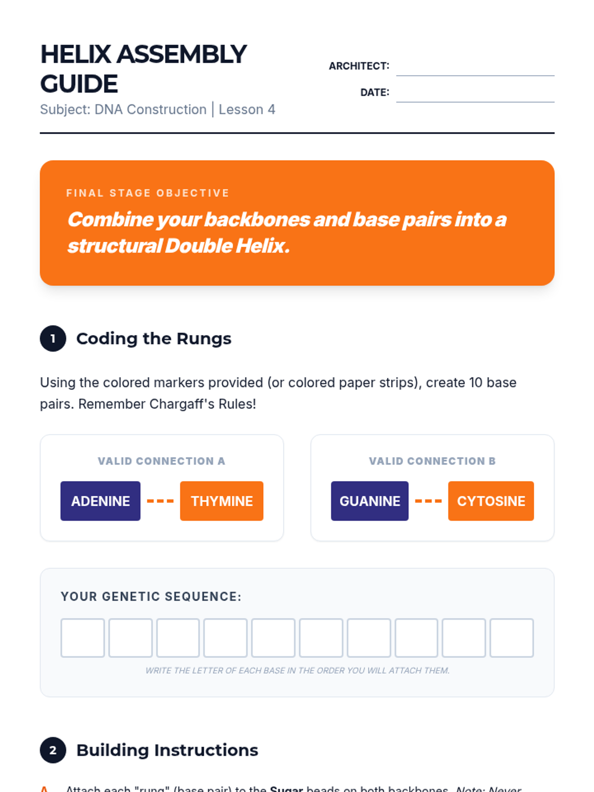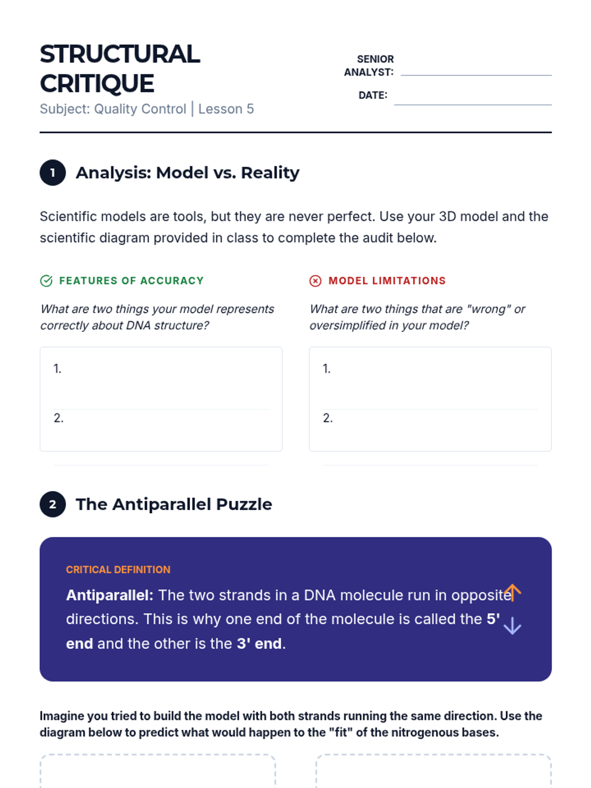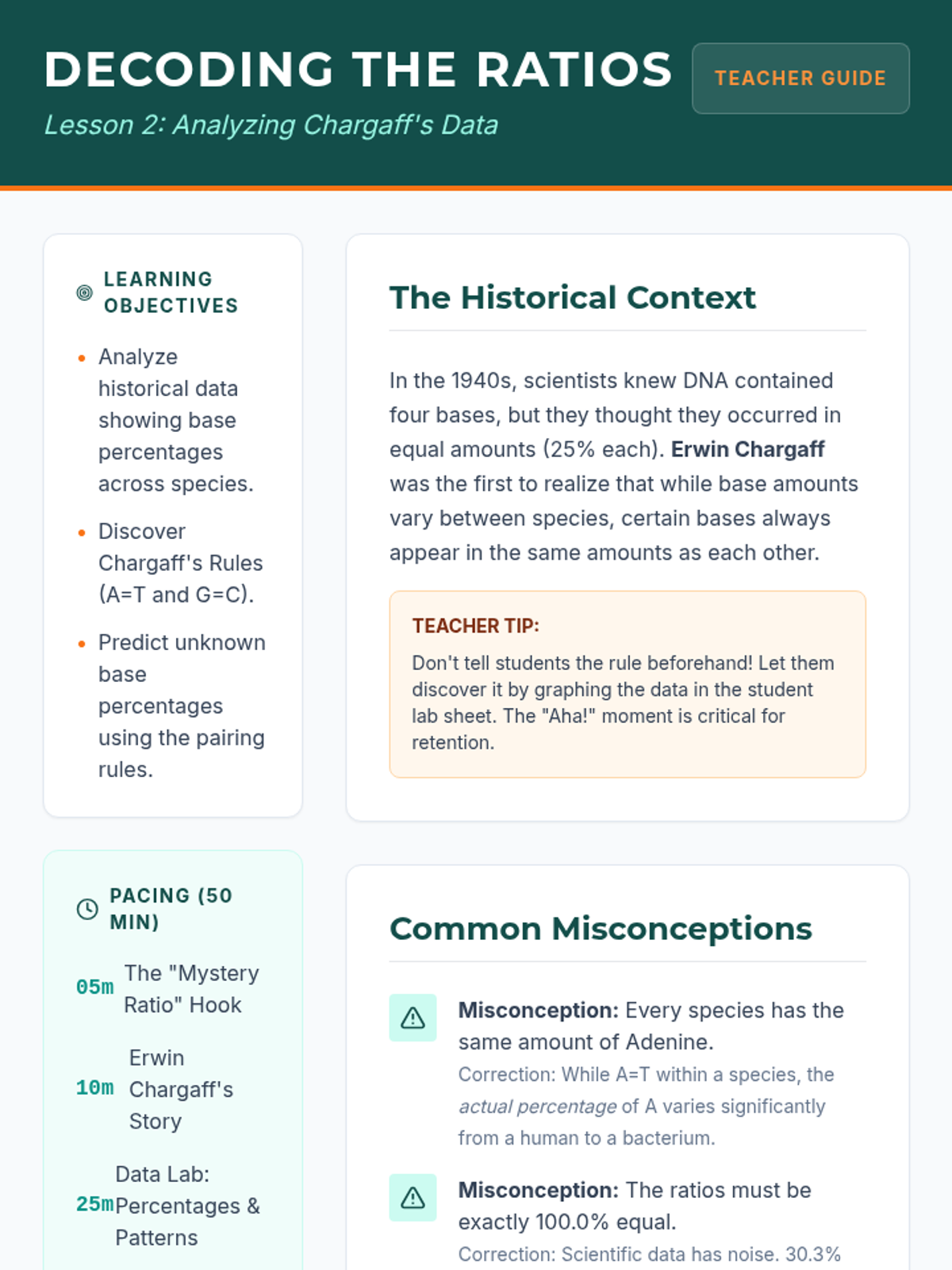 An inquiry-based biology unit where 8th-grade students act as structural biologists to deduce the physical arrangement of the DNA molecule, culminating in the construction of a 3D model. Students explore nucleotides, analyze Chargaff's ratios, and understand the functional importance of the double helix structure.