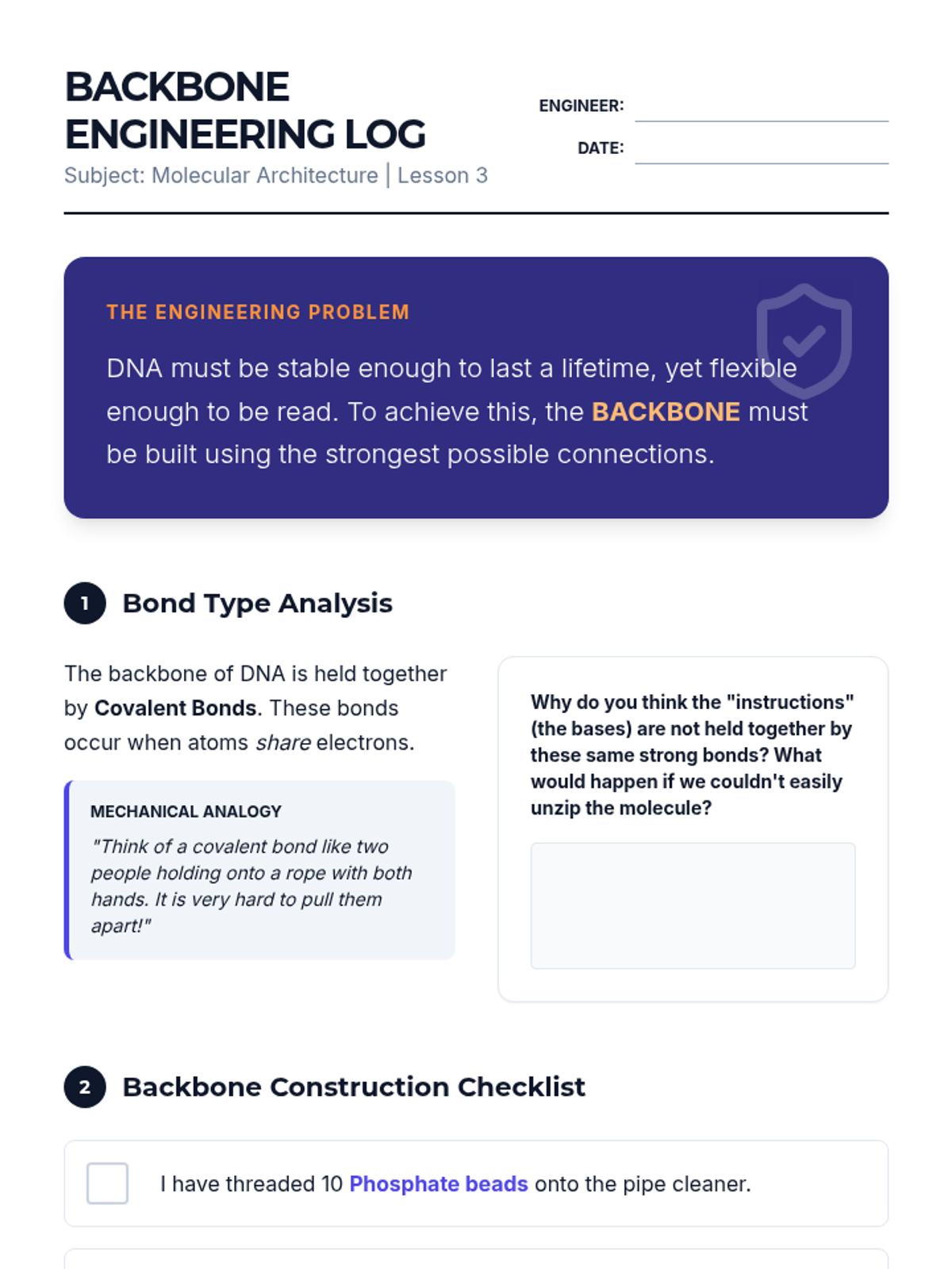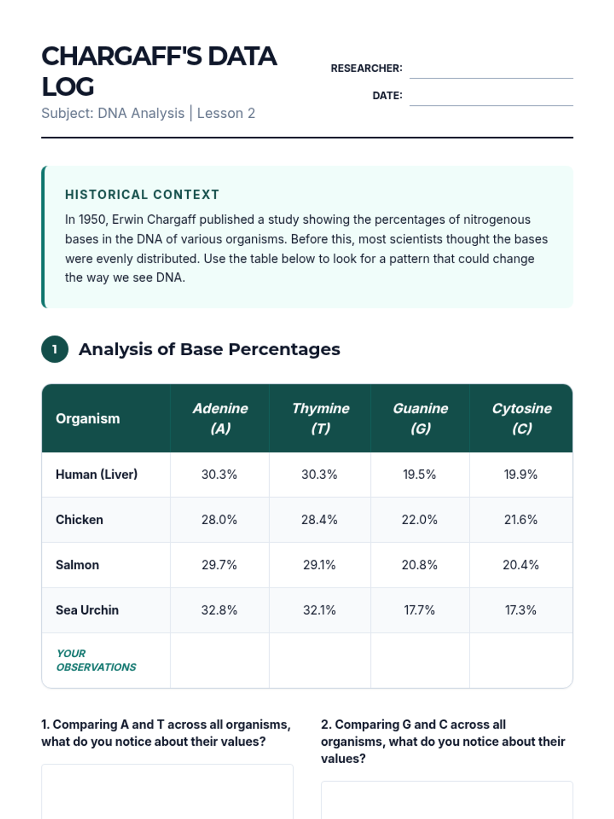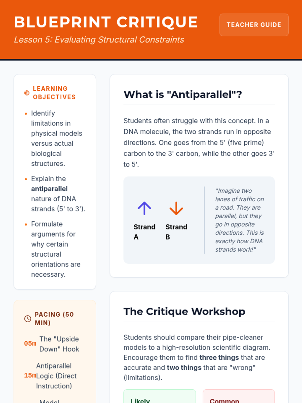 An inquiry-based biology unit where 8th-grade students act as structural biologists to deduce the physical arrangement of the DNA molecule, culminating in the construction of a 3D model. Students explore nucleotides, analyze Chargaff's ratios, and understand the functional importance of the double helix structure.