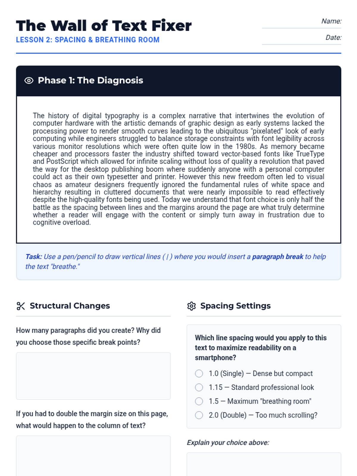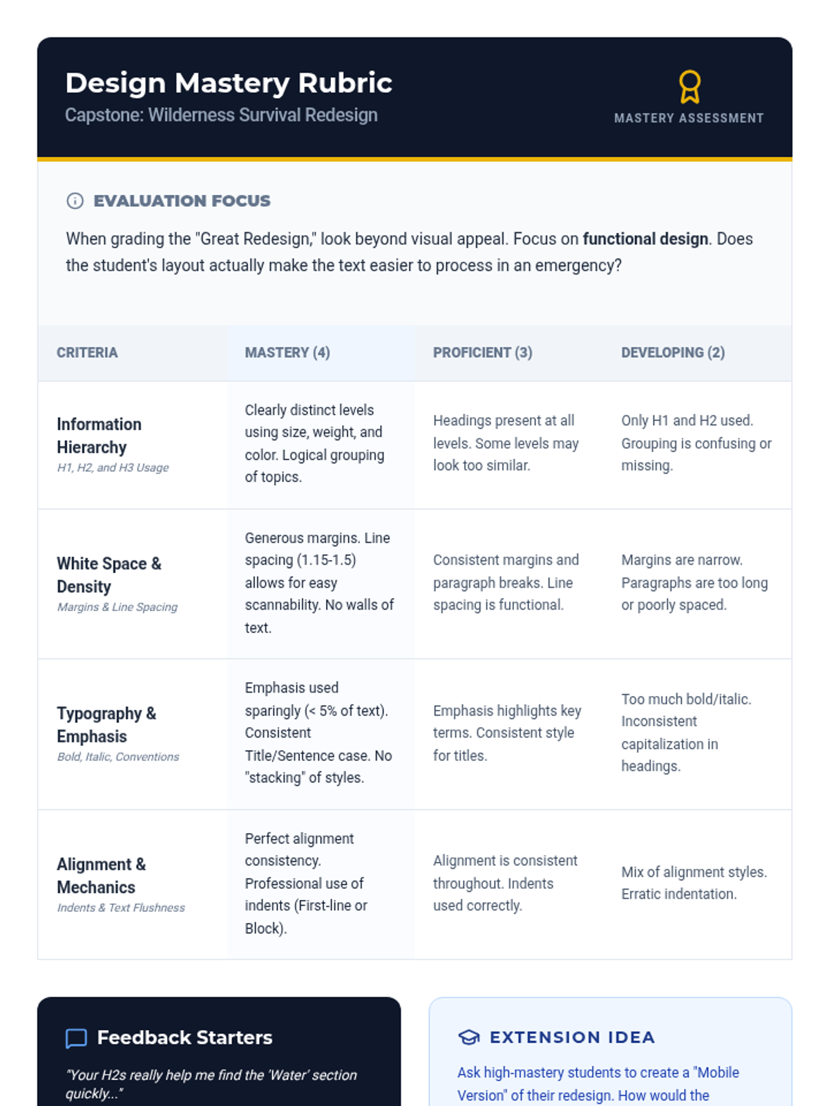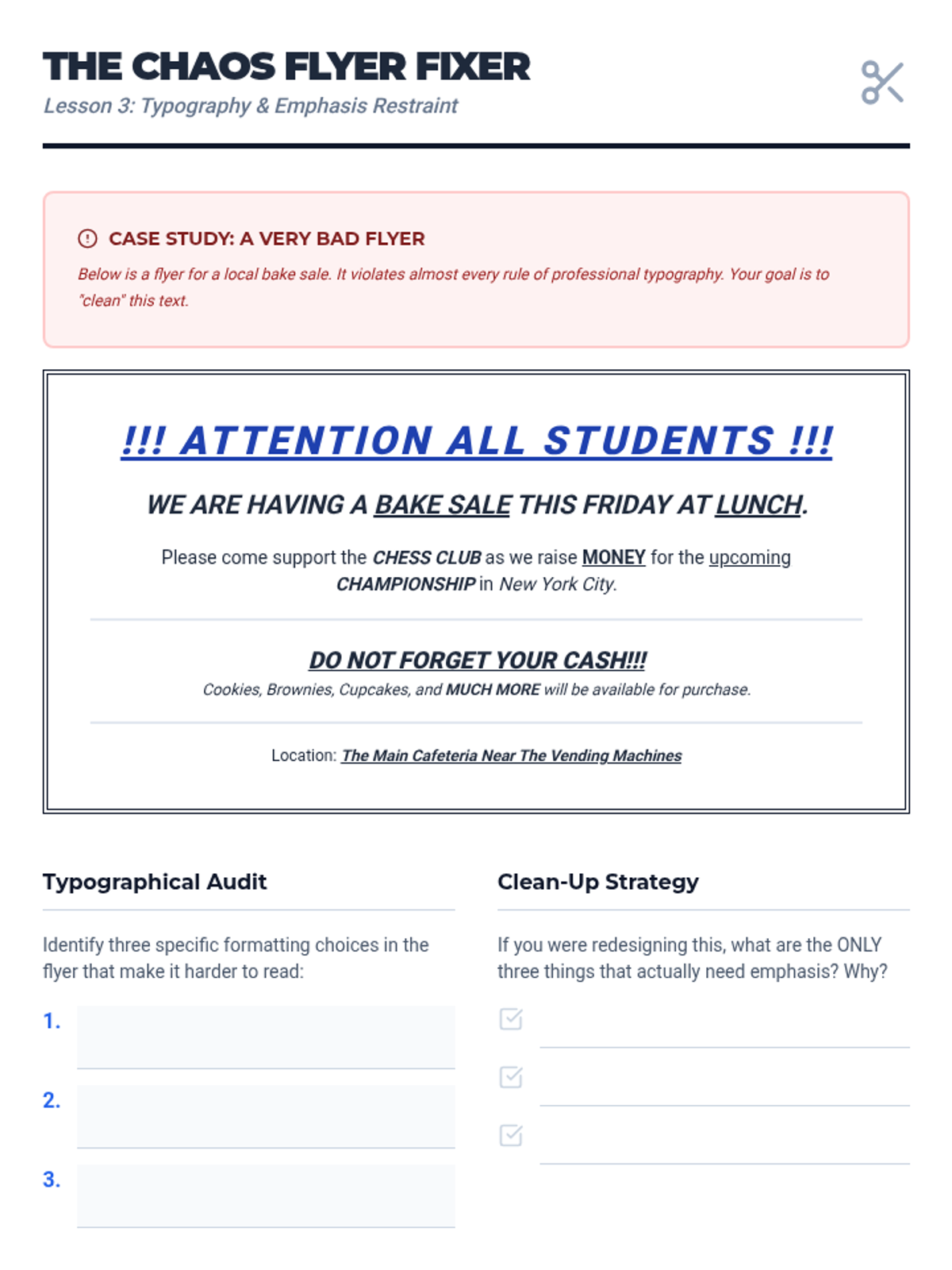 This sequence teaches 10th-grade students the principles of document design and visual hierarchy. Students explore how headings, white space, typography, and alignment function as tools for cognitive accessibility and effective communication.