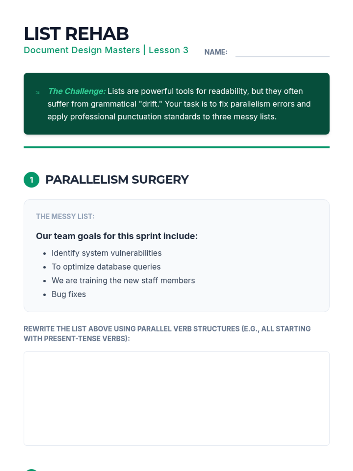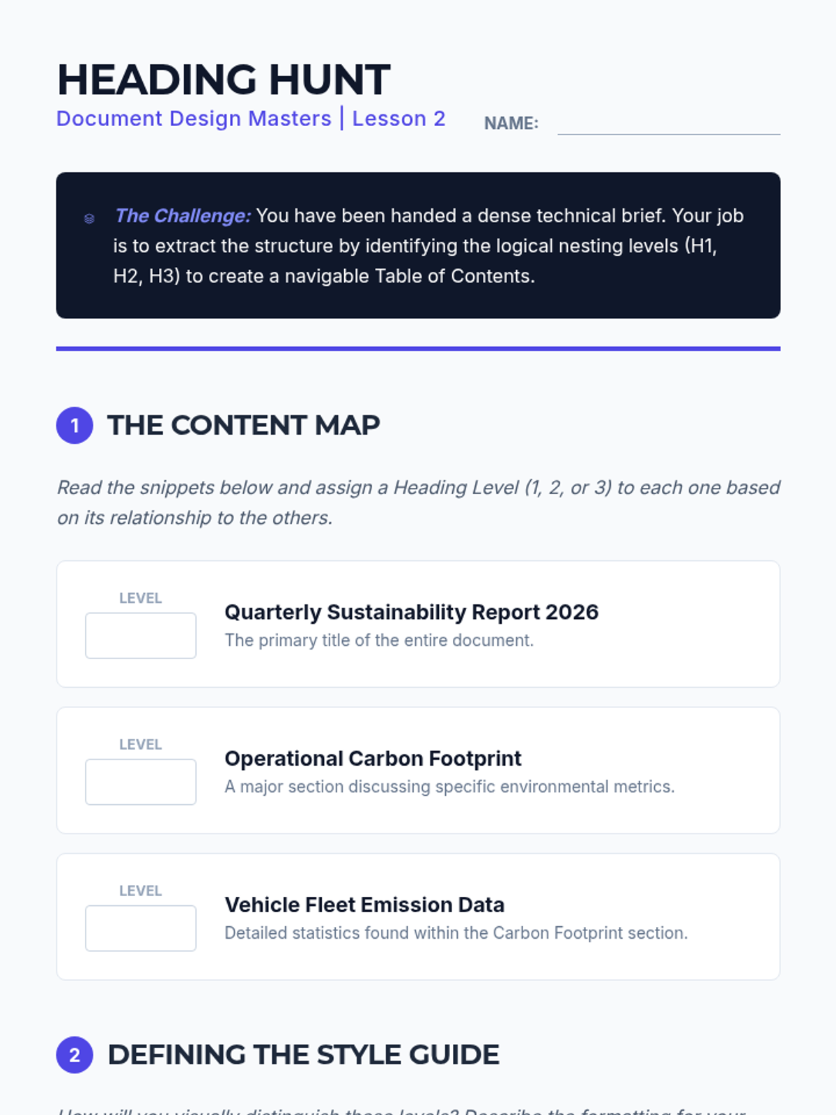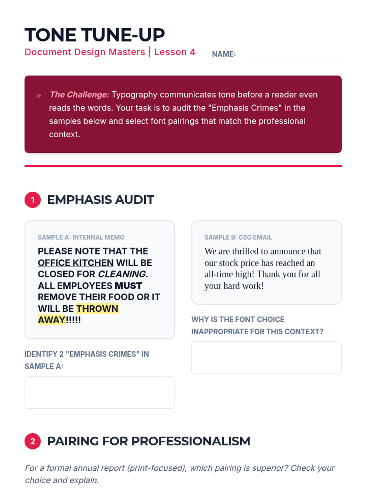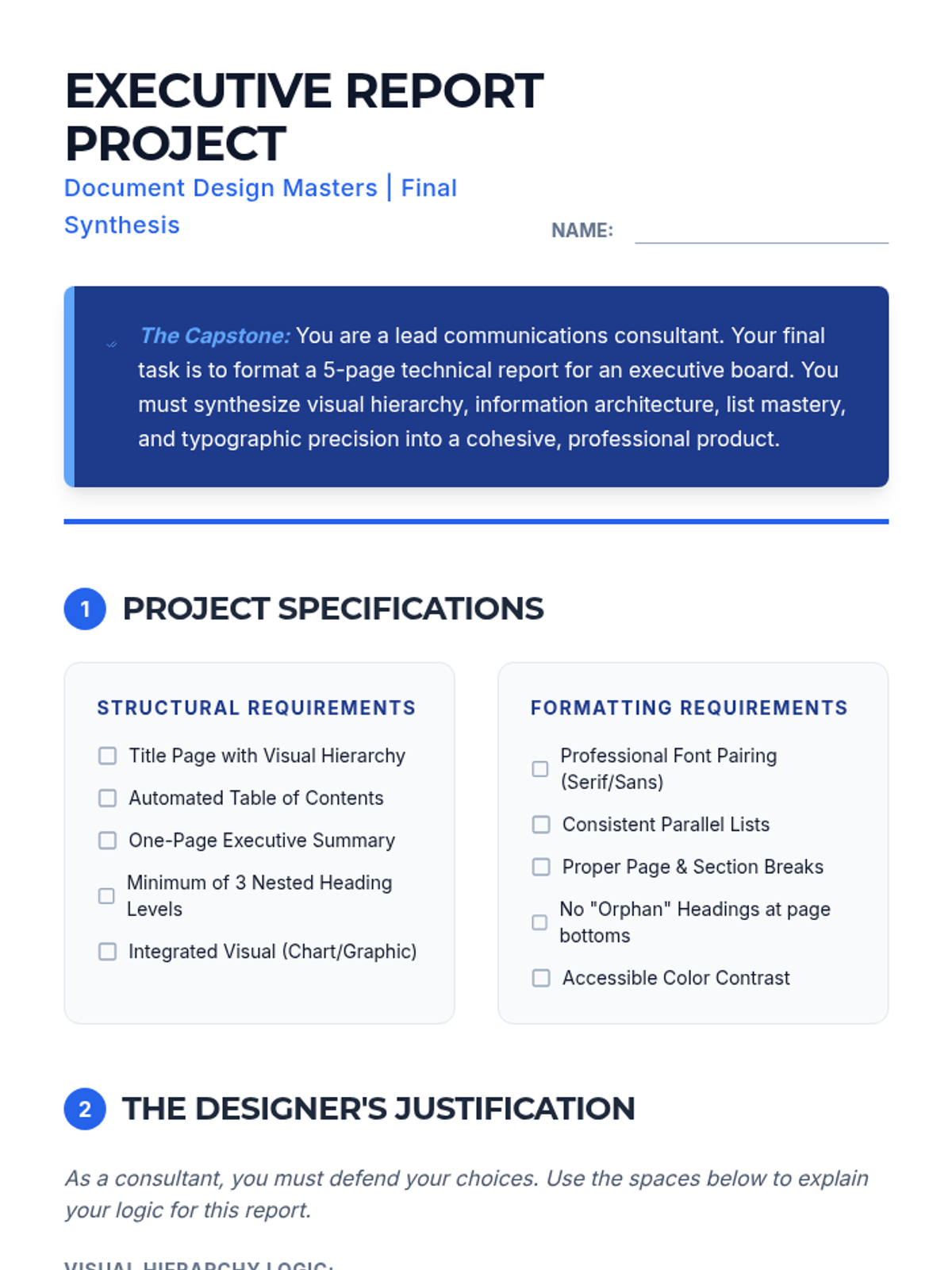 This sequence explores the principles of professional document design, focusing on how visual hierarchy, white space, headings, typography, and lists enhance readability and user experience. Students move from theoretical design principles to the practical application of formatting in complex business reports.
