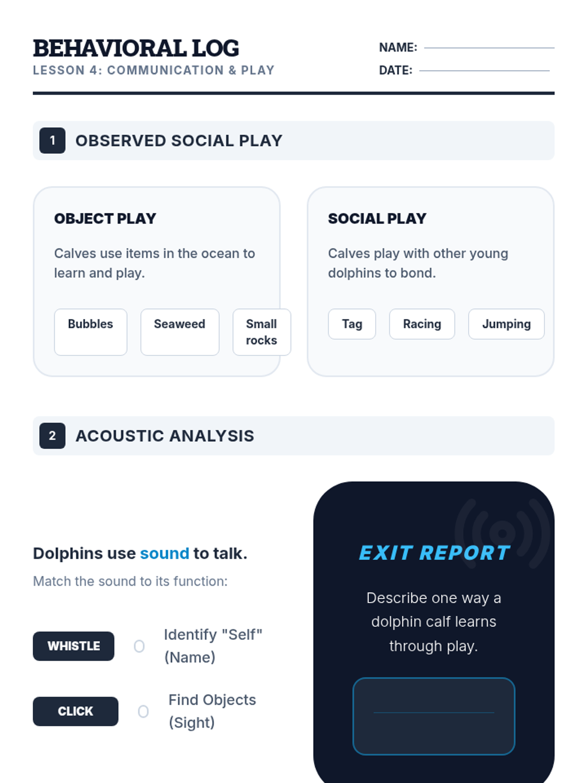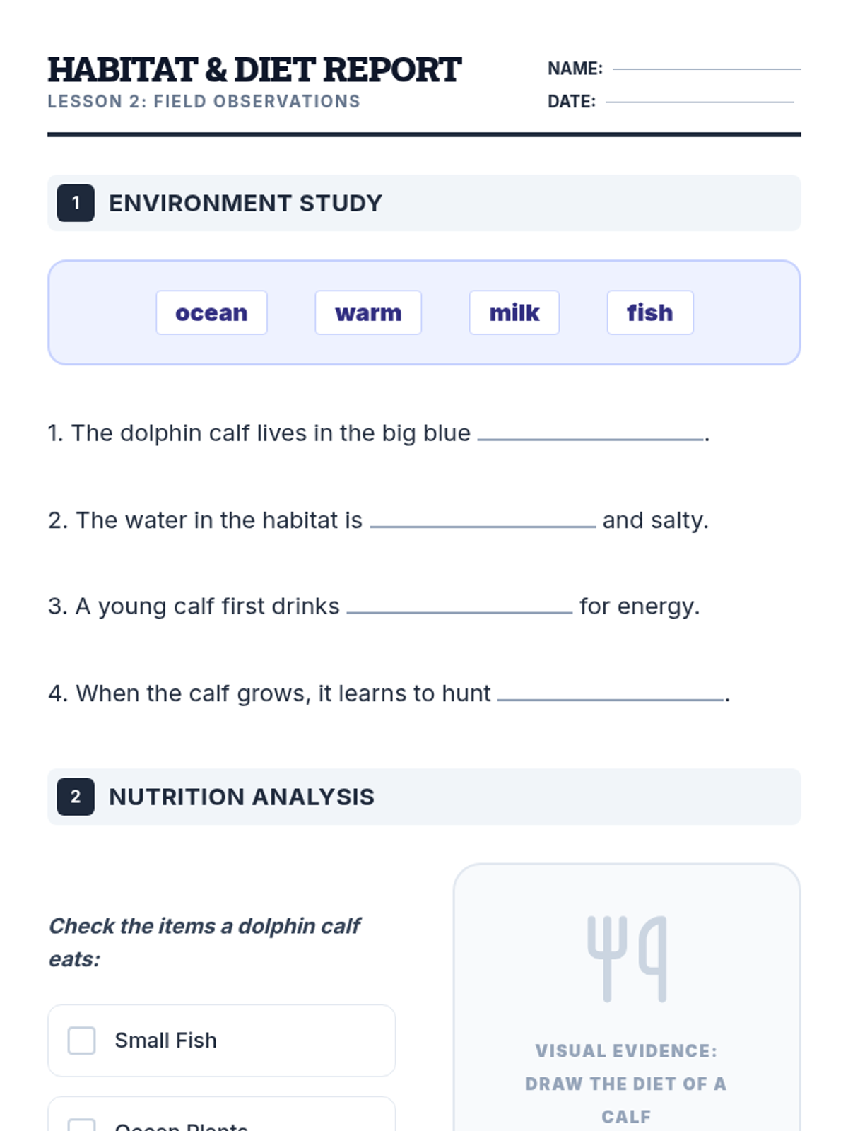 A 4-lesson ESL sequence for Grade 2 students focusing on the life and growth of baby dolphins (calves). Students will explore dolphin habitats, diets, and behaviors through visual stories, matching activities, and simple writing exercises tailored for WIDA Level 2 learners.