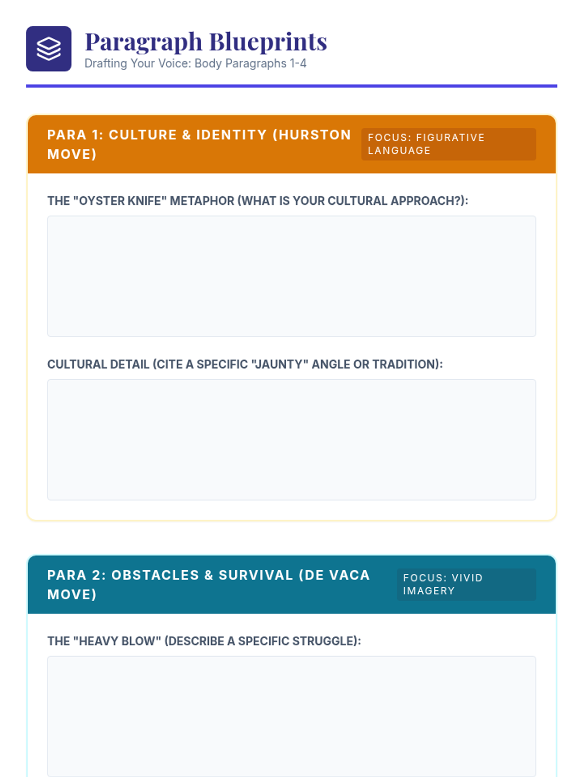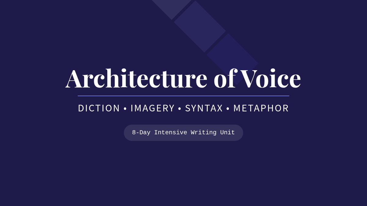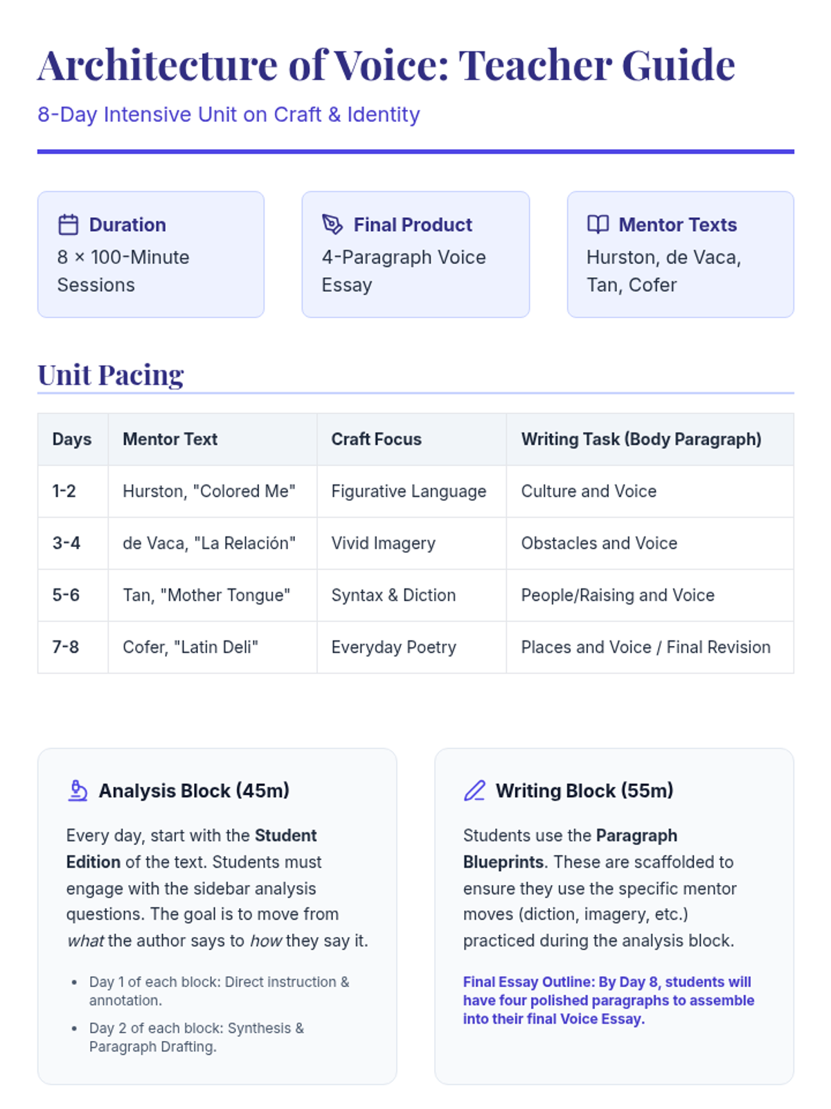 An 8-day intensive unit titled 'The Architecture of Voice.' Students analyze four diverse mentor texts—Hurston, de Vaca, Tan, and Cofer—to understand how craft elements like figurative language, imagery, syntax, and diction shape an author's tone and perspective. For each text, students produce a structured paragraph, culminating in a comprehensive autobiographical essay that explores the various forces (culture, challenges, people, and places) that have shaped their own voices.