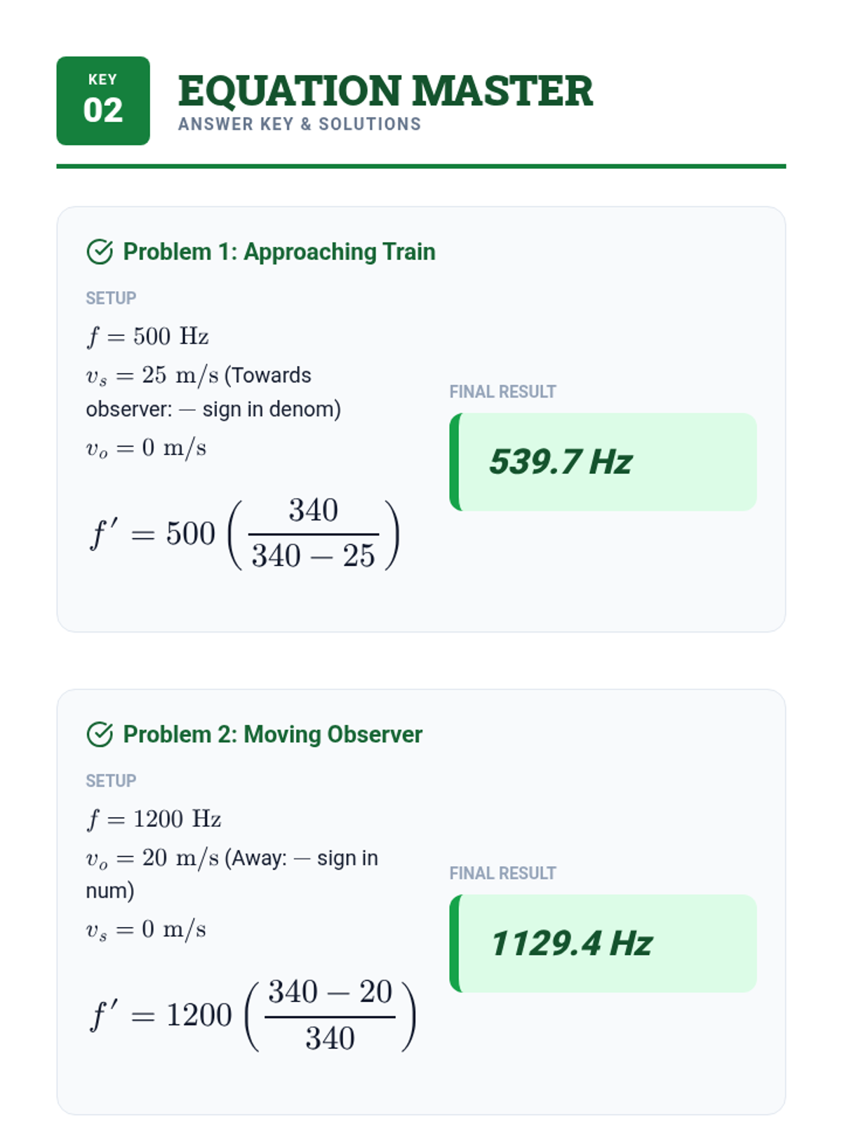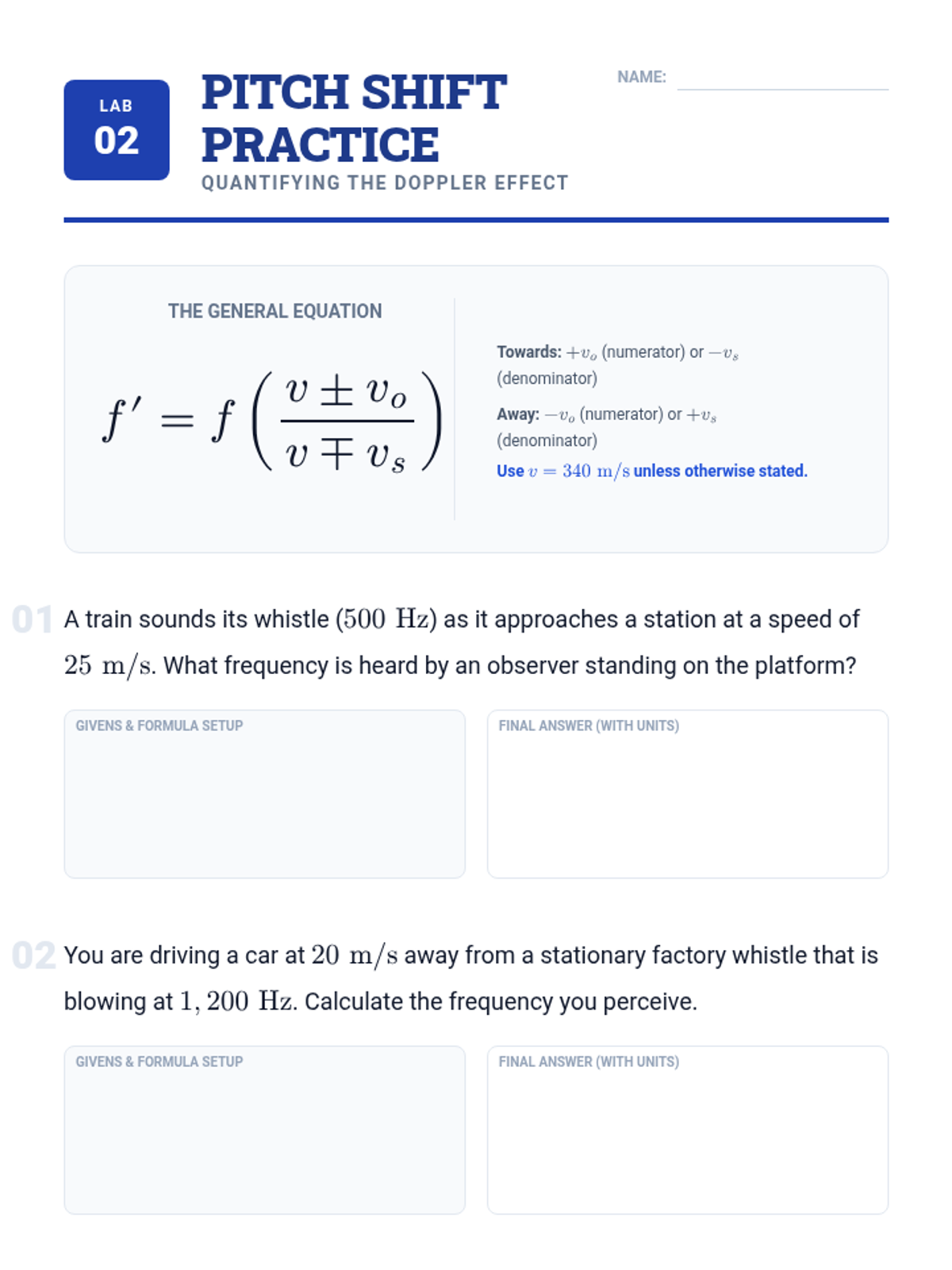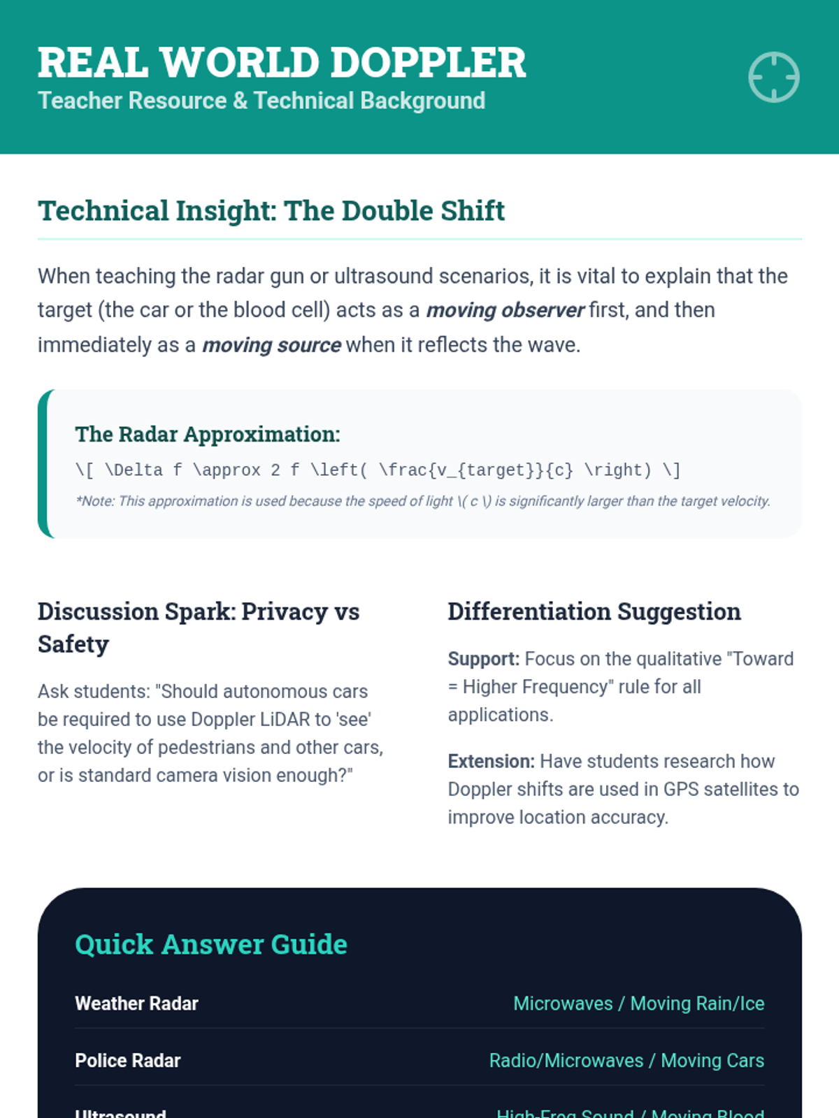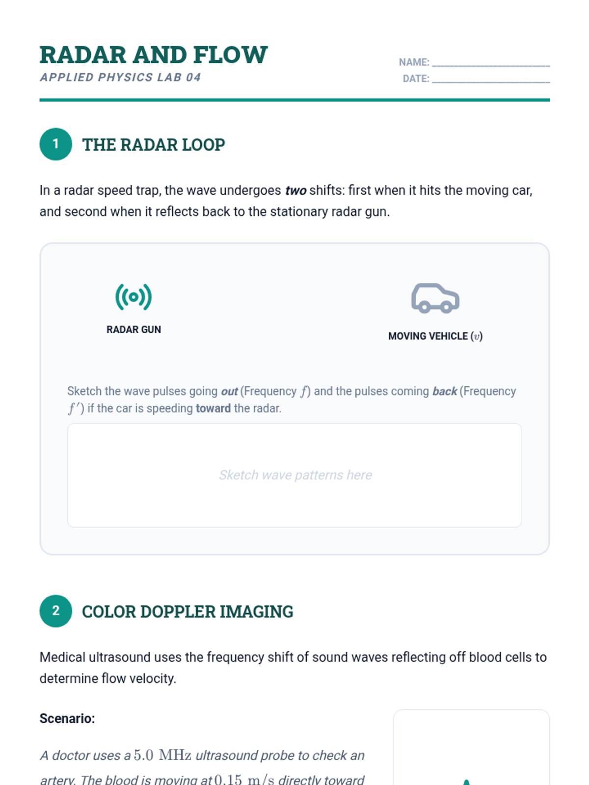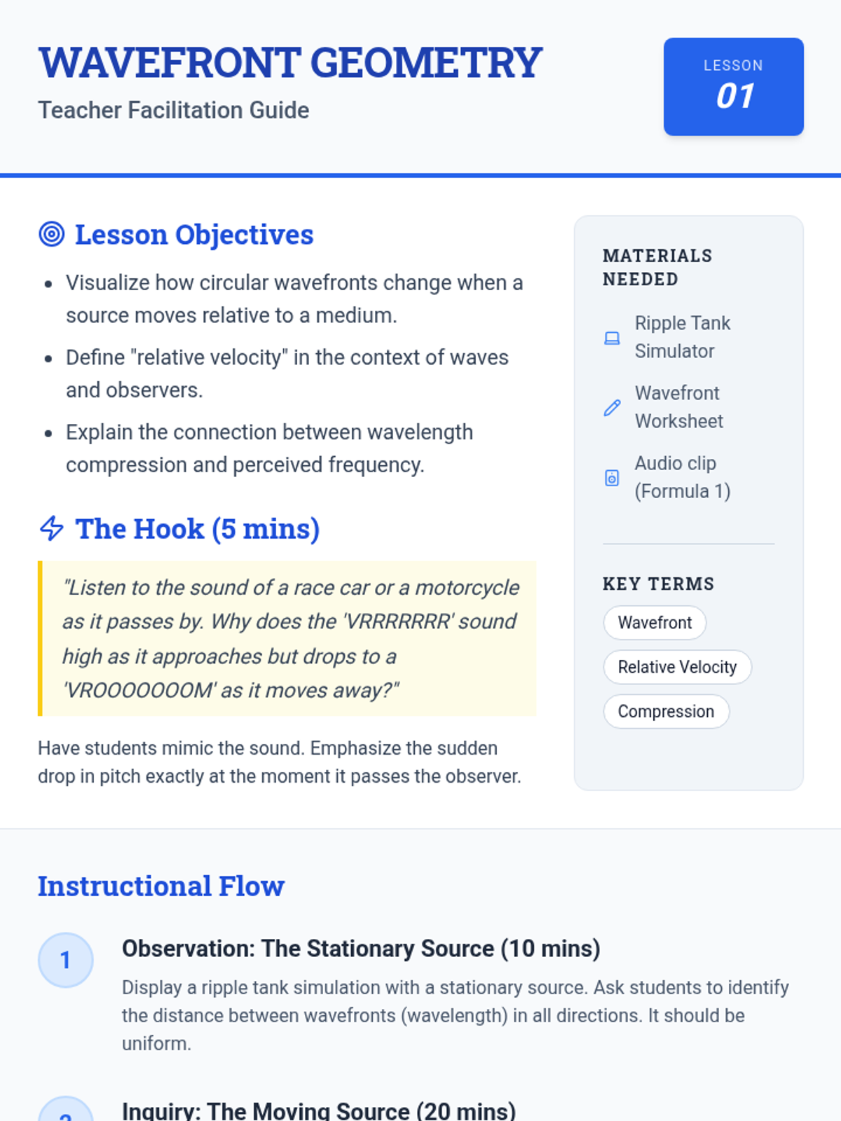 A comprehensive 11th-grade physics sequence on the Doppler effect, covering conceptual visualization, mathematical derivation, supersonic phenomena, and real-world applications in medicine and astronomy.