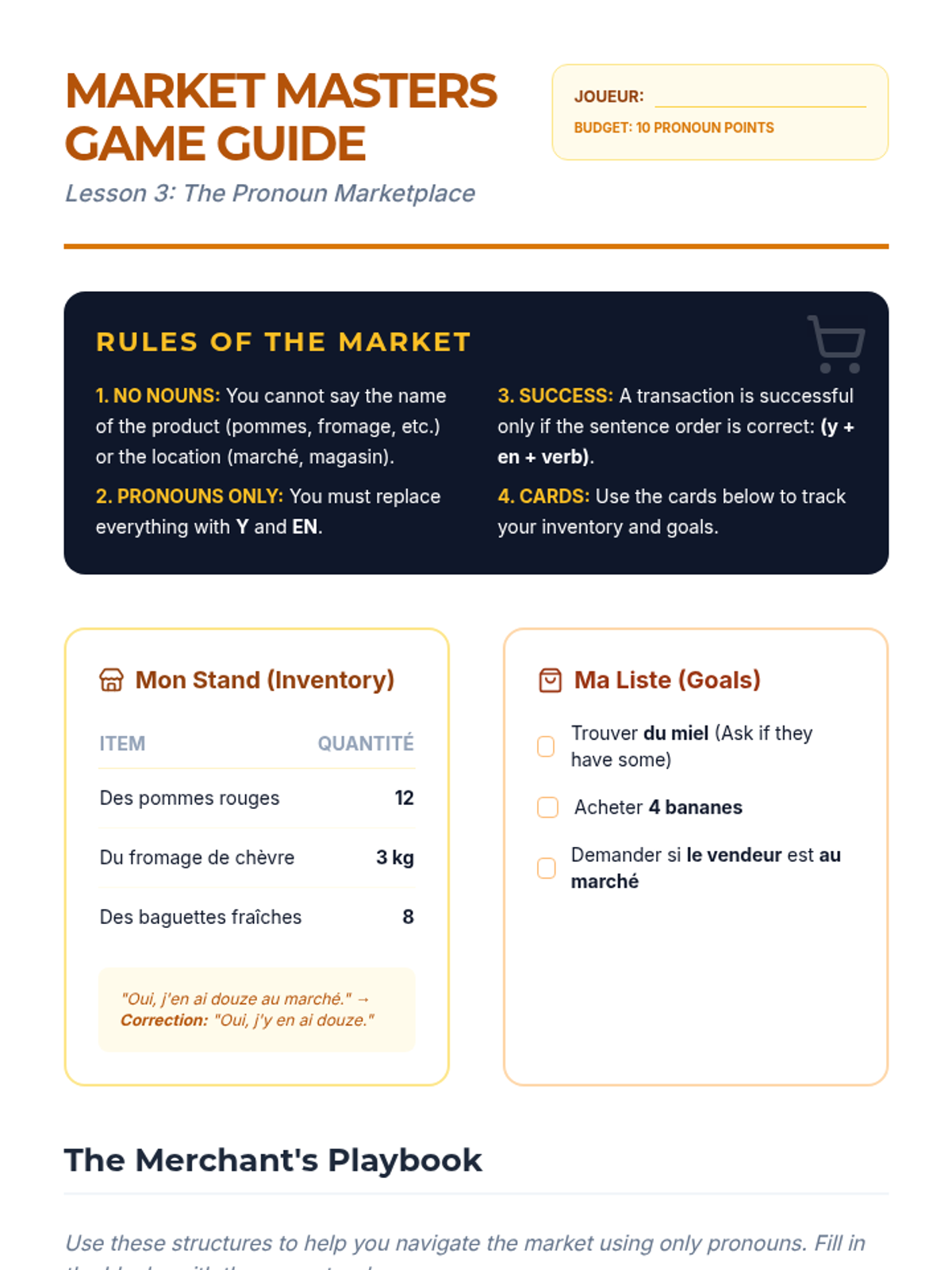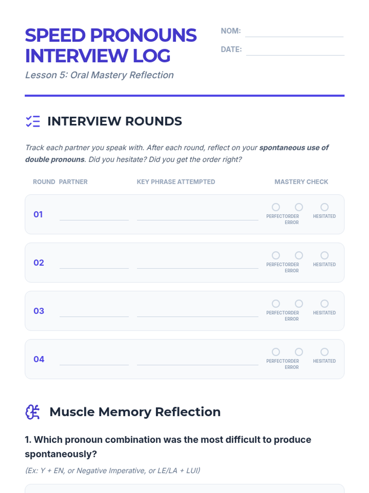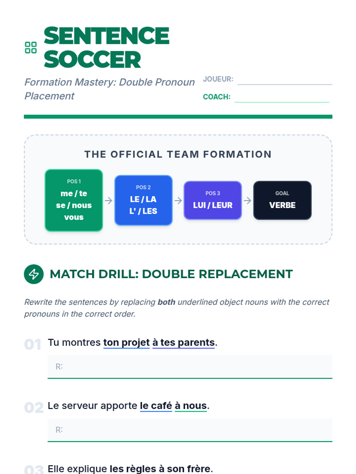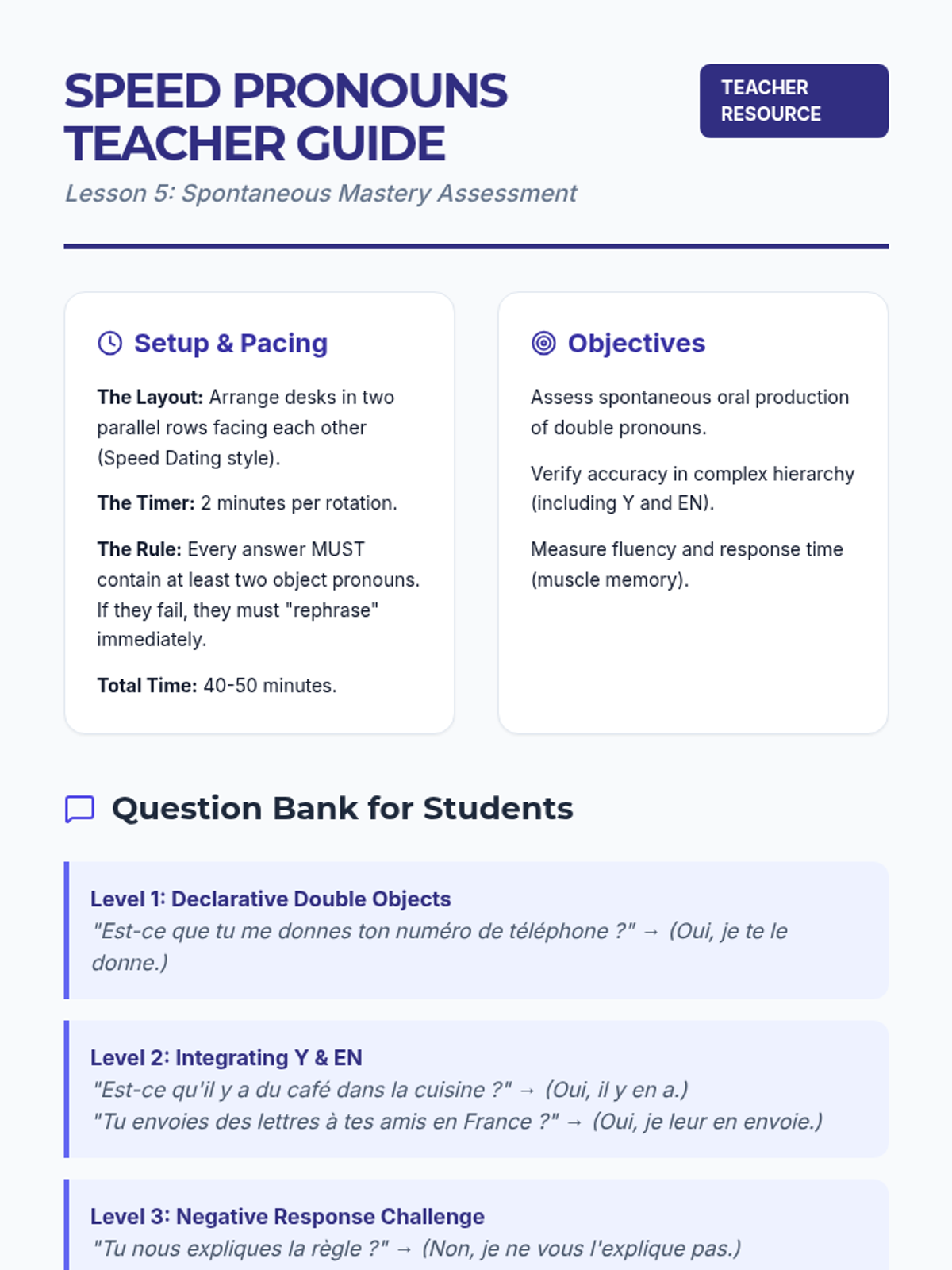 A comprehensive unit for 10th-grade French students to master the complex hierarchy and placement of double object pronouns, including adverbial pronouns 'y' and 'en' and imperative mood exceptions.
