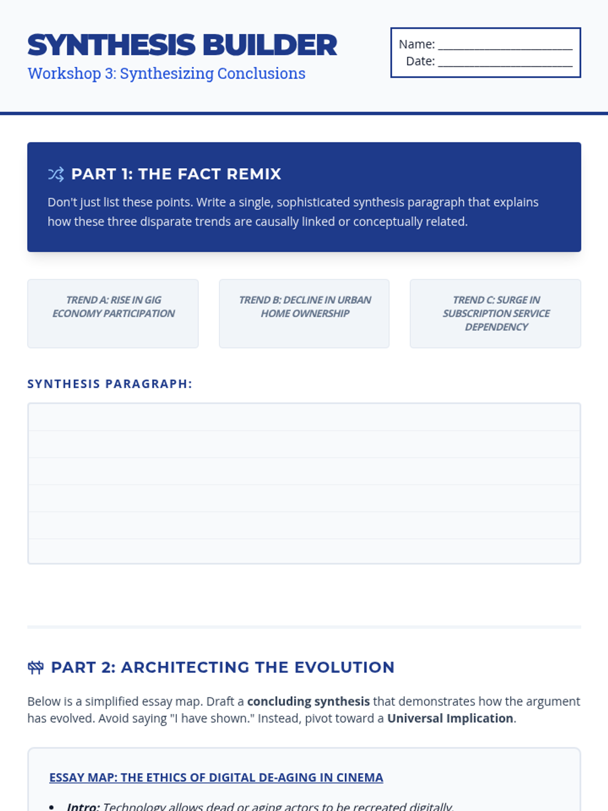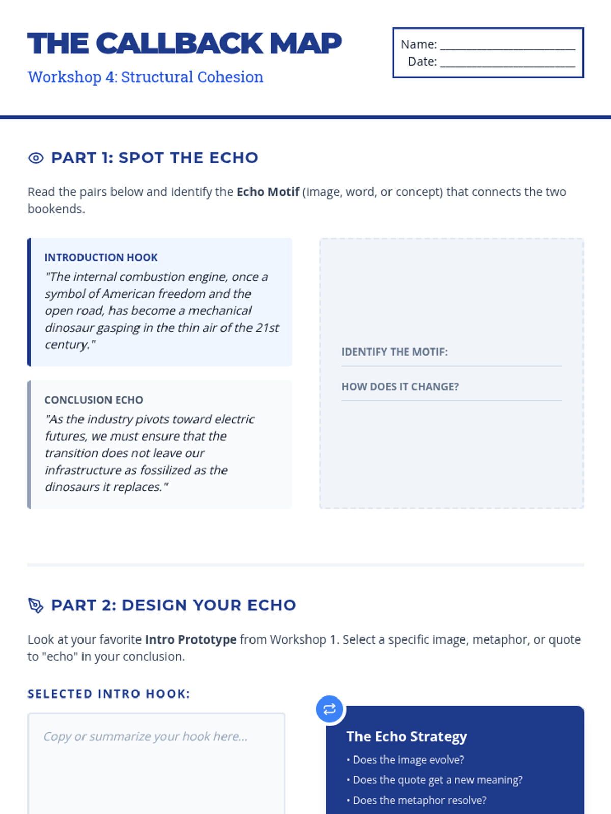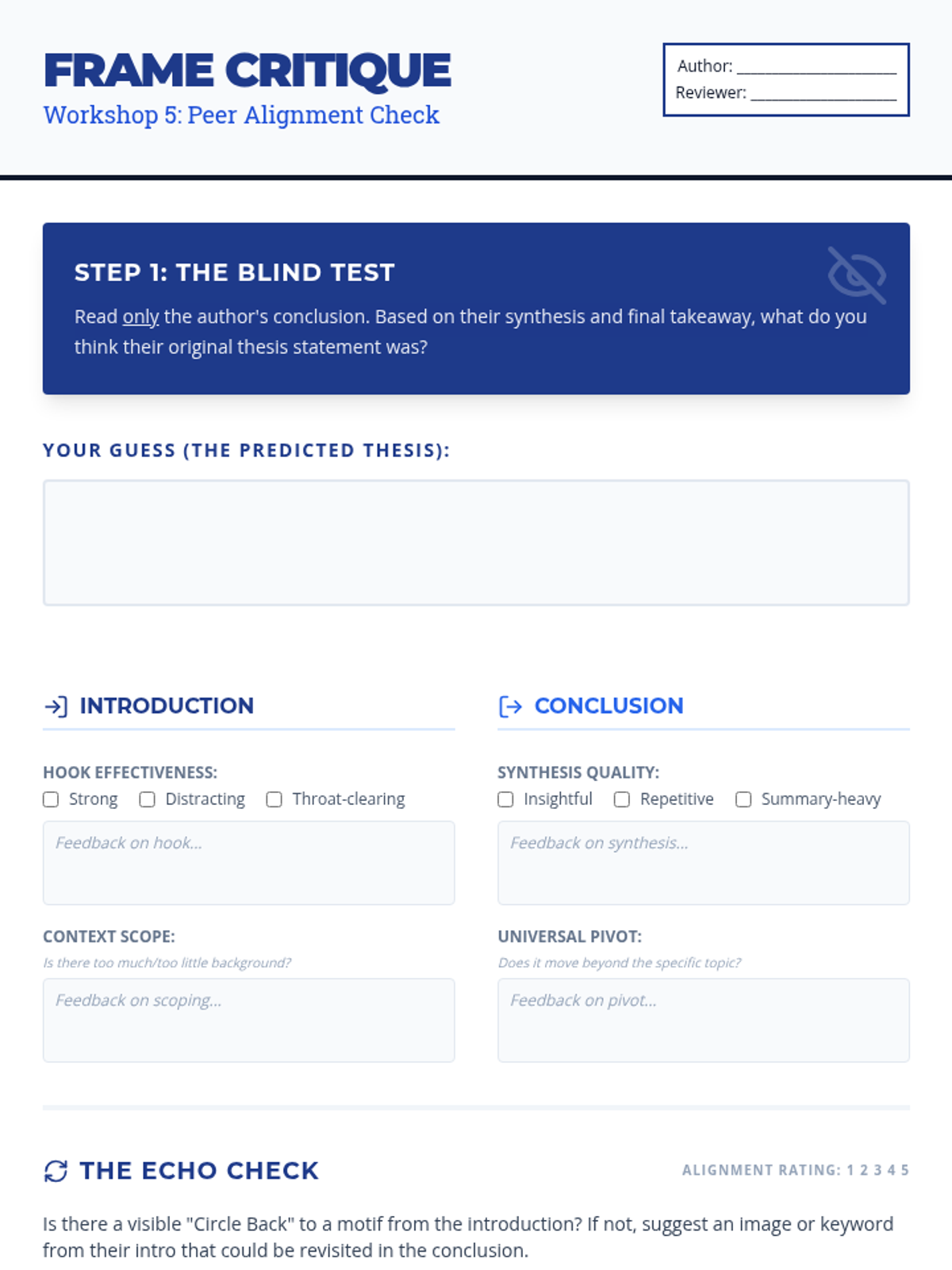 An intensive writing workshop sequence for undergraduate students focused on the structural 'bookends' of academic essays. Students move beyond formulaic templates to master sophisticated, rhetorical framing techniques for introductions and conclusions through rapid prototyping and peer critique.