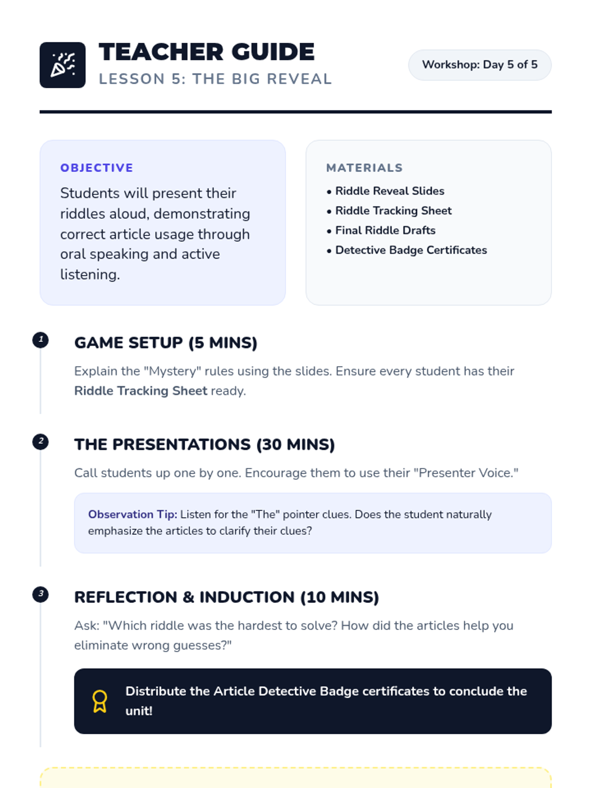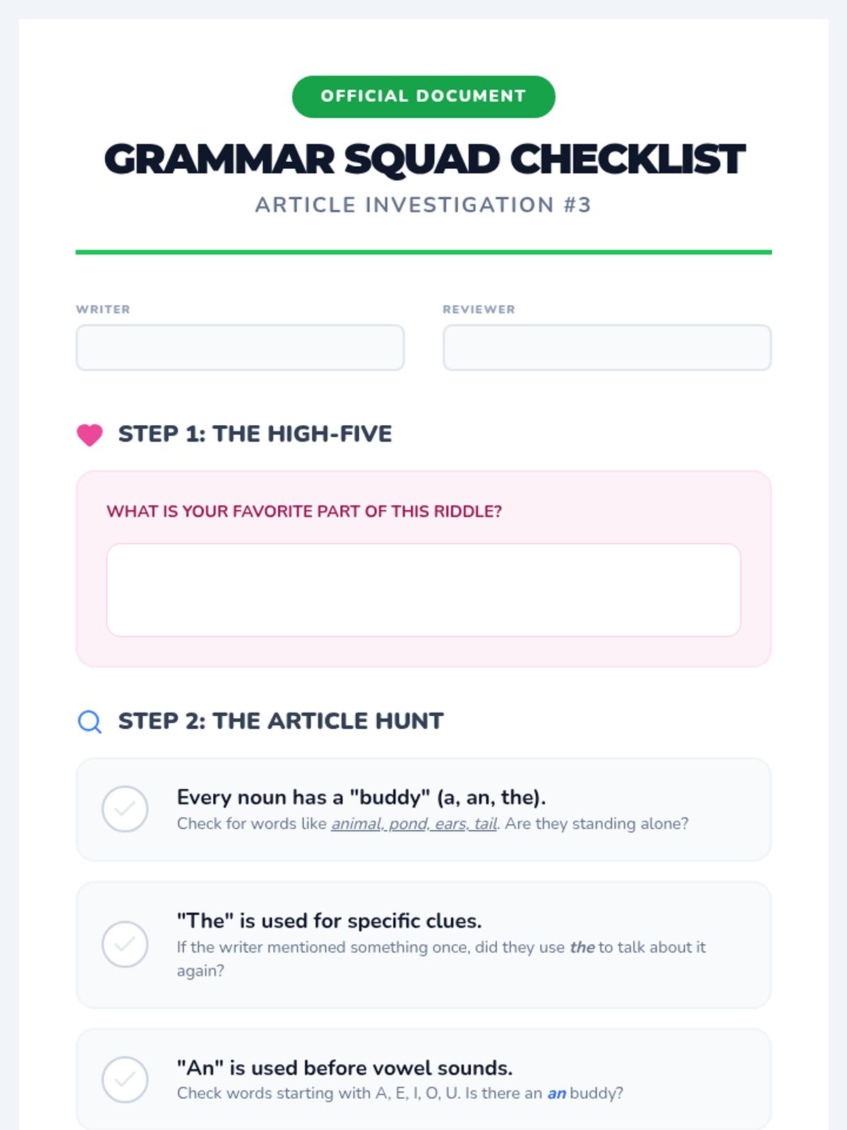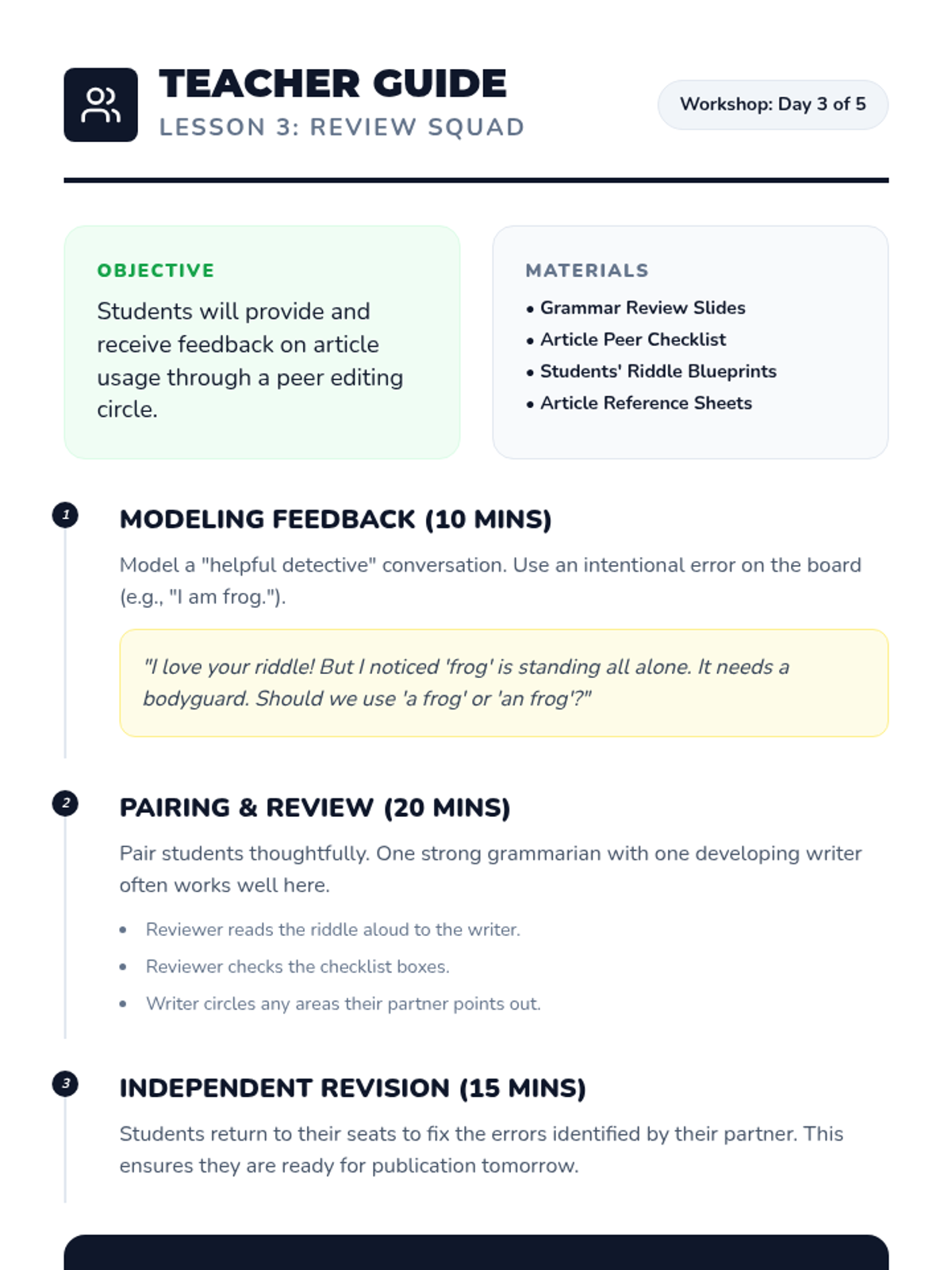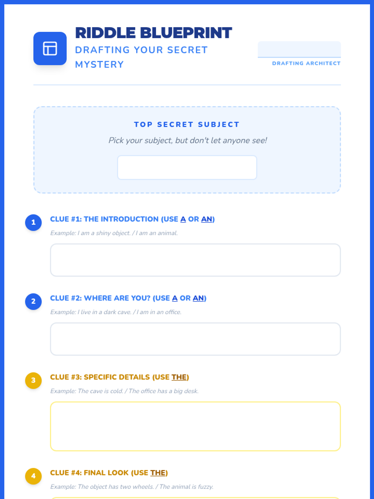 A 2nd-grade Writer's Workshop sequence where students learn to use articles (a, an, the) through the creation and sharing of descriptive 'Who Am I?' riddles. Students move from analyzing mentor texts to drafting, peer editing, and publishing their work with a focus on grammar accuracy.