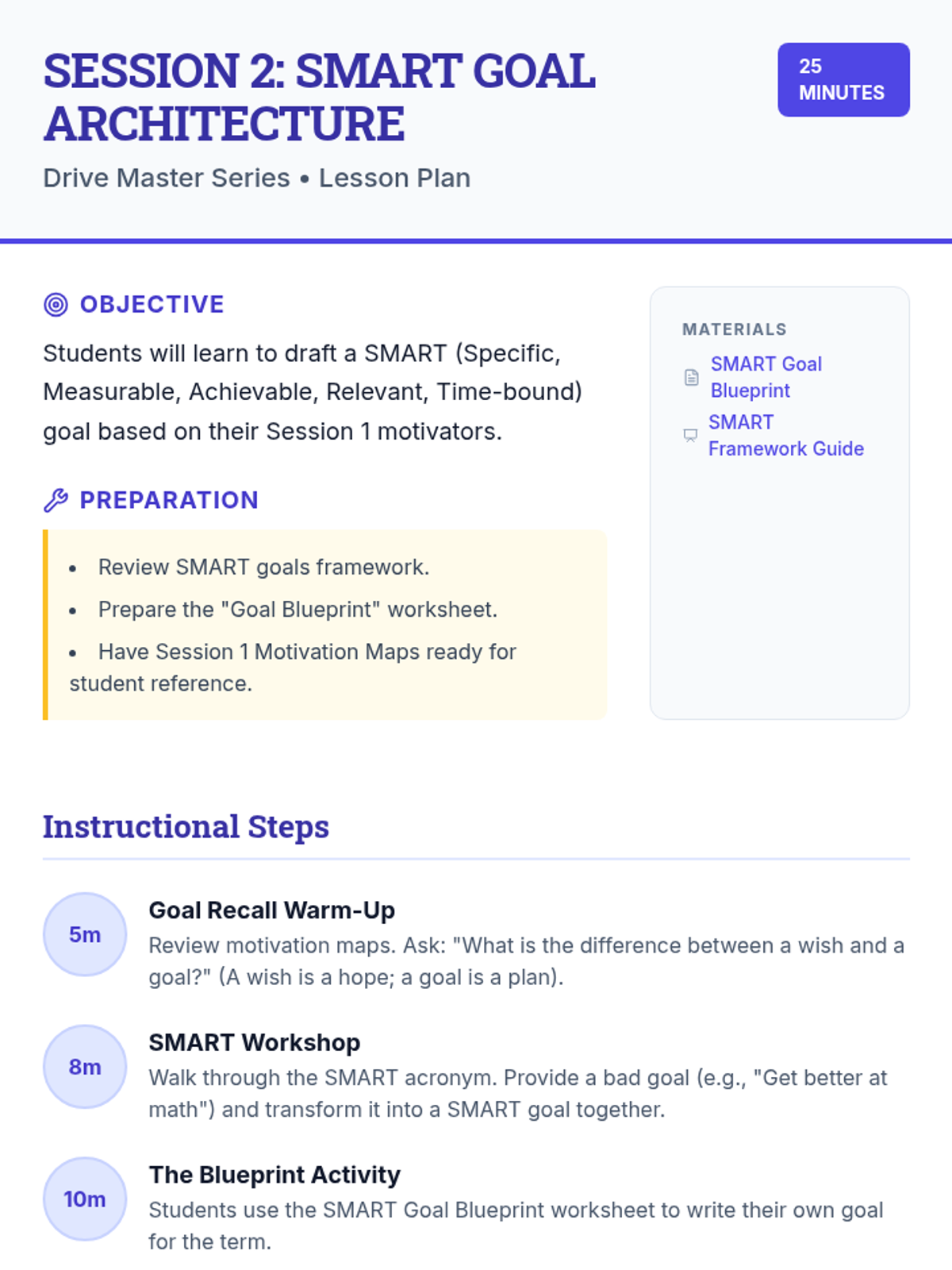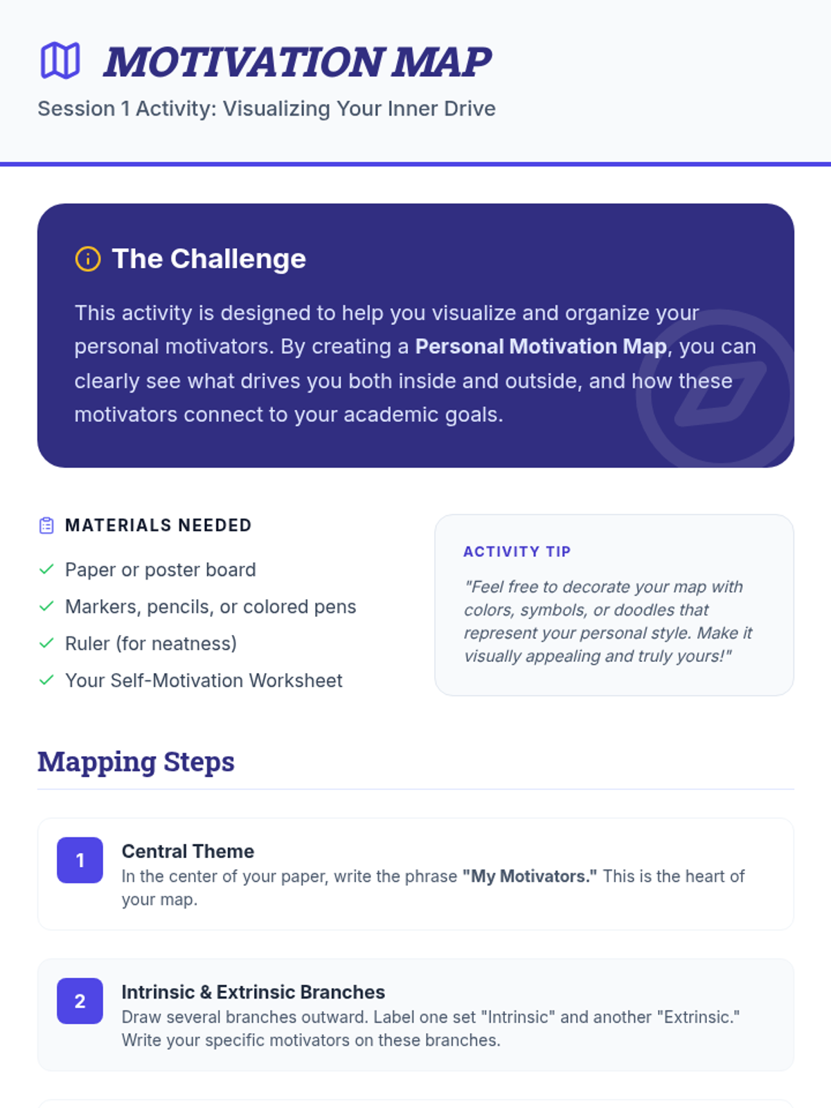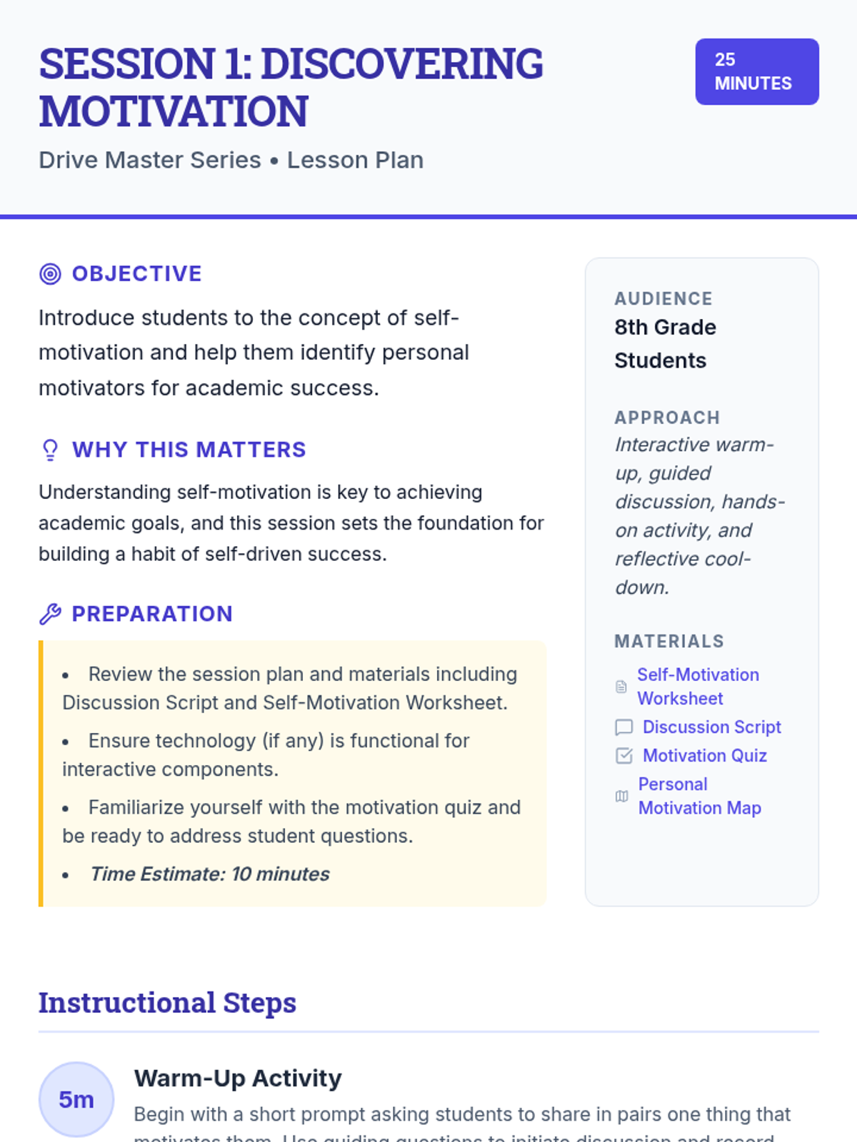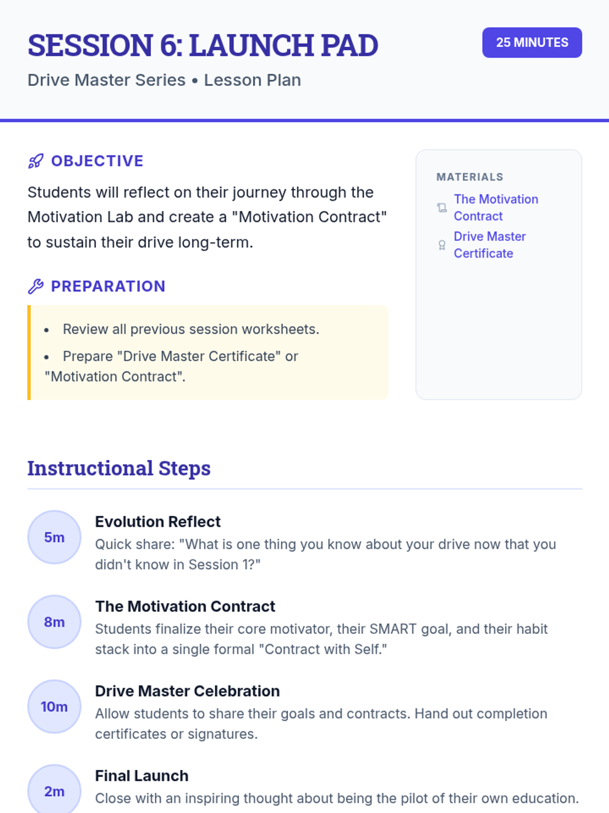 A comprehensive 6-session series designed for 8th-grade students to explore and enhance self-motivation. Students develop goal-setting skills, learn to overcome obstacles, and build habits that support long-term academic success through interactive workshops and personal reflection.