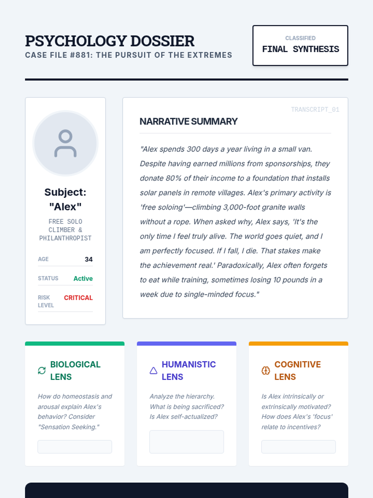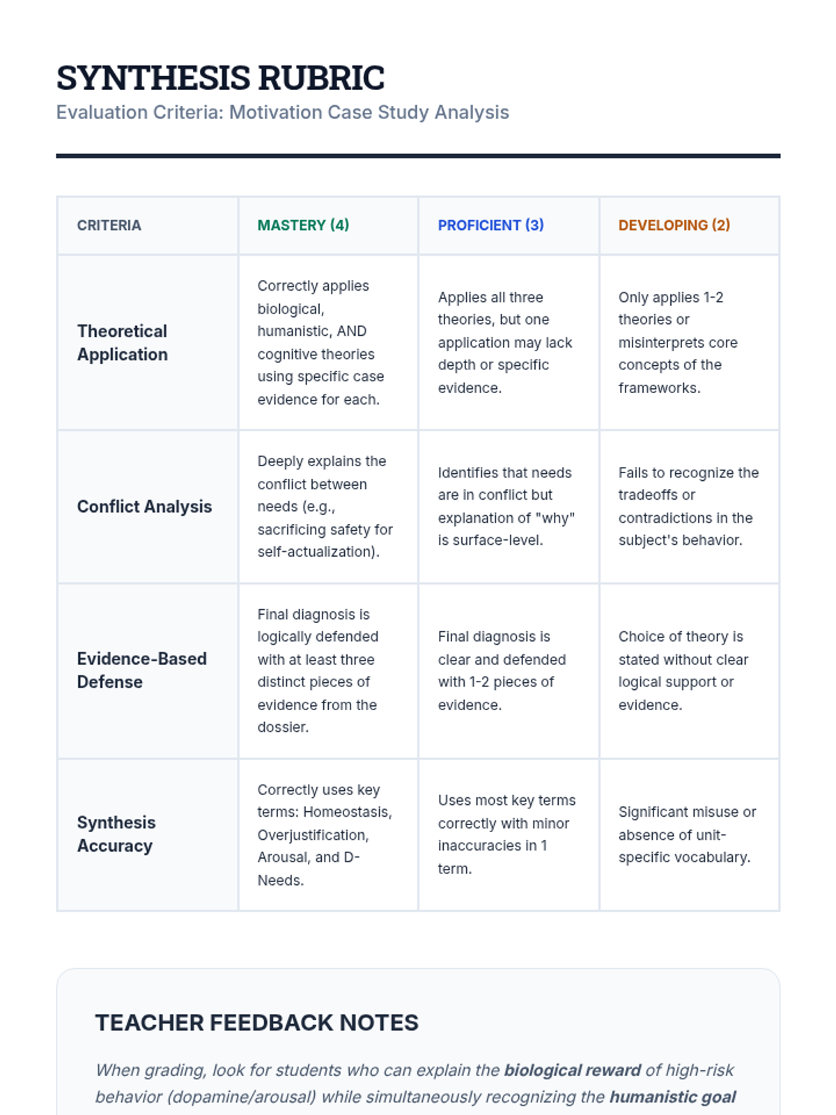 A comprehensive 11th-grade psychology unit exploring biological, humanistic, and cognitive theories of motivation. Students investigate what drives human behavior, from basic physiological needs to complex self-actualization and the impact of external rewards.
