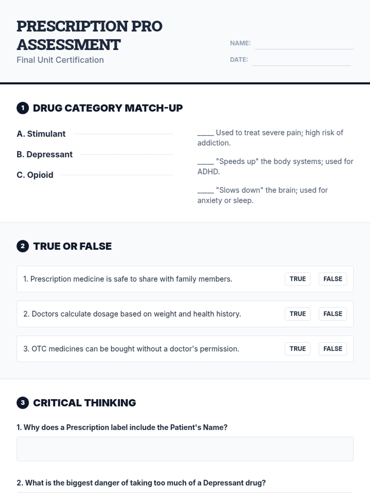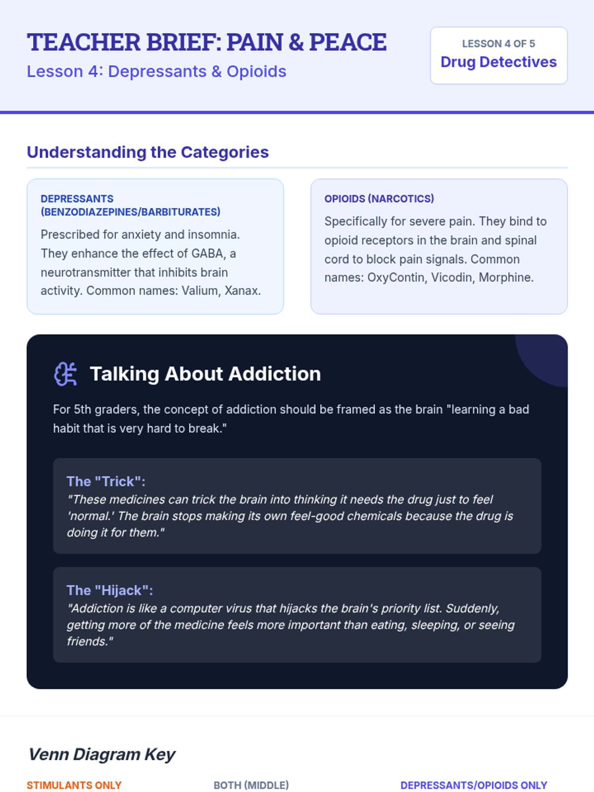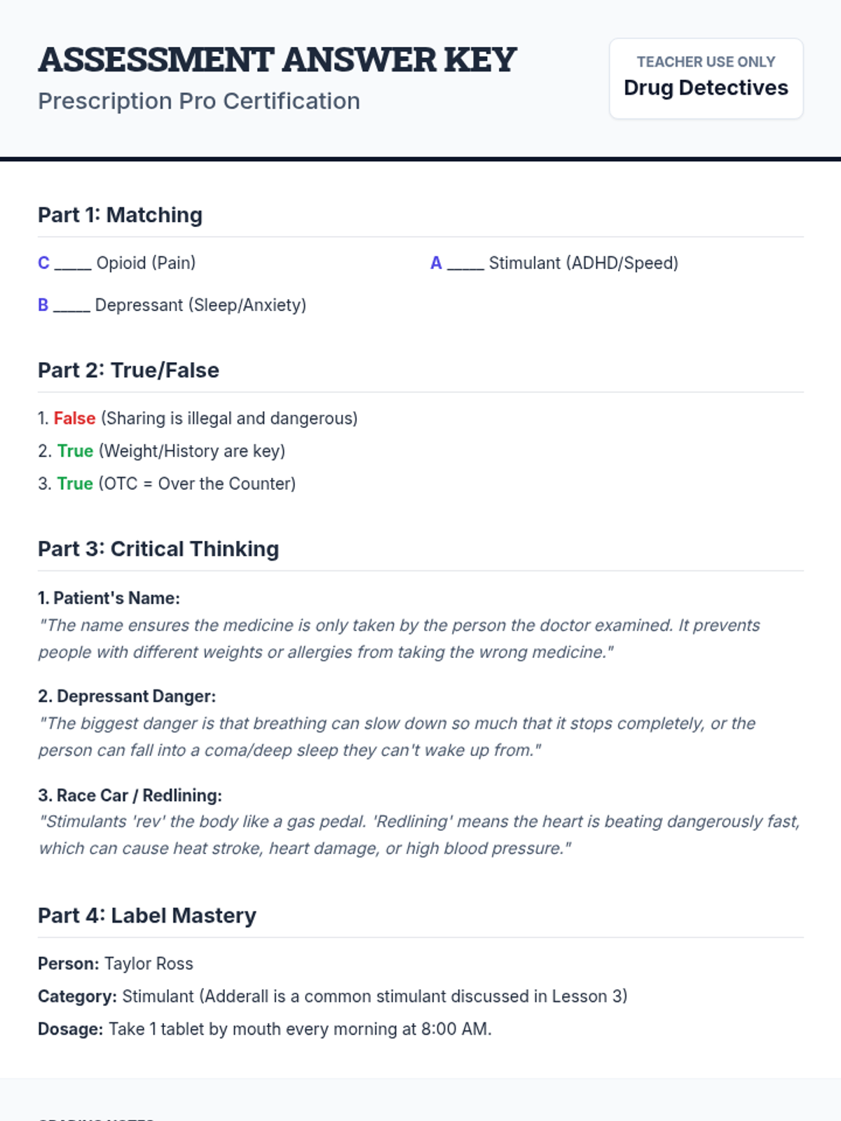 This sequence introduces 5th-grade students to the differences between OTC and Prescription medications, the role of doctors in prescribing, and the categorization of drugs into stimulants, depressants, and opioids. It emphasizes health literacy, safety, and the risks of misuse.