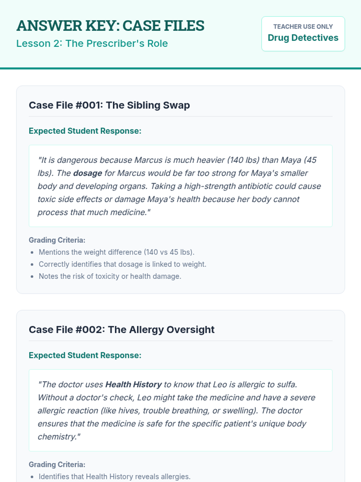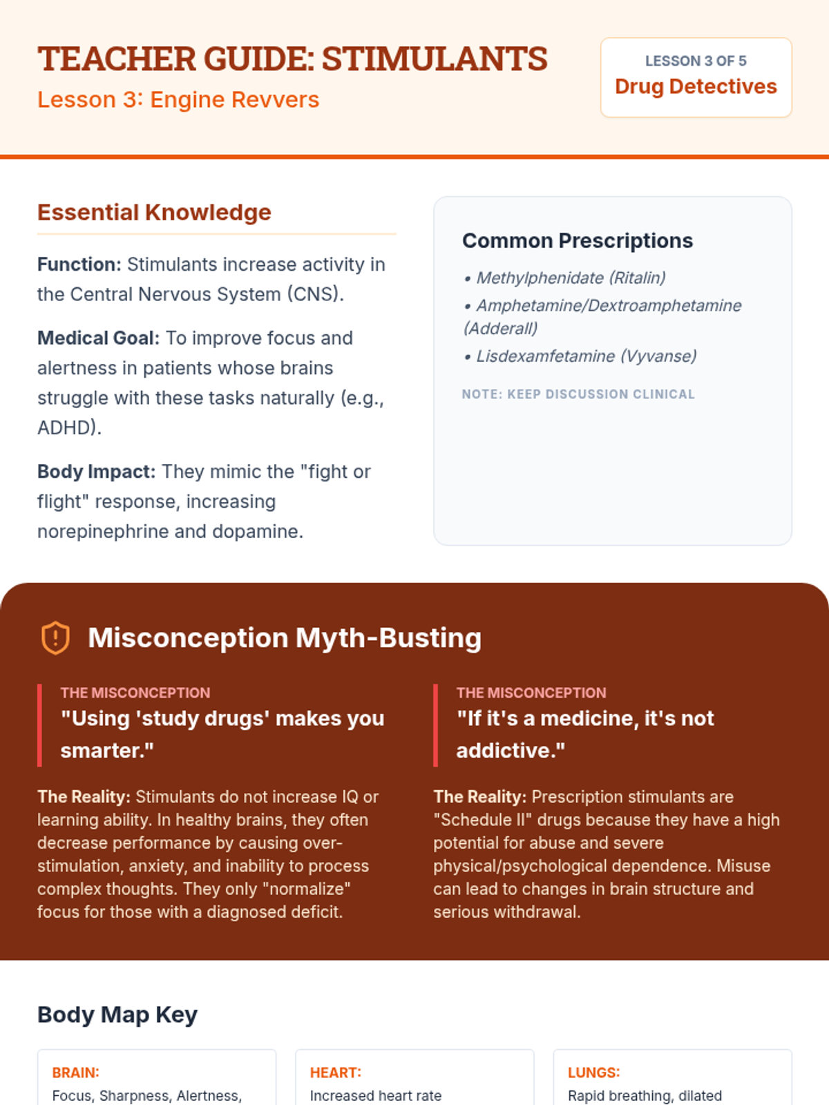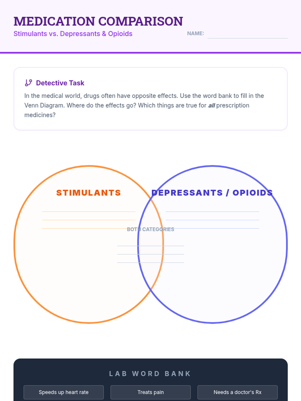 This sequence introduces 5th-grade students to the differences between OTC and Prescription medications, the role of doctors in prescribing, and the categorization of drugs into stimulants, depressants, and opioids. It emphasizes health literacy, safety, and the risks of misuse.