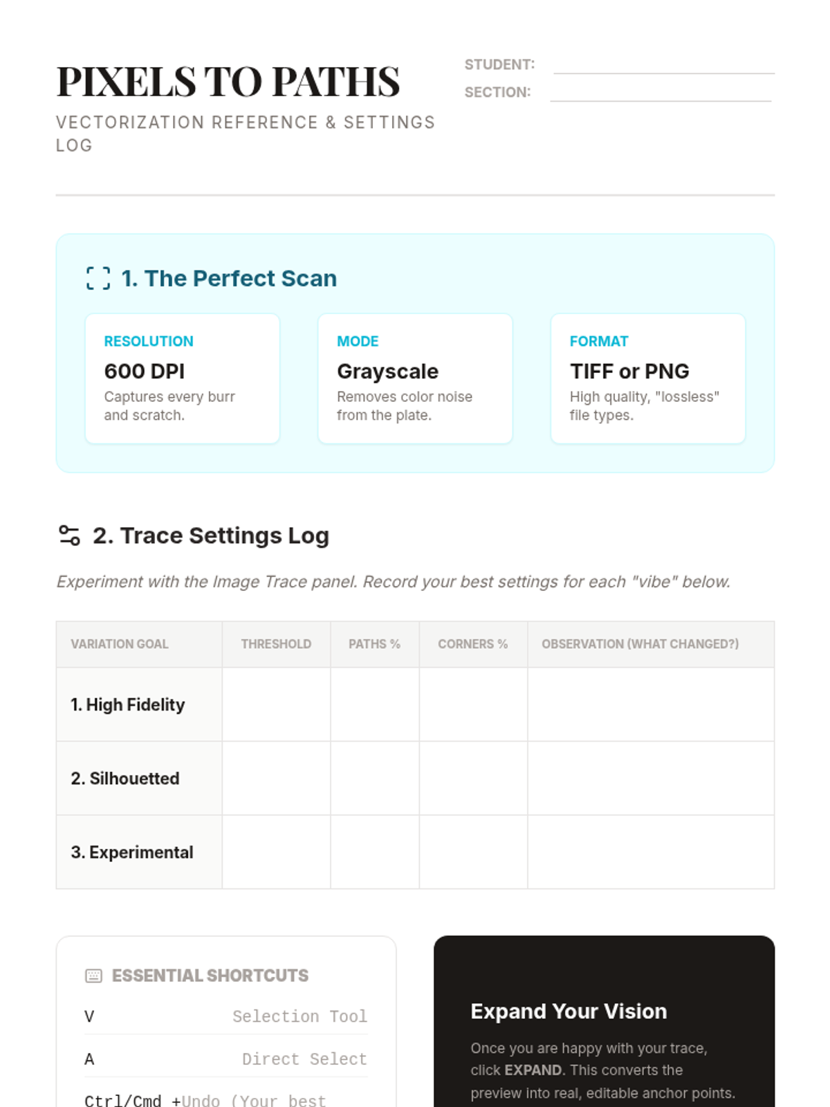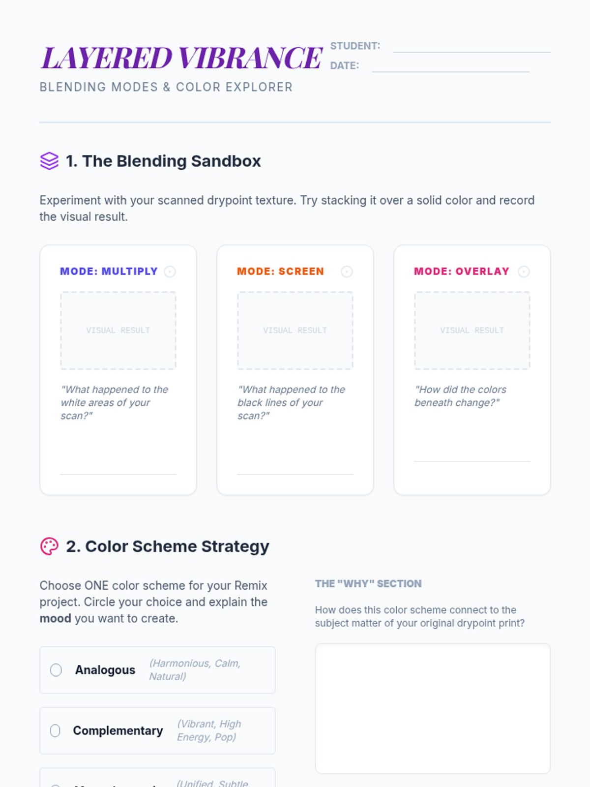 A hybrid printmaking and graphic design sequence for 7th graders, bridging traditional drypoint intaglio etching with modern digital layout and vectorization techniques. Students move from tactile scratching on plexiglass to sophisticated digital compositions.