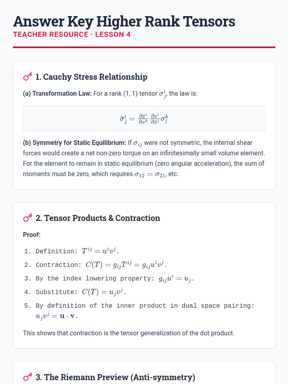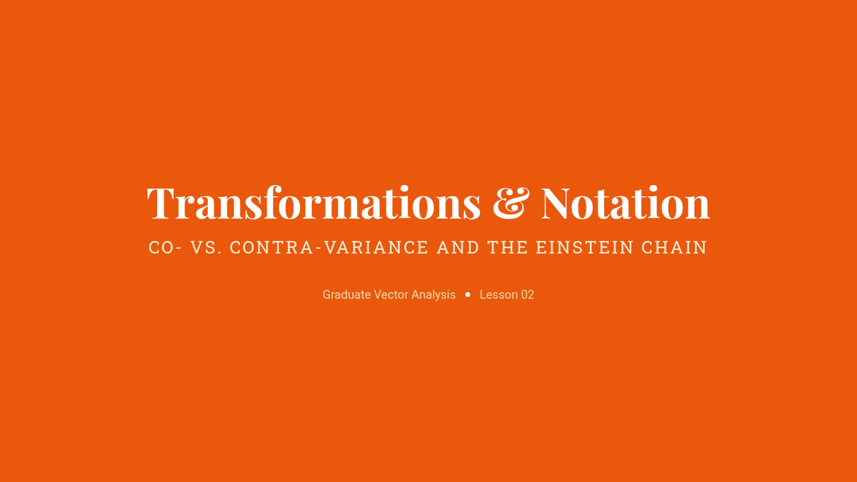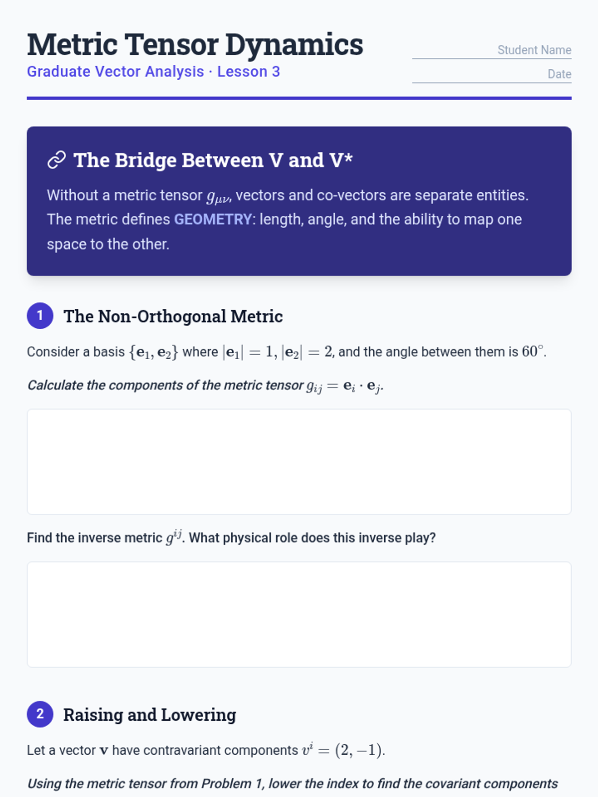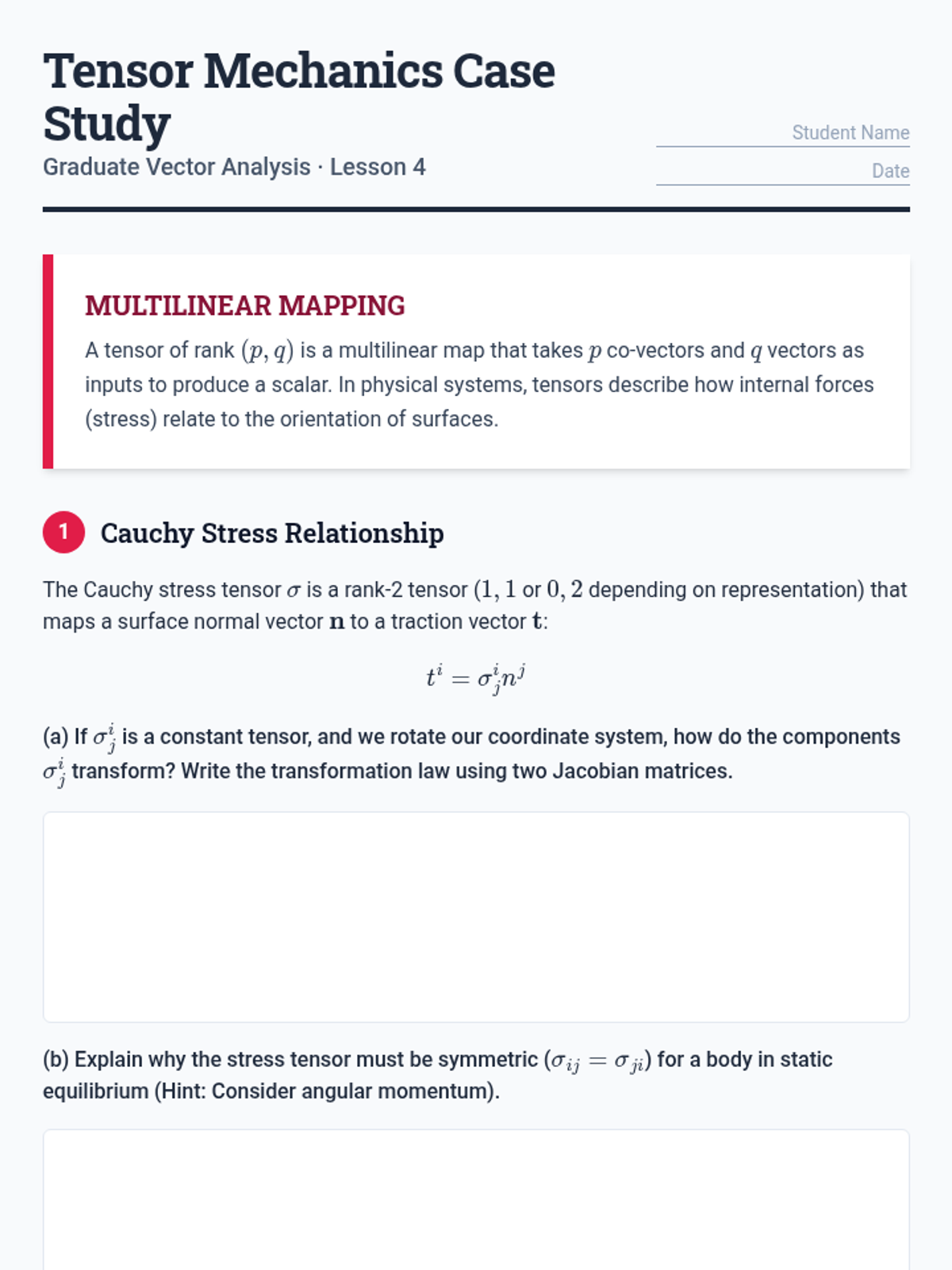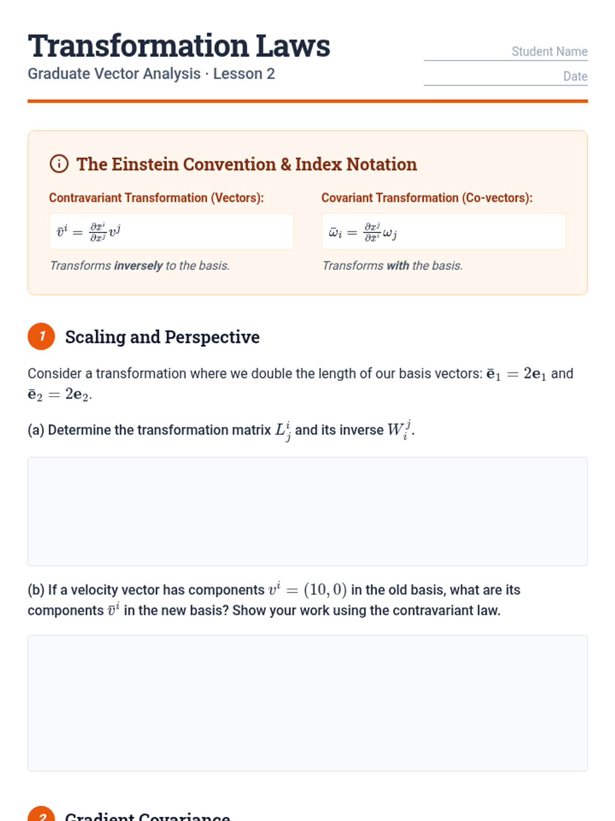 This graduate-level sequence explores the distinction between contravariant vectors and covariant co-vectors within the framework of dual spaces, metric tensors, and higher-rank tensor transformations. Students move from rigorous linear algebra definitions to applications in non-Euclidean geometry and physical systems like stress and strain.