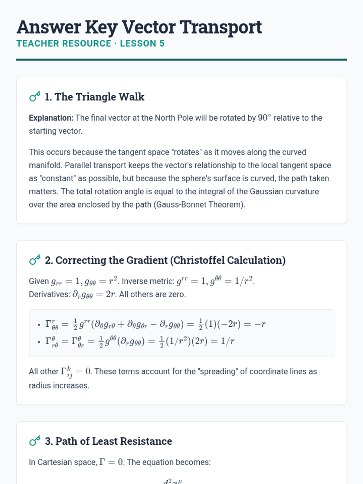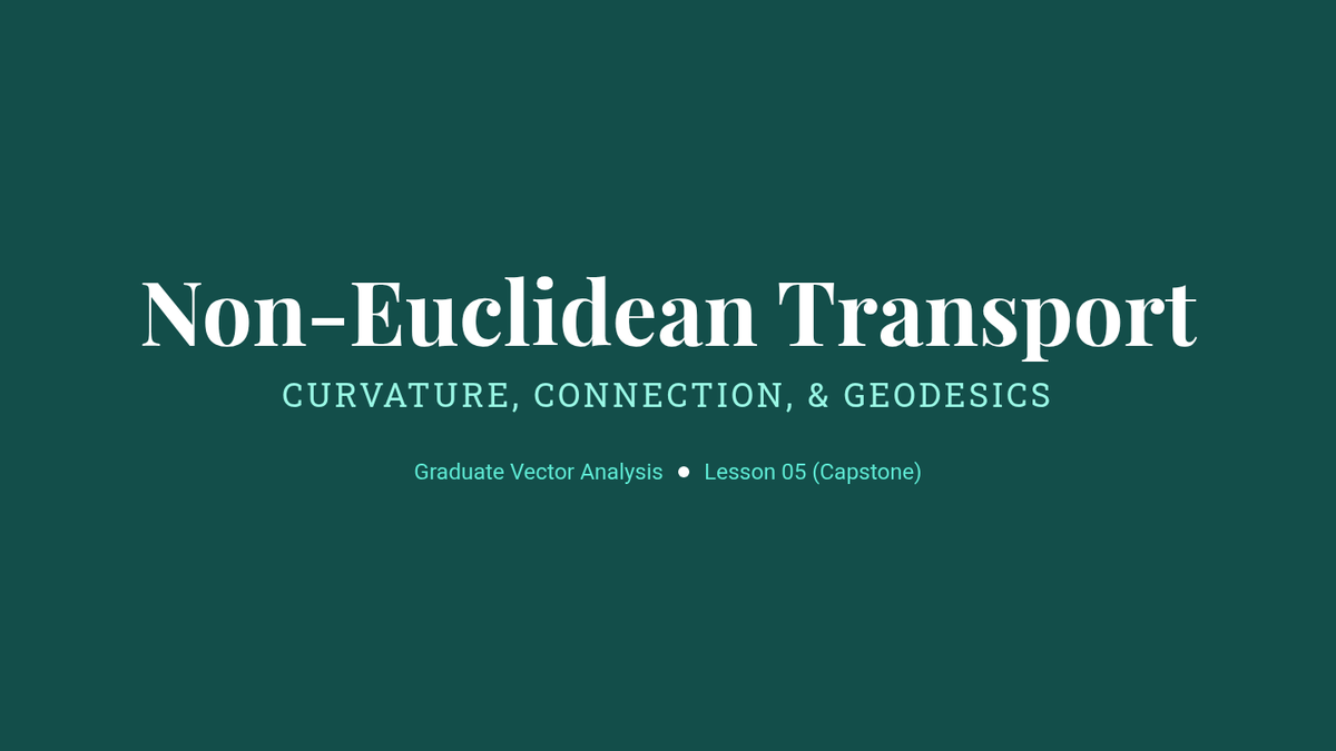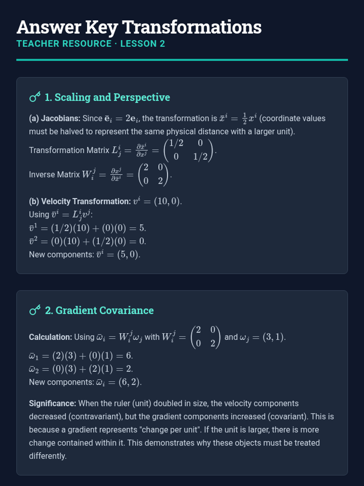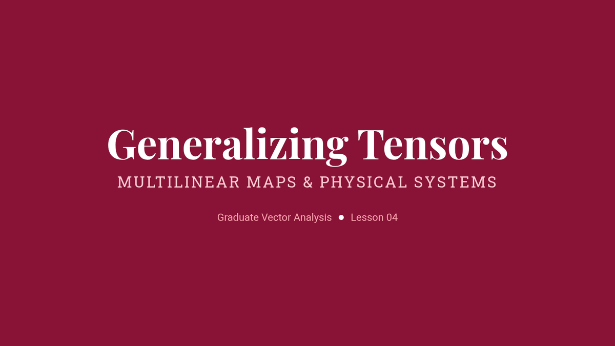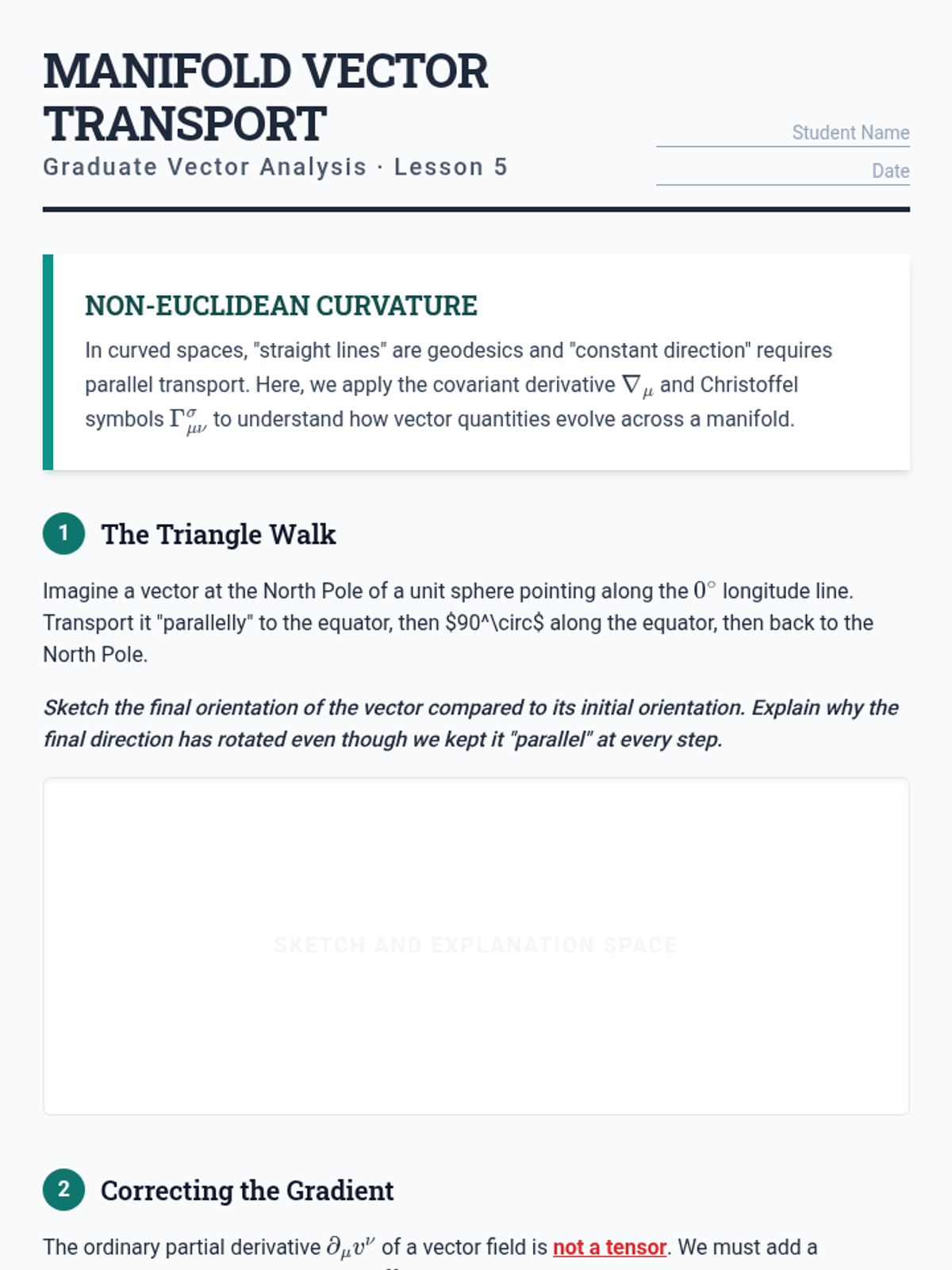 This graduate-level sequence explores the distinction between contravariant vectors and covariant co-vectors within the framework of dual spaces, metric tensors, and higher-rank tensor transformations. Students move from rigorous linear algebra definitions to applications in non-Euclidean geometry and physical systems like stress and strain.