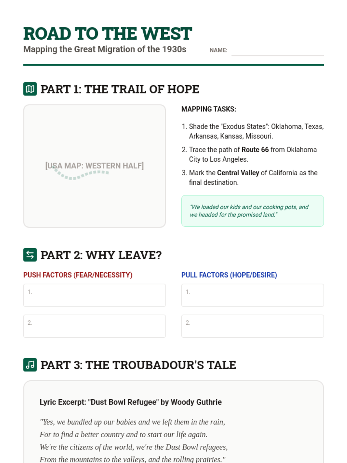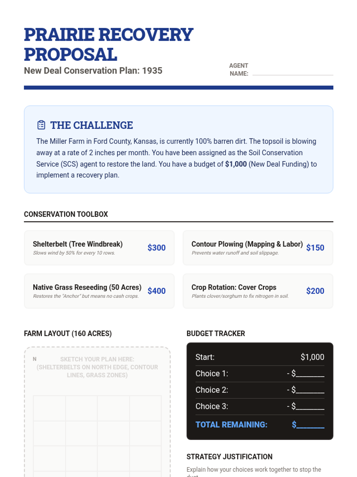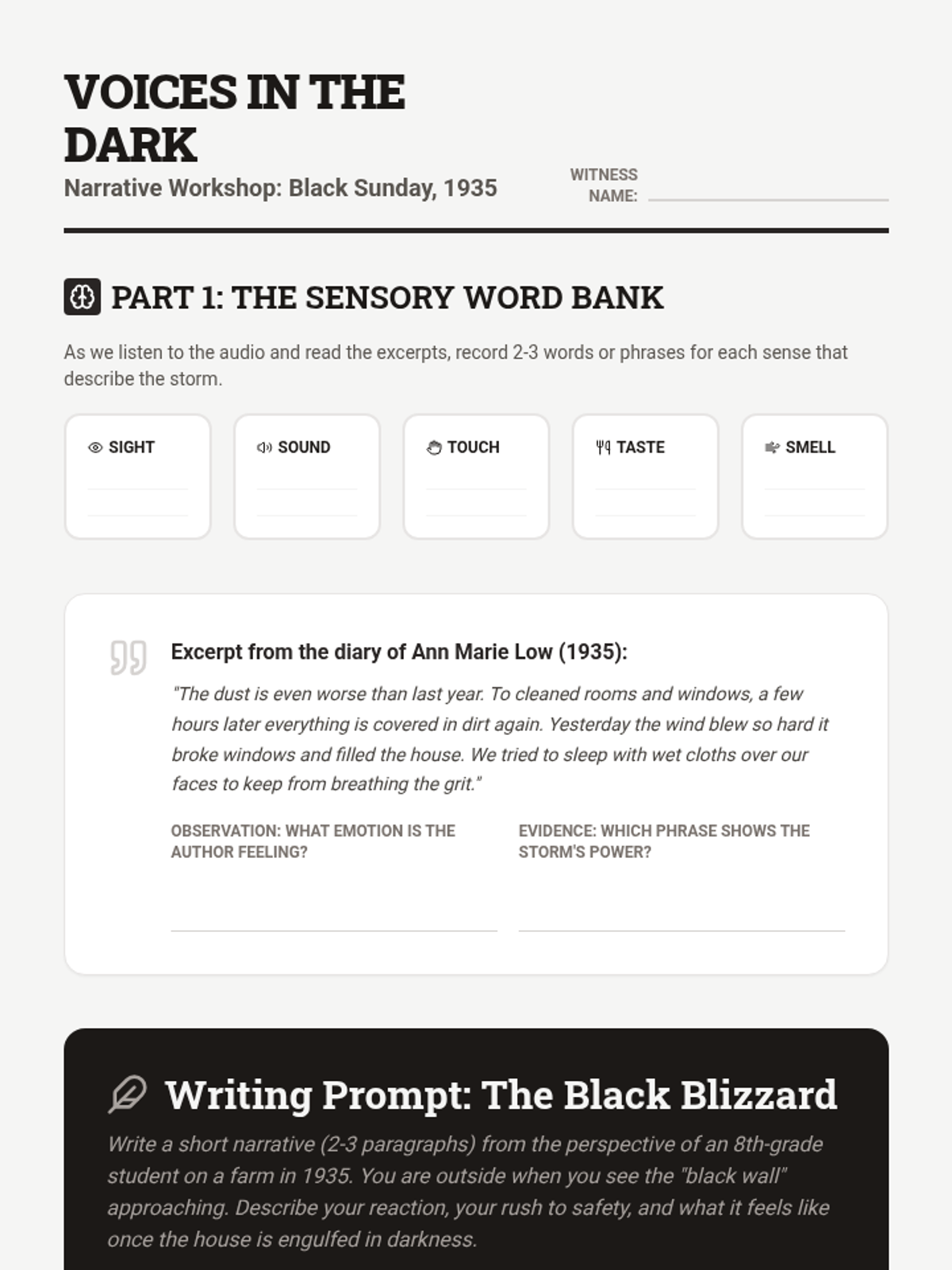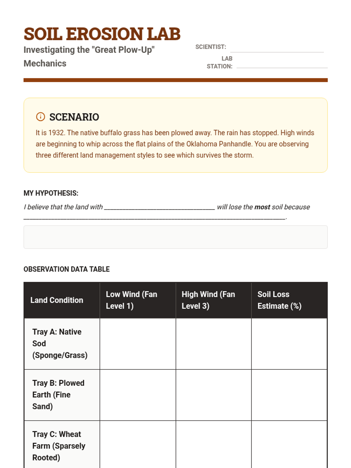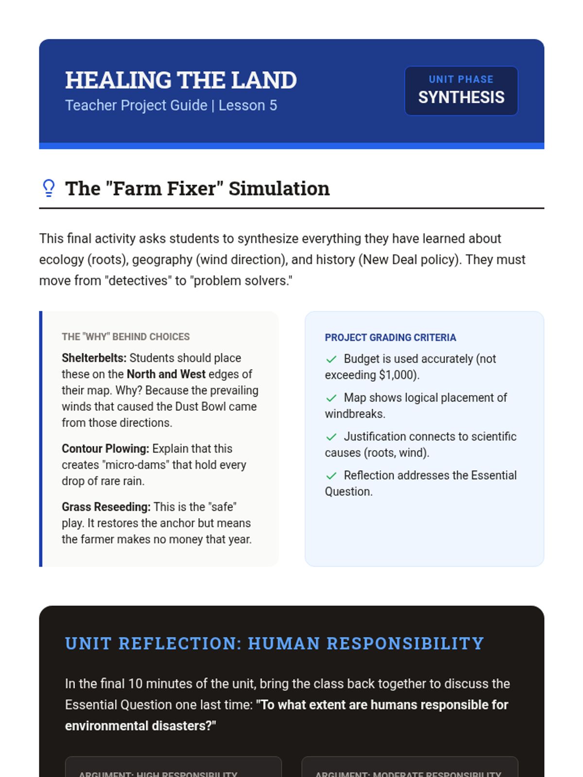 A project-based unit exploring the Dust Bowl as a man-made and natural disaster. Students investigate ecological causes, the intensity of storms, mass migration, and New Deal conservation efforts.