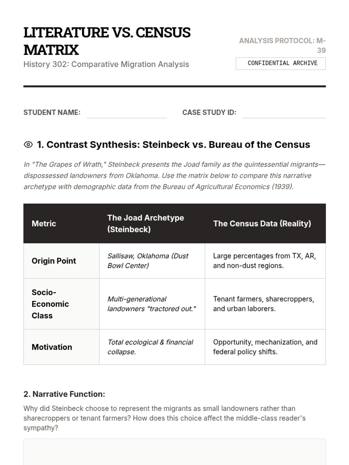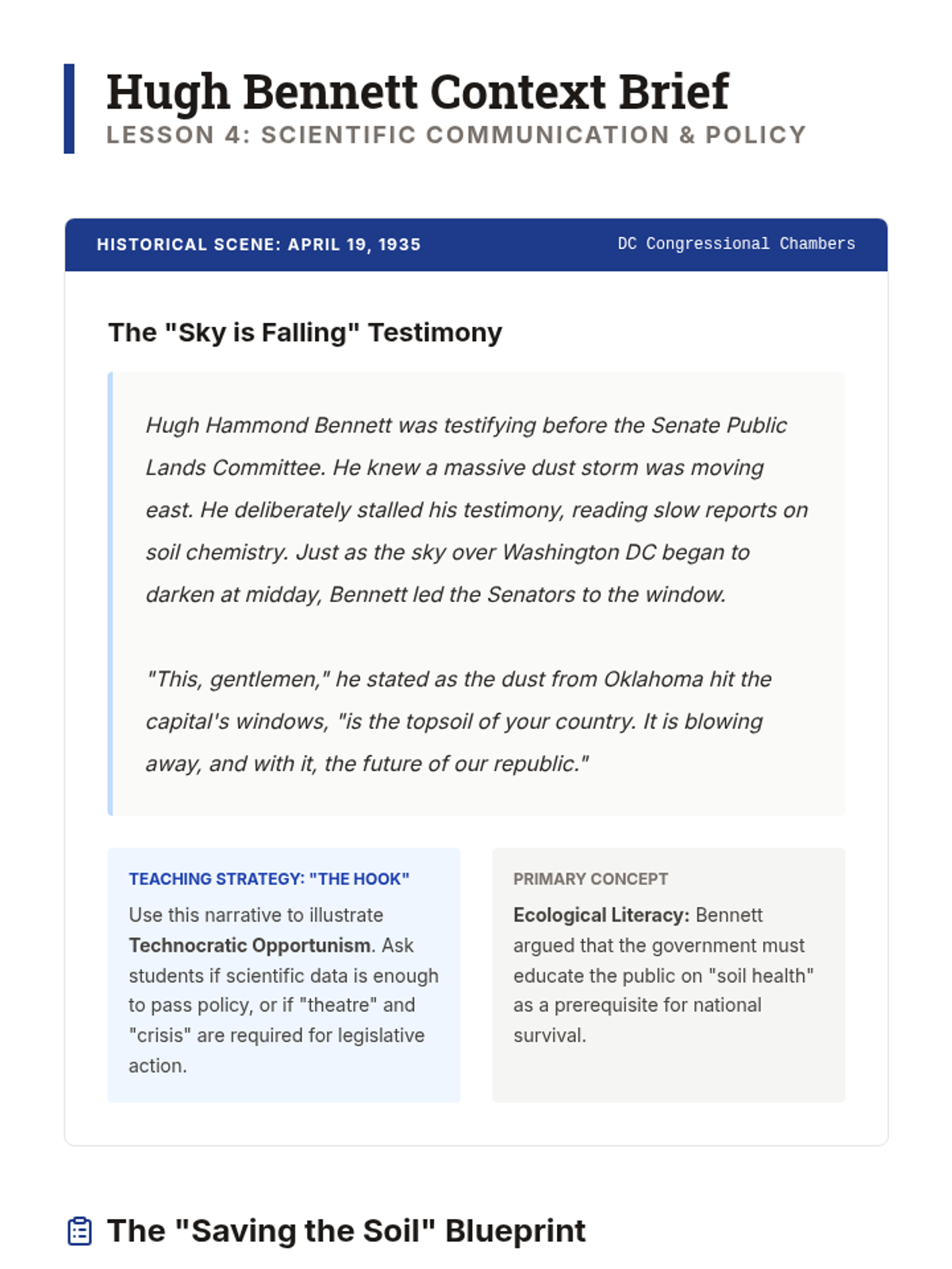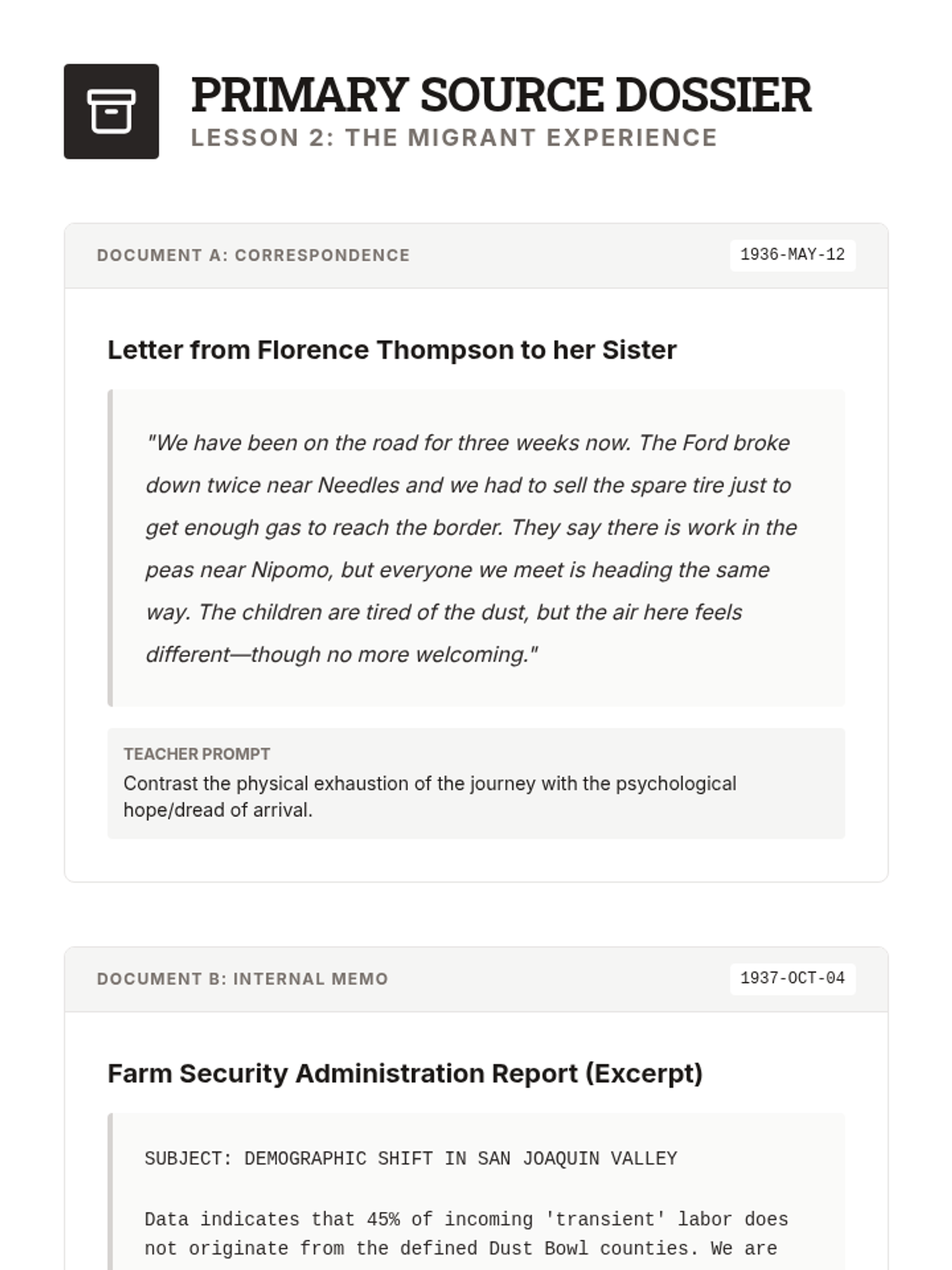 This sequence examines the human and environmental costs of the Dust Bowl during the Great Depression. Students investigate how agricultural mismanagement and climate change triggered mass migration, social conflict in the West, and a transformative federal response in soil conservation.