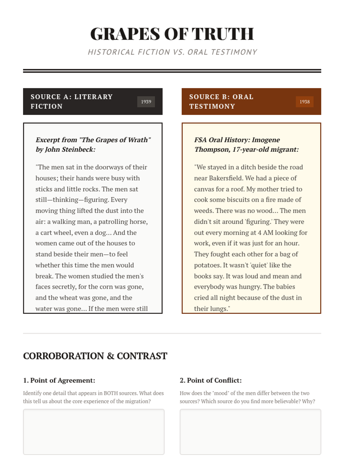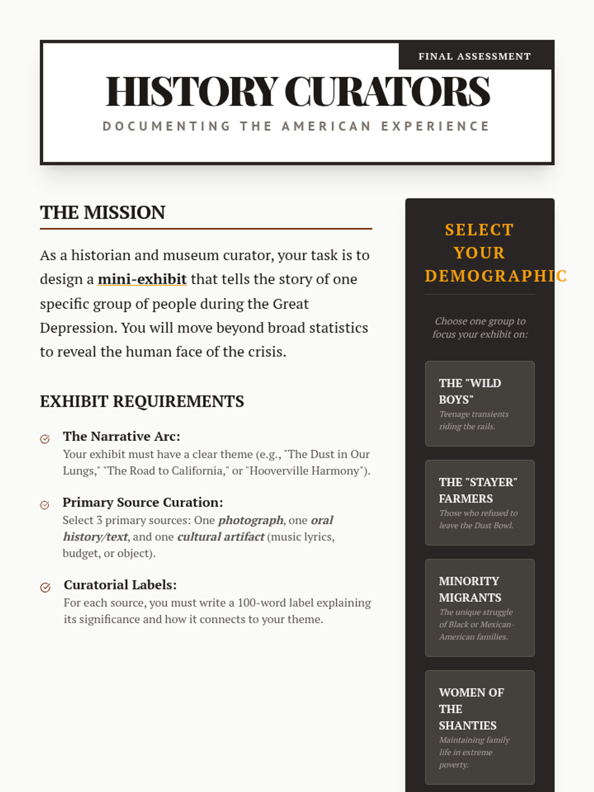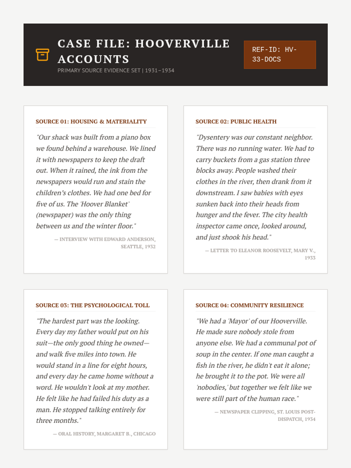 This sequence explores the human experience of the Great Depression through the lens of the Dust Bowl and social displacement. Students analyze photography, oral histories, and folk music to understand how environmental and economic collapse reshaped American identity.