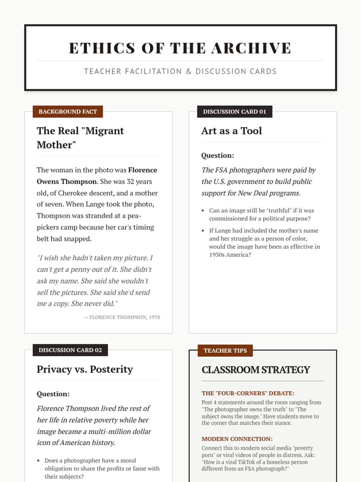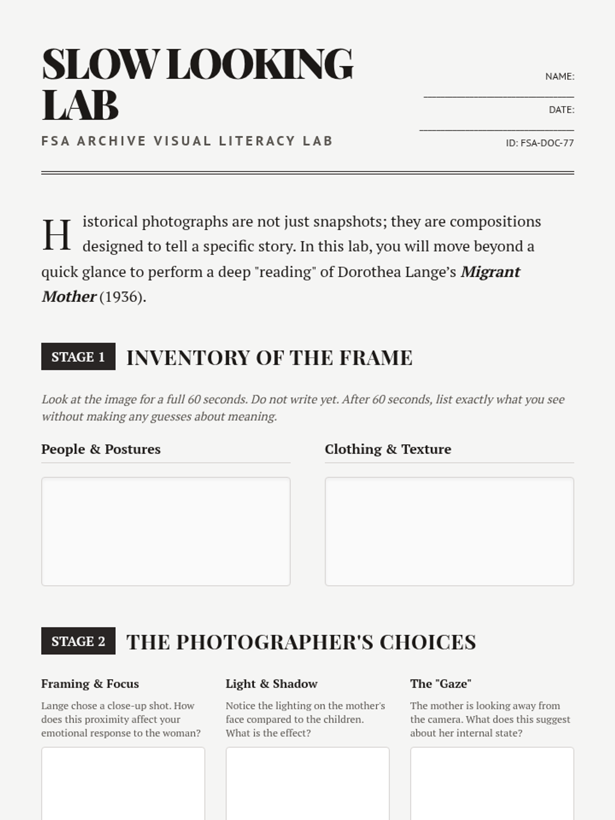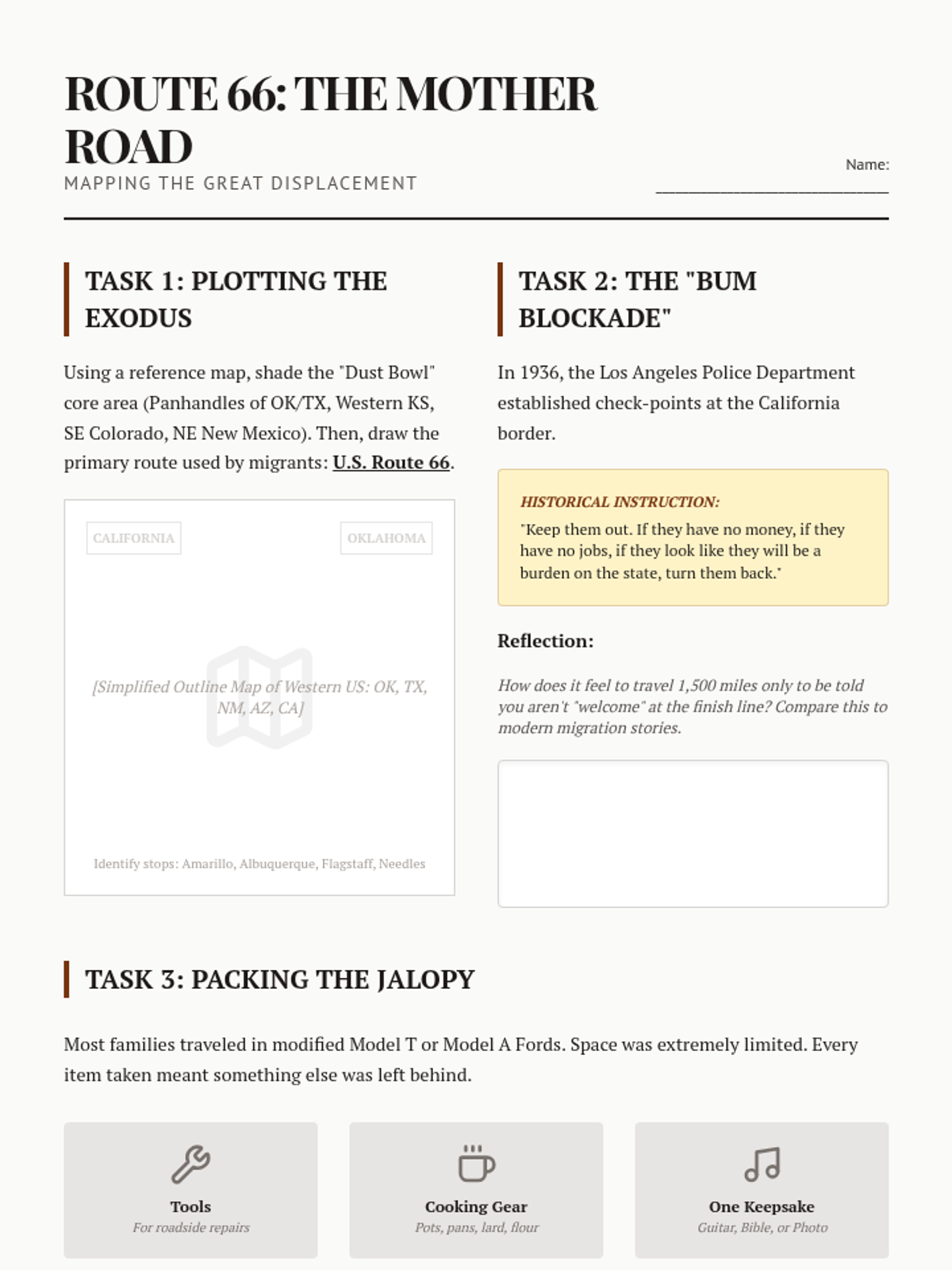 This sequence explores the human experience of the Great Depression through the lens of the Dust Bowl and social displacement. Students analyze photography, oral histories, and folk music to understand how environmental and economic collapse reshaped American identity.