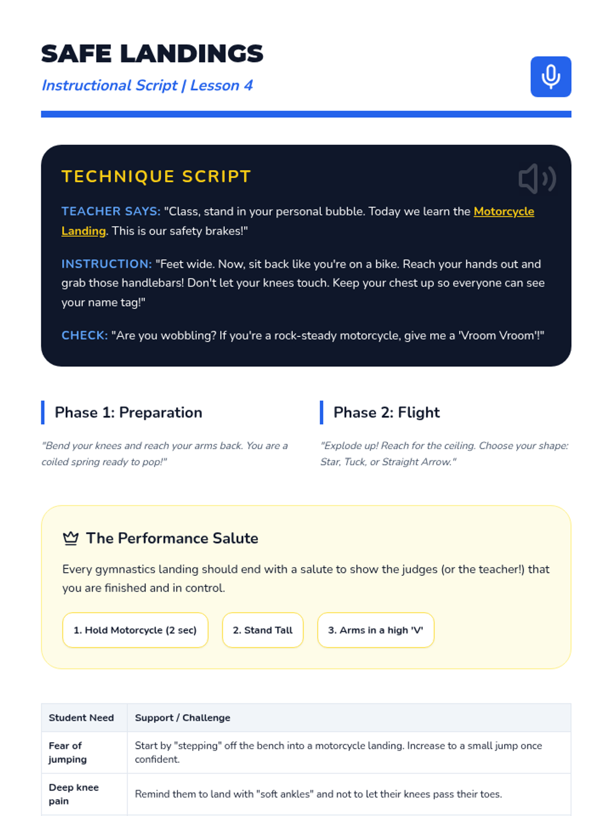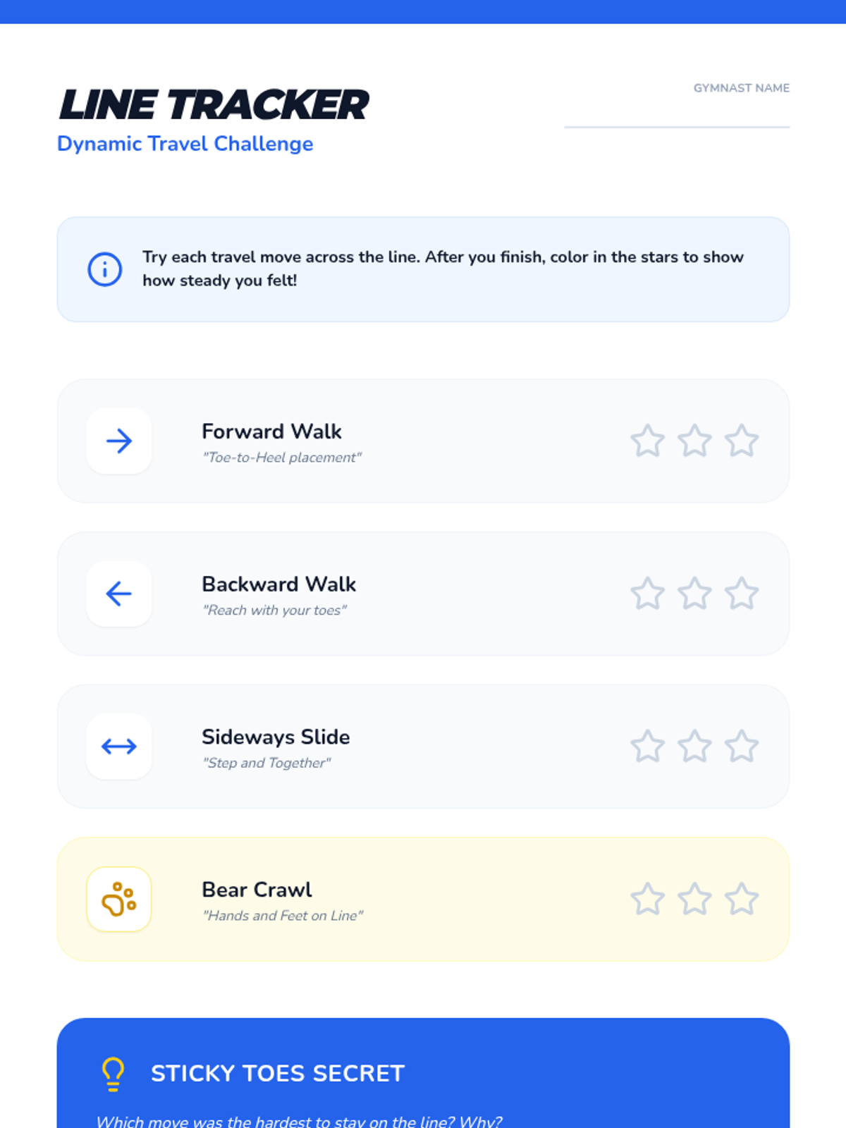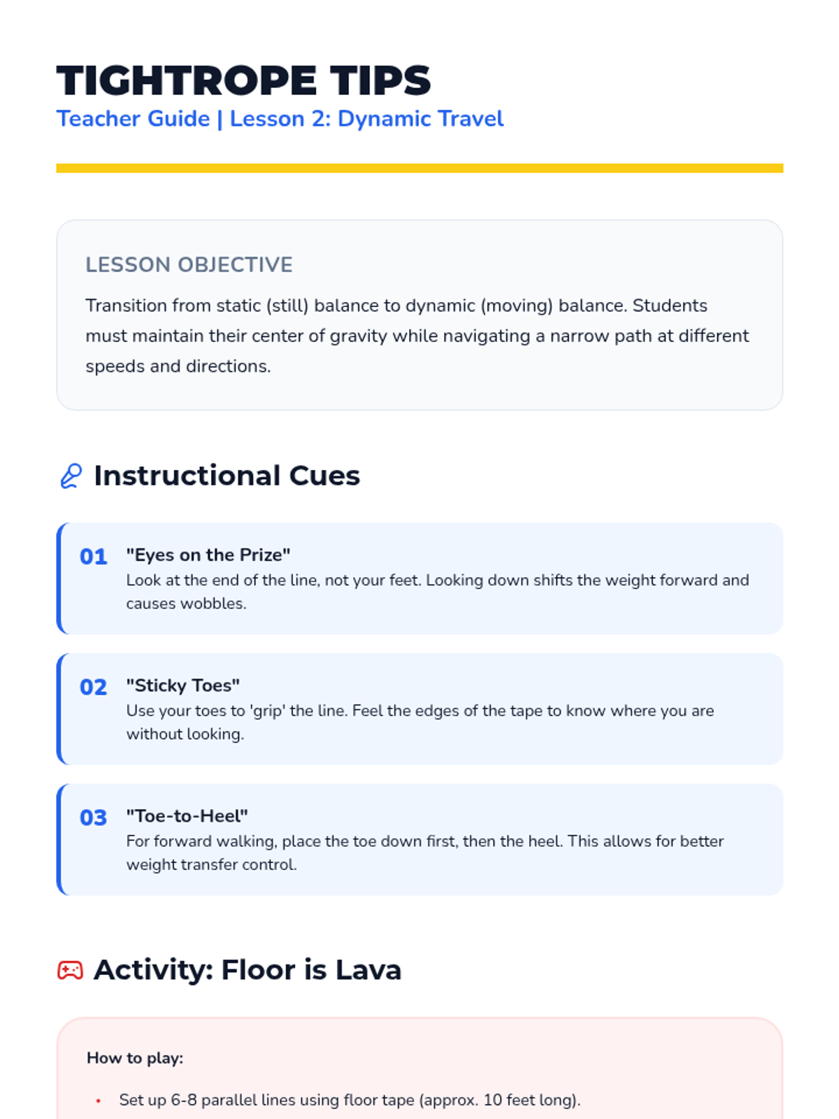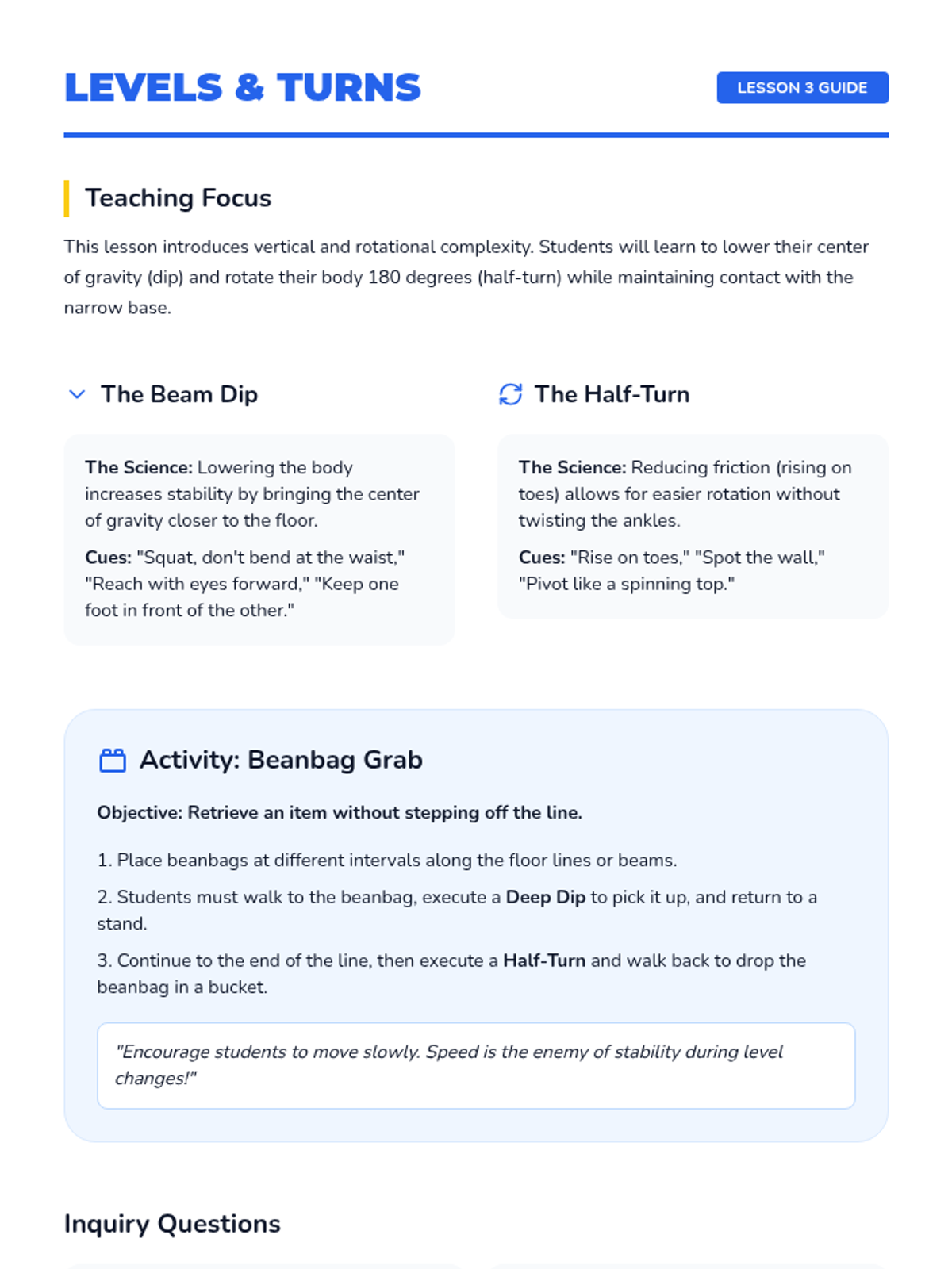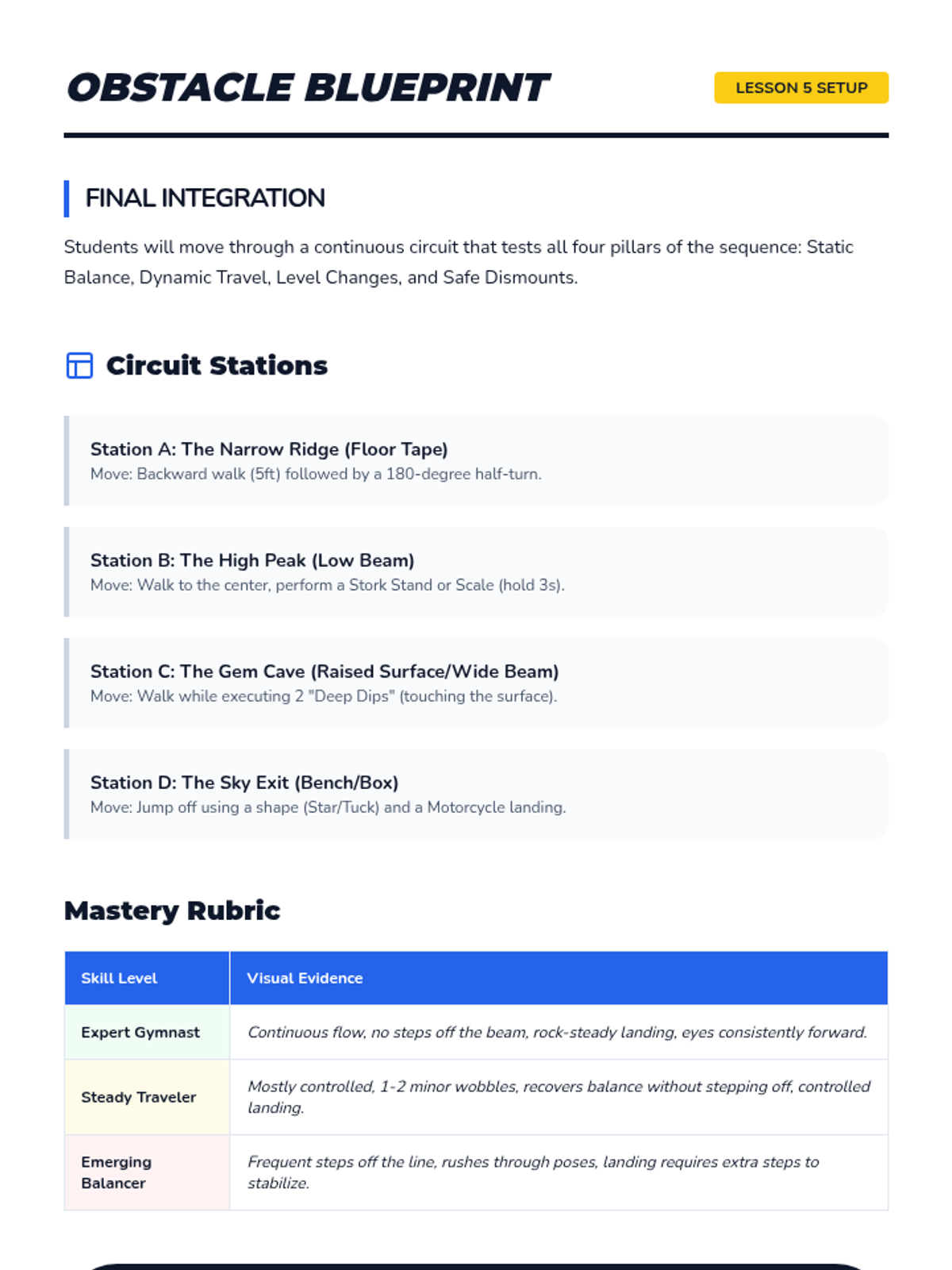A 2nd-grade gymnastics sequence focused on developing stability, core strength, and confidence on elevated surfaces or narrow lines. Students explore static balances, dynamic travel, level changes, and safe dismounts through inquiry-based and skill-building activities.