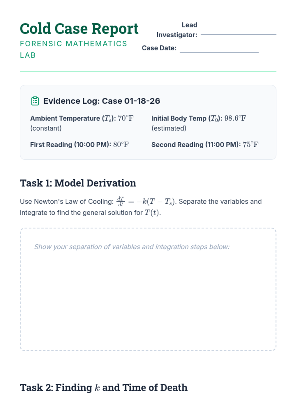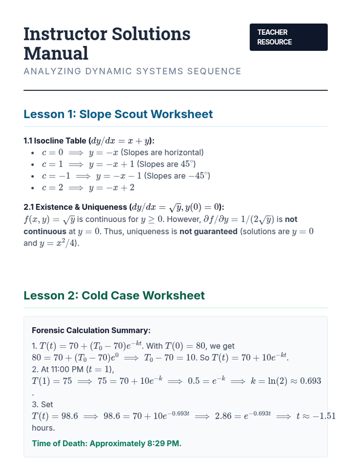 This sequence introduces undergraduate students to first-order differential equations through geometric visualization, analytical solving techniques (separation, integrating factors), and real-world modeling of thermal, biological, and electrical systems.