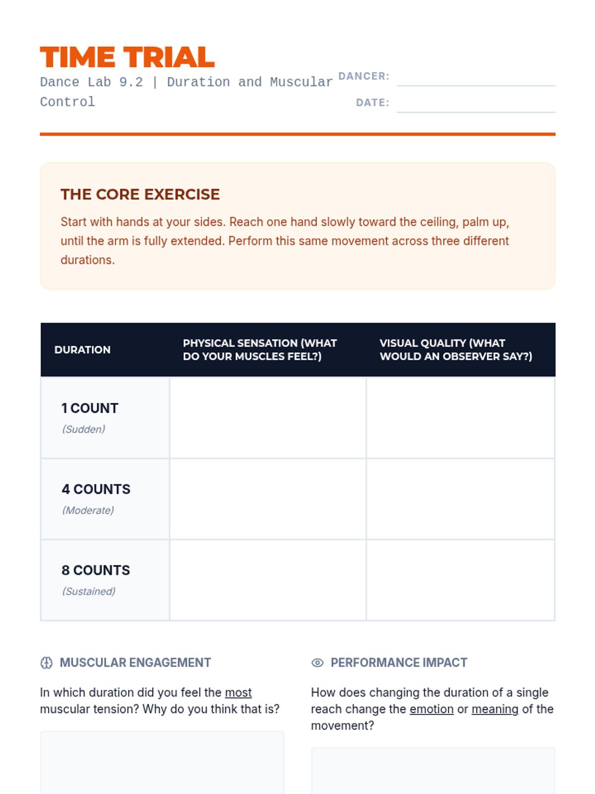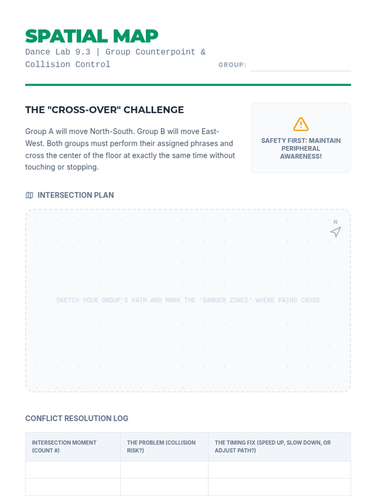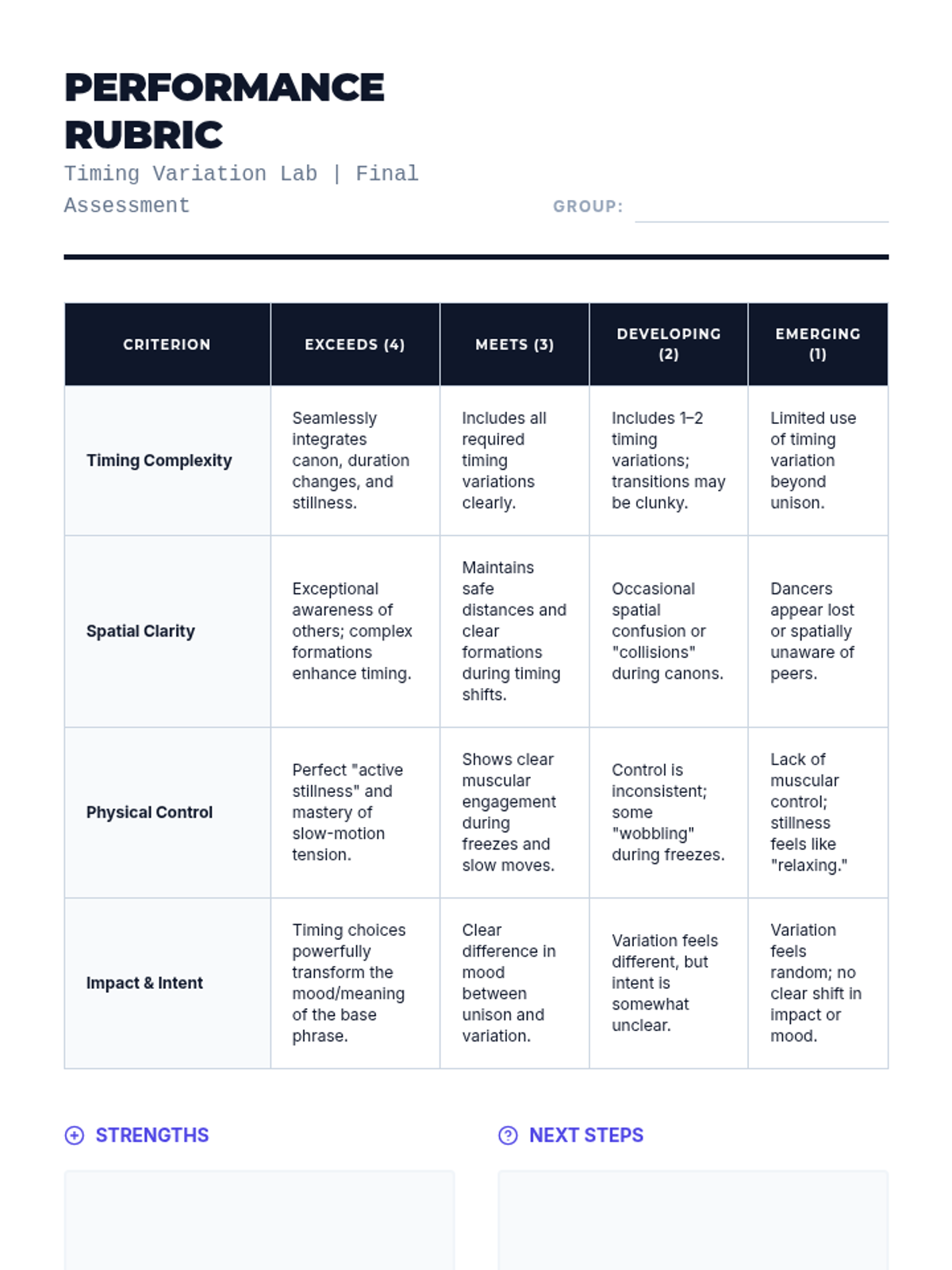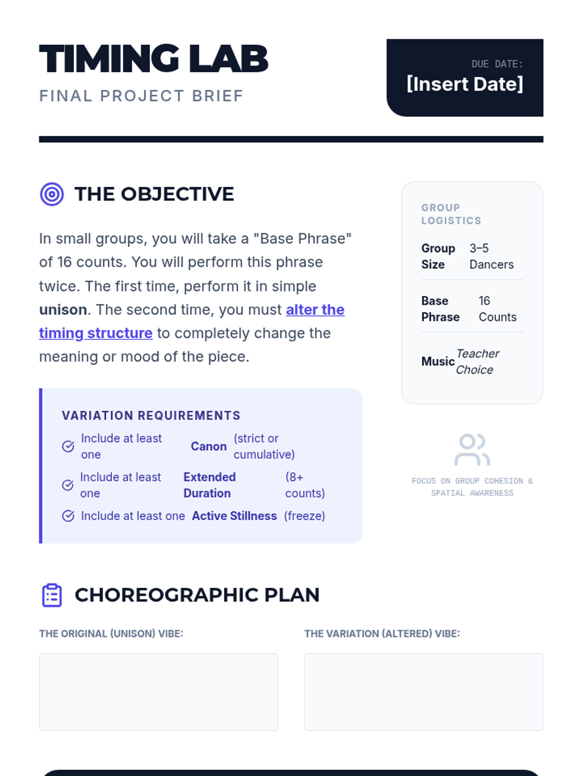 This sequence investigates how timing manipulation and spatial relationships influence the visual aesthetics of dance. Students move beyond unison timing to explore concepts like canon, rounds, and cascading movement, analyzing how these timing structures change the viewer's perception. through inquiry and experimentation, learners discover how delaying or anticipating movement relative to peers creates dynamic visual effects.