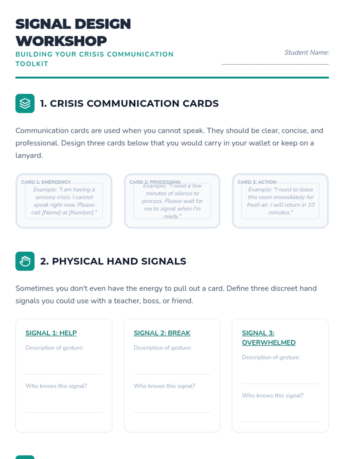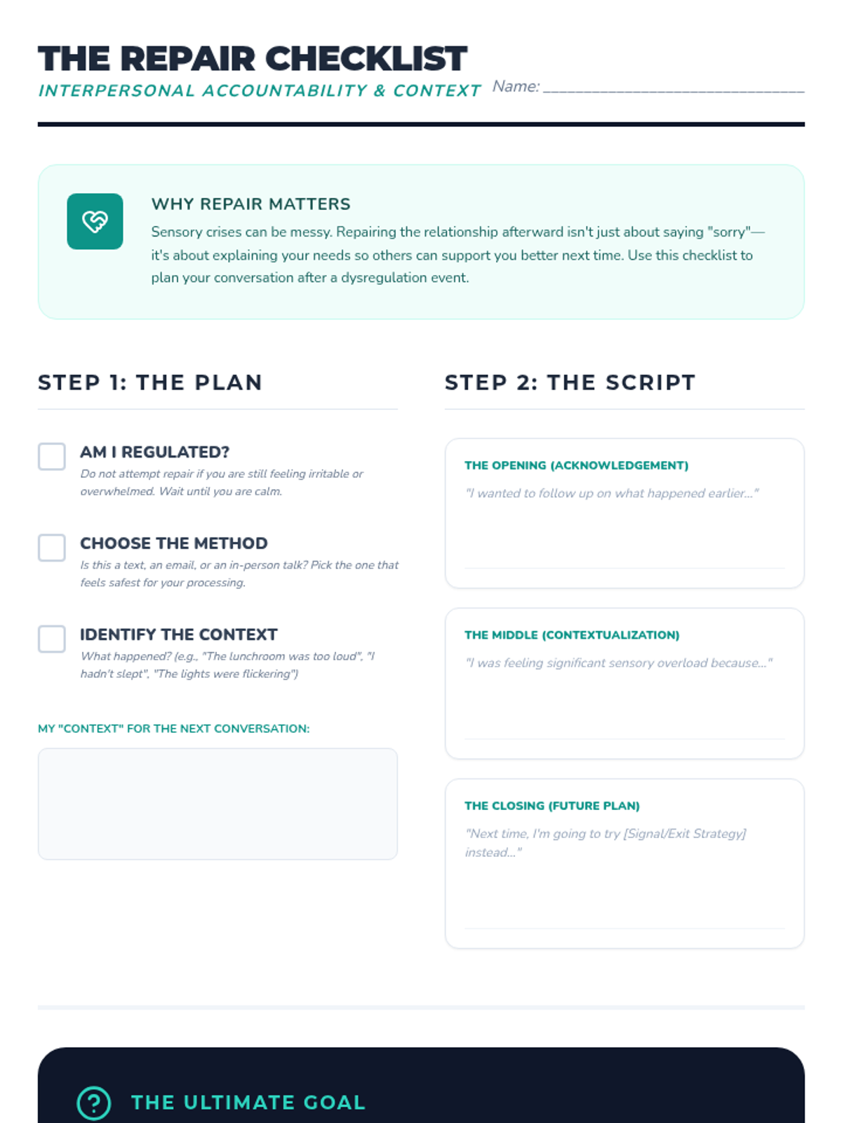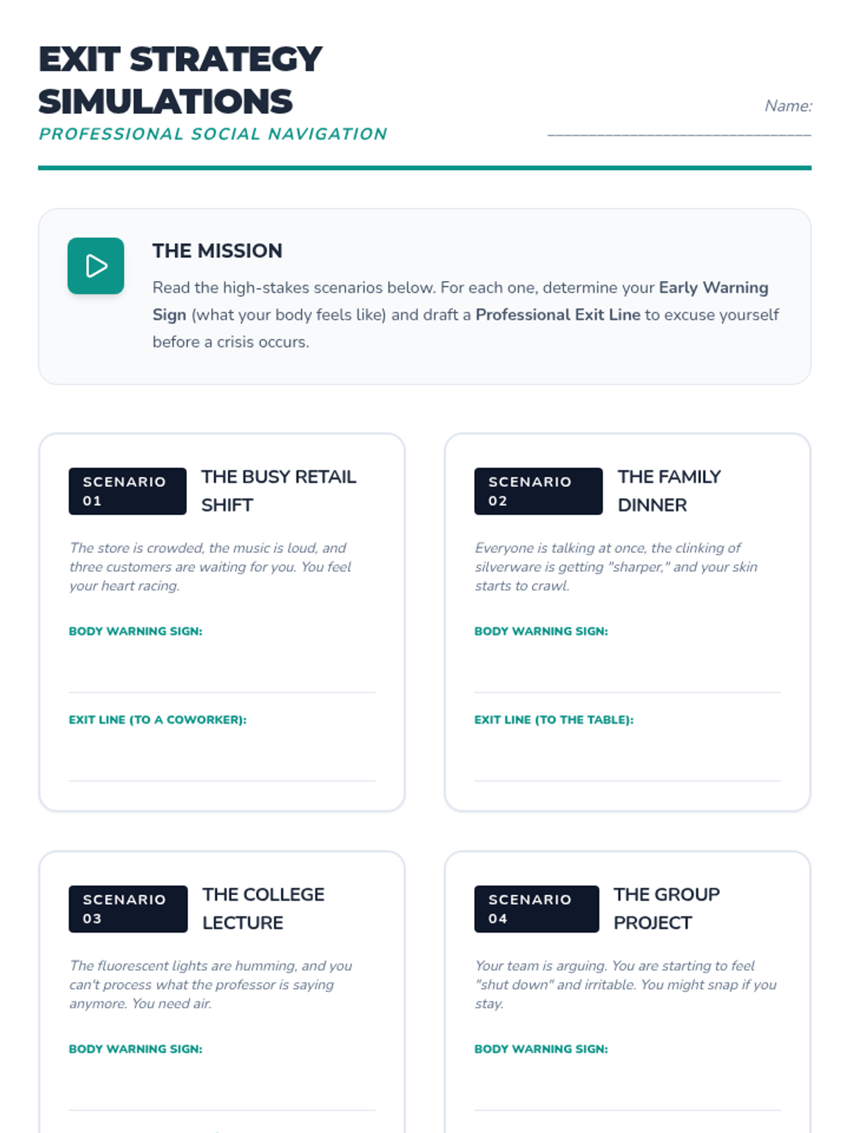 A comprehensive sequence for 12th-grade students focused on navigating interpersonal dynamics during and after sensory dysregulation. Students develop skills in identifying co-regulators, using non-verbal signals, advocating for professional accommodations, and managing relationship repair post-crisis.