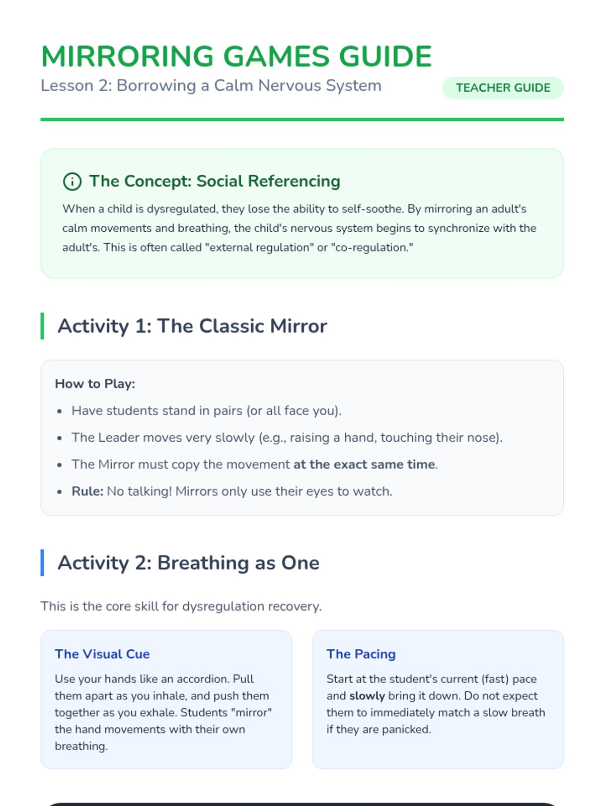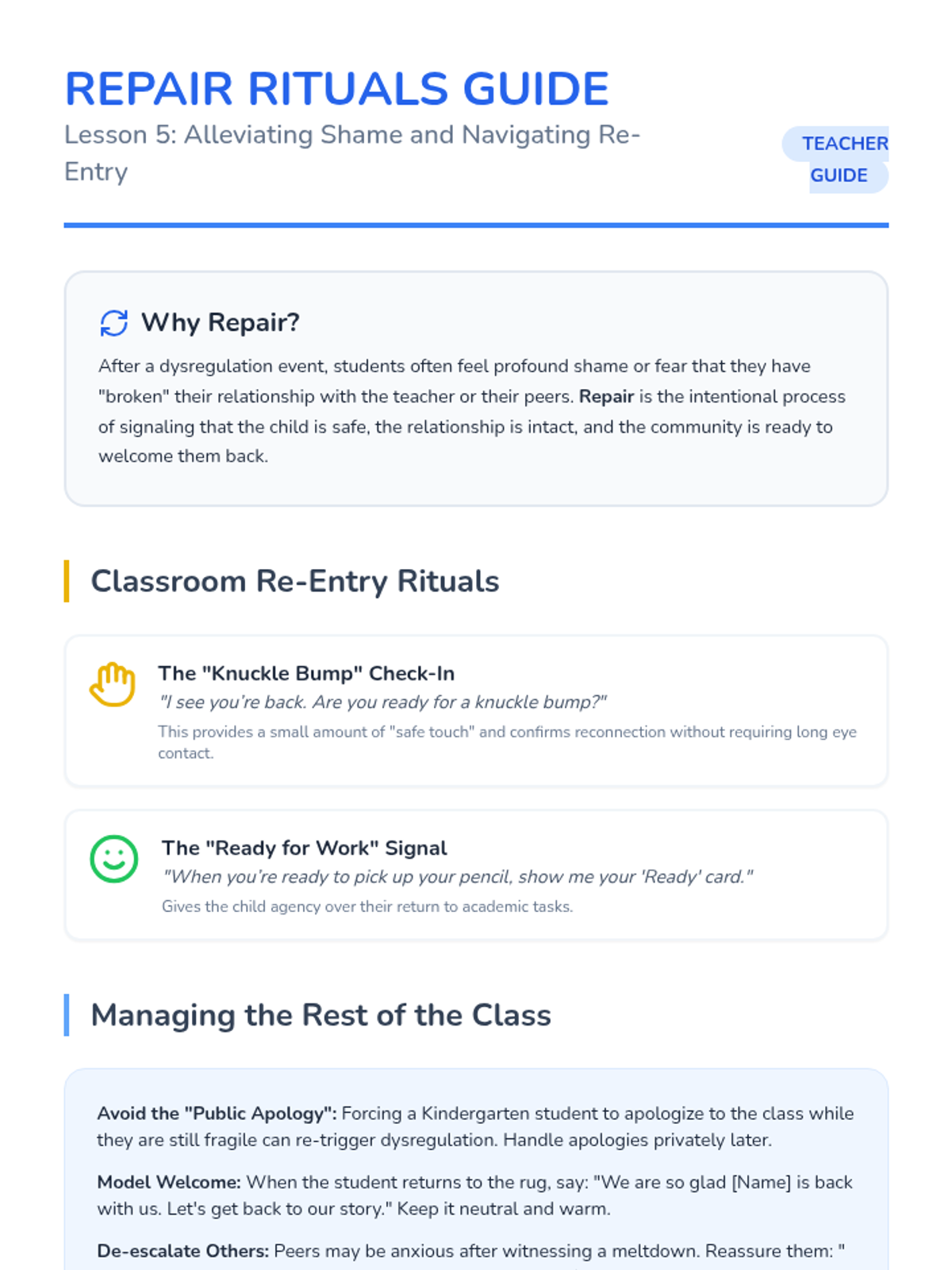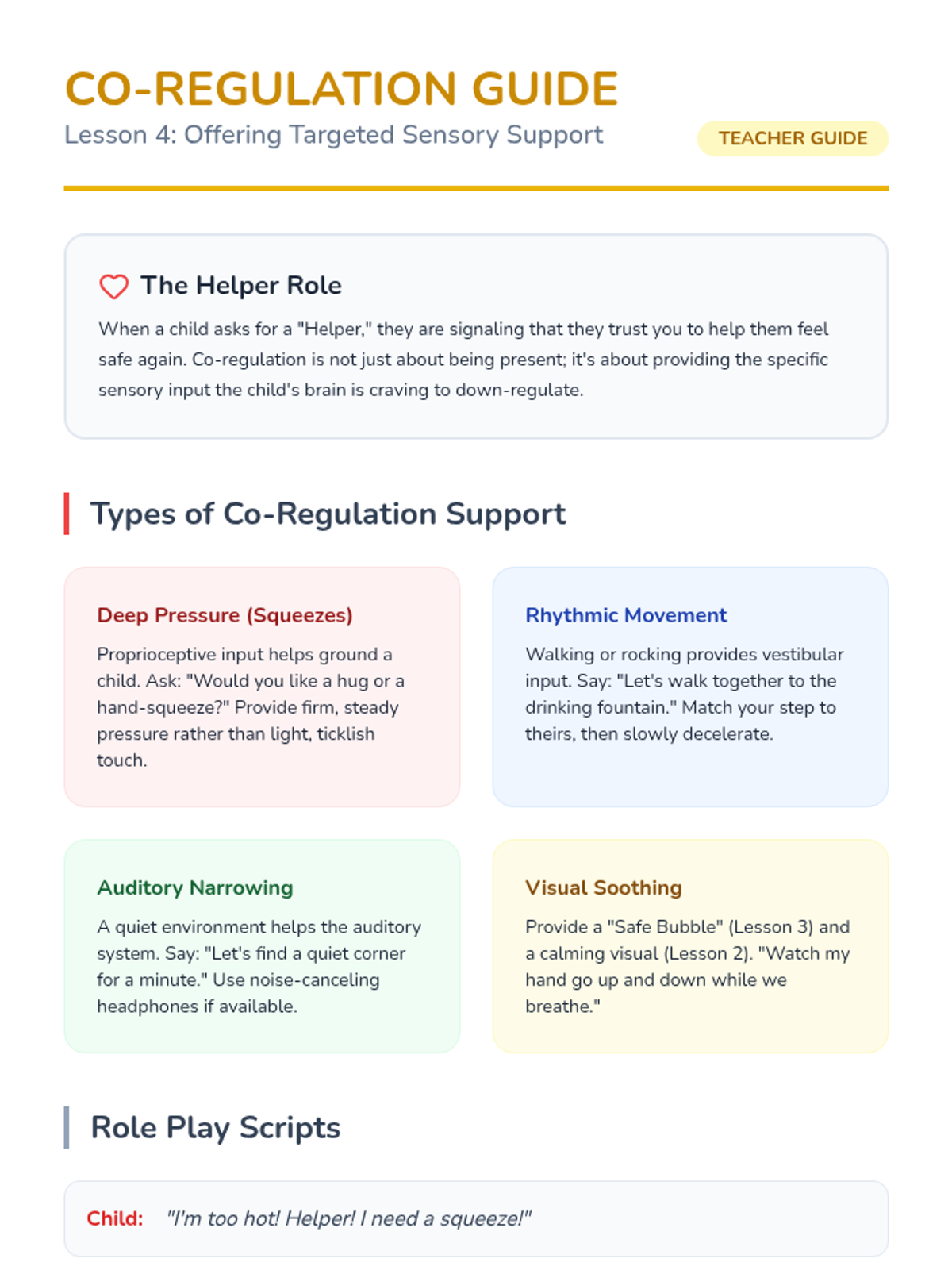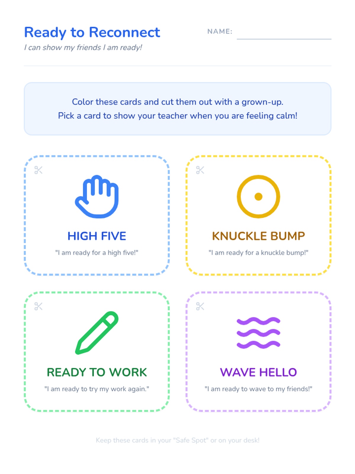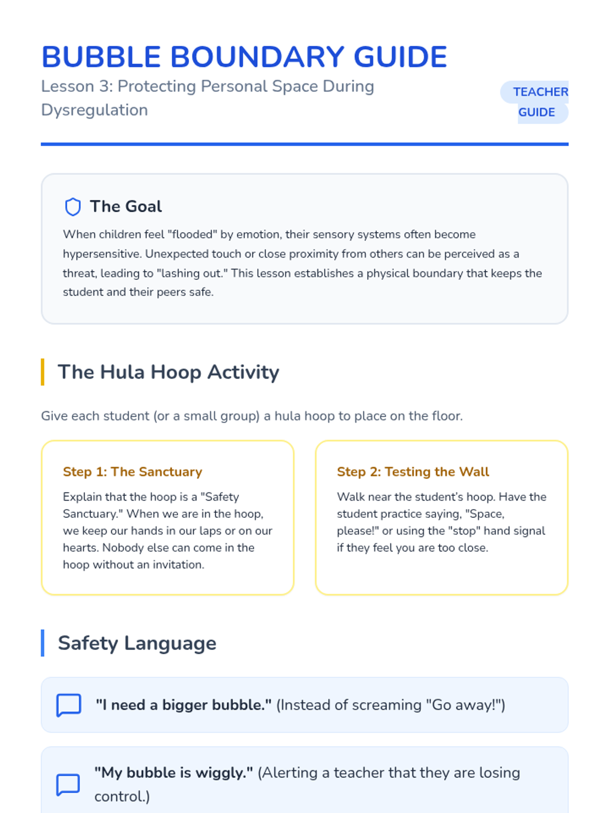 A Kindergarten sequence focused on teaching students how to communicate their needs non-verbally and co-regulate with adults during moments of sensory dysregulation. Students learn signals, breathing techniques, boundaries, and how to reconnect after a meltdown.