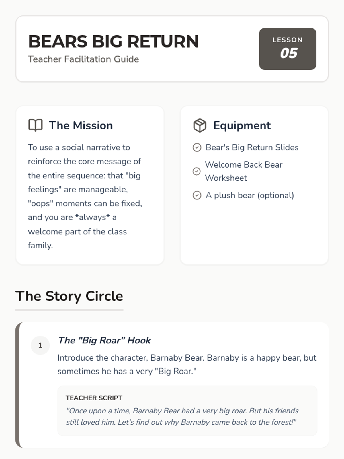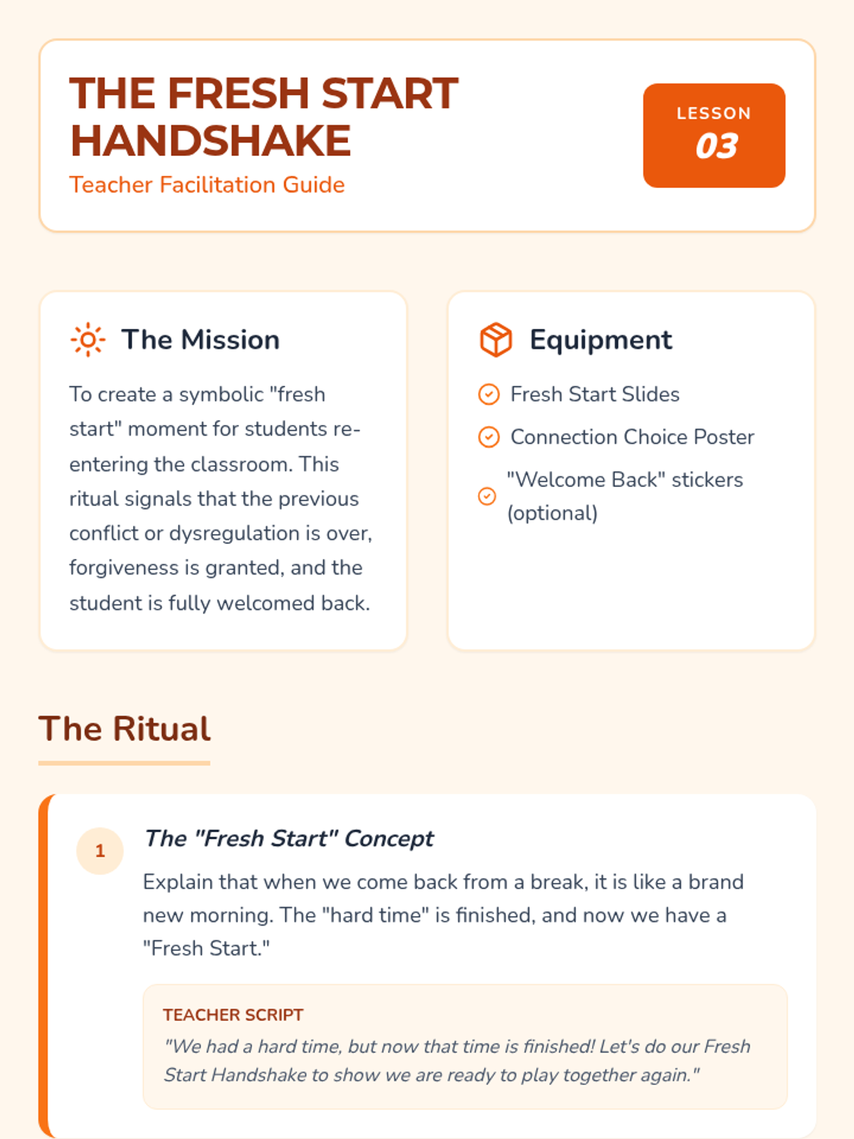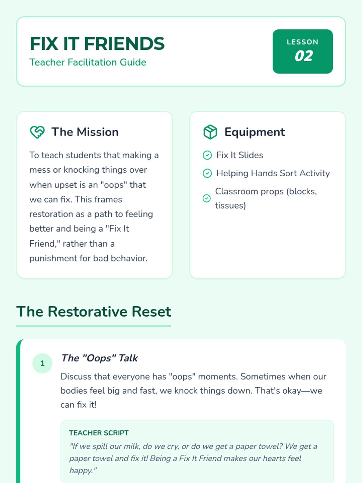 A comprehensive sequence for Pre-K students in special education settings, focusing on the restorative phase after emotional dysregulation. Students learn self-assessment, restorative practices, social reconnection rituals, and peer re-entry skills to build resilience and maintain a sense of belonging within the classroom community.