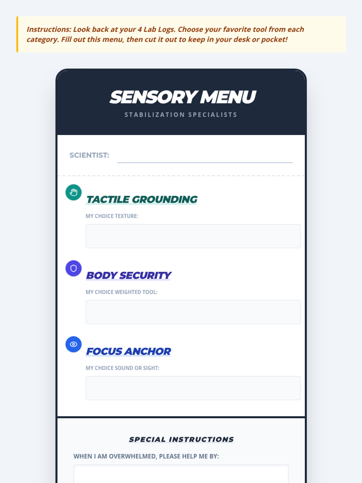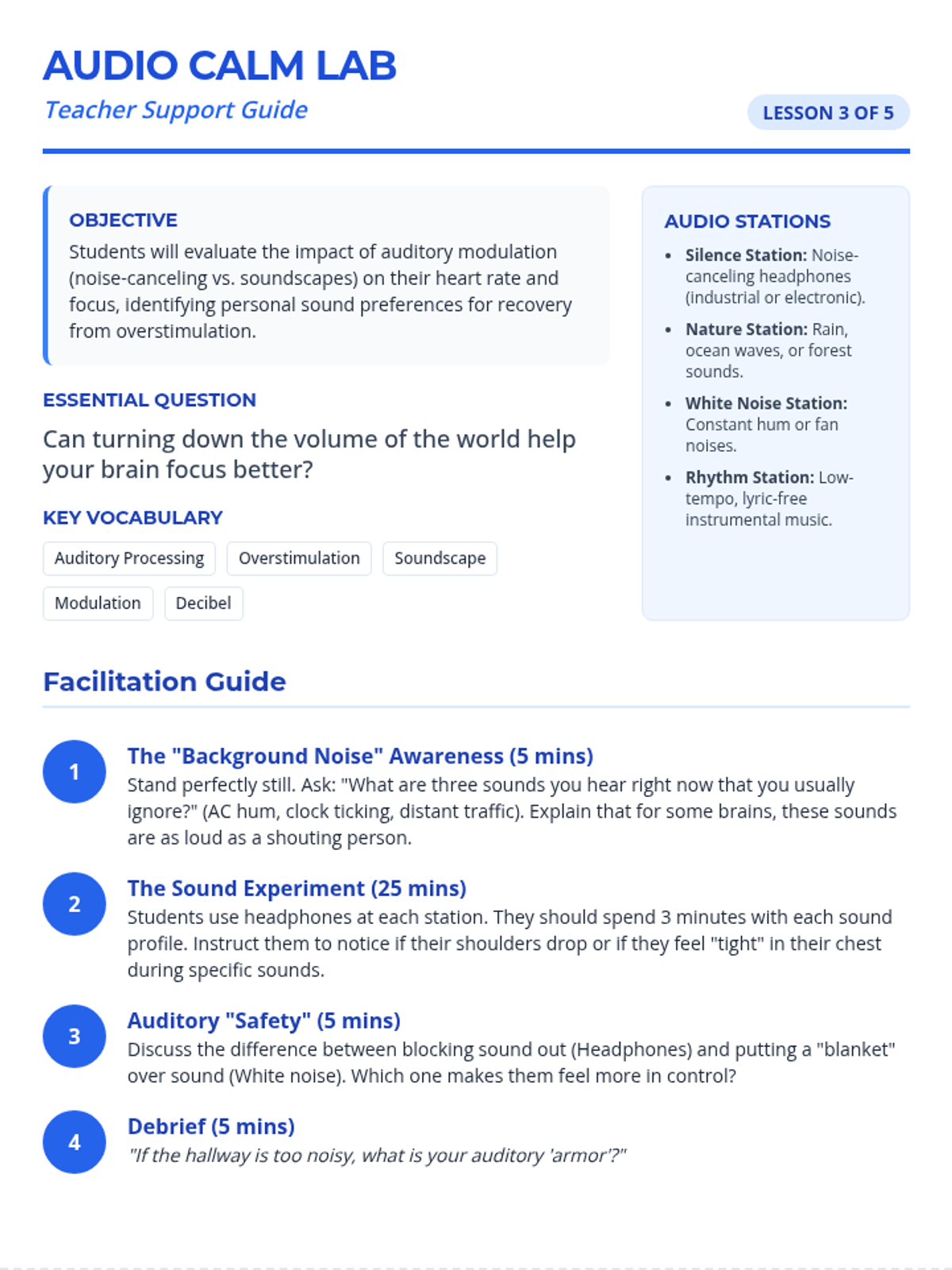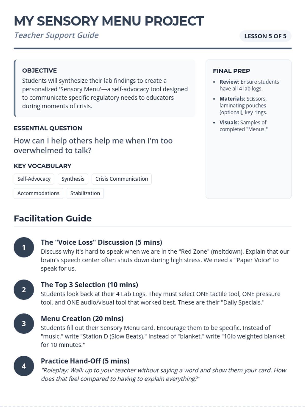 A 4th-grade sequence focused on exploring and selecting sensory tools (tactile, auditory, visual, and deep pressure) to help students recover from emotional dysregulation and meltdowns. Students experiment with different aids to build a personalized 'Sensory Menu' for self-advocacy.