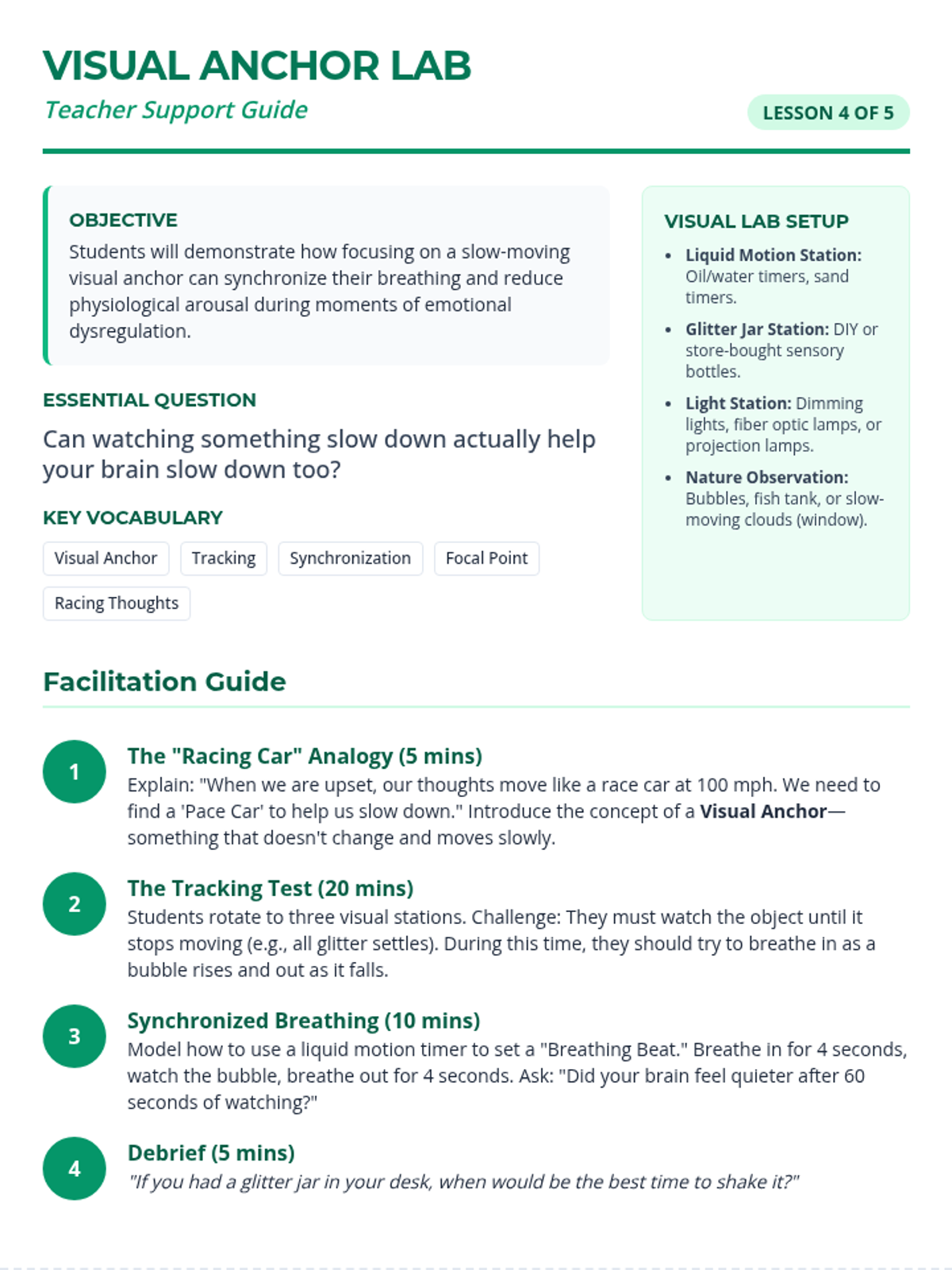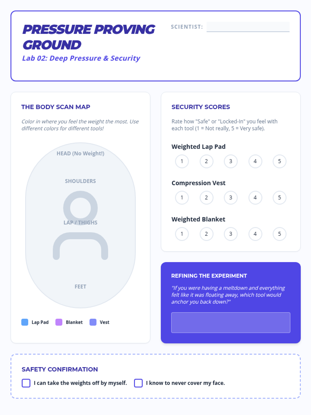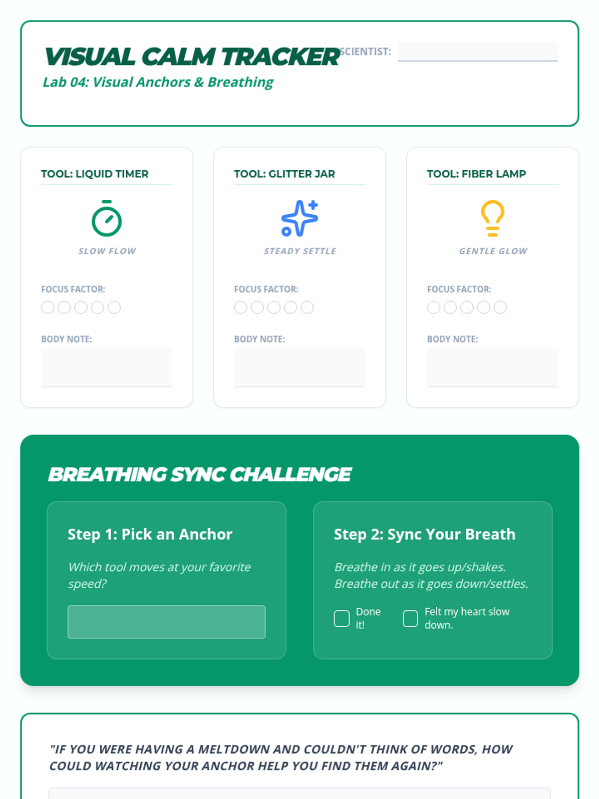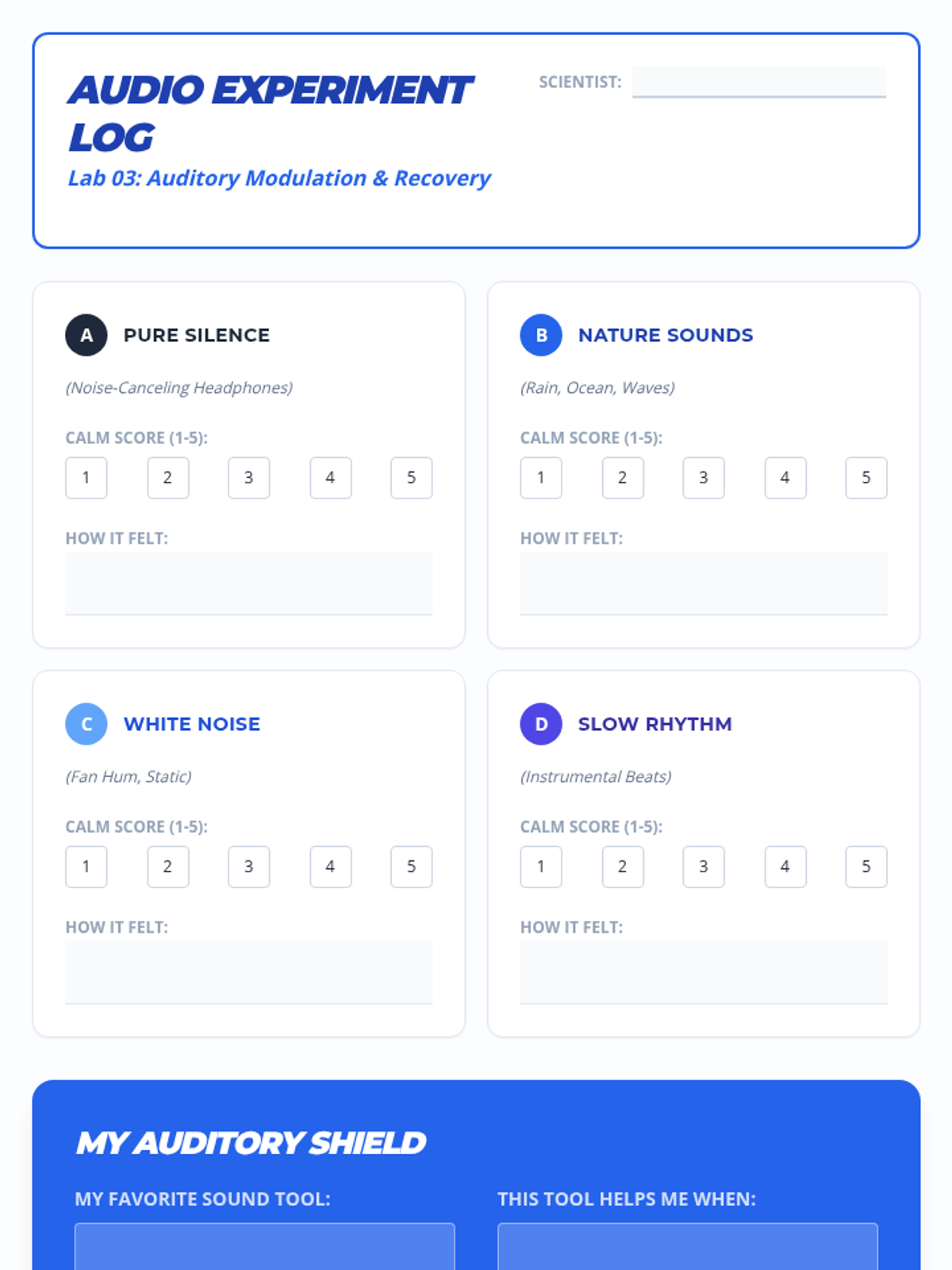 A 4th-grade sequence focused on exploring and selecting sensory tools (tactile, auditory, visual, and deep pressure) to help students recover from emotional dysregulation and meltdowns. Students experiment with different aids to build a personalized 'Sensory Menu' for self-advocacy.