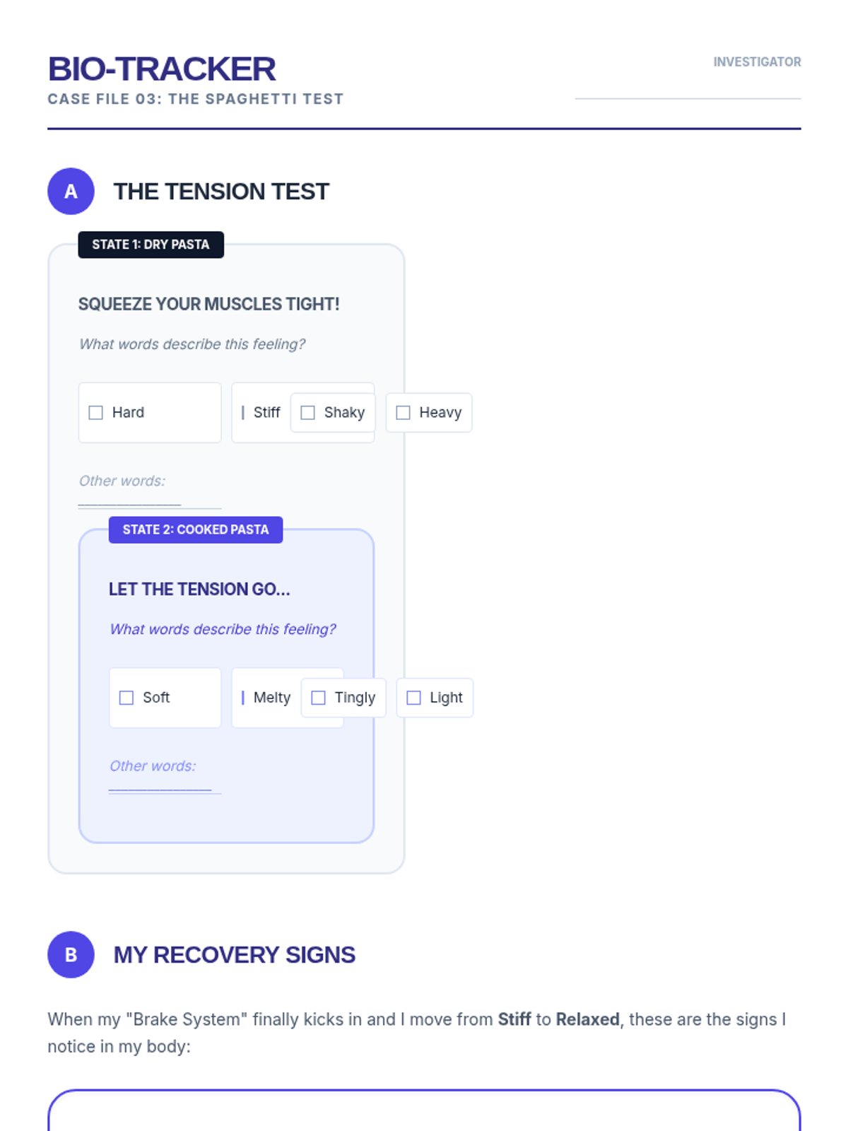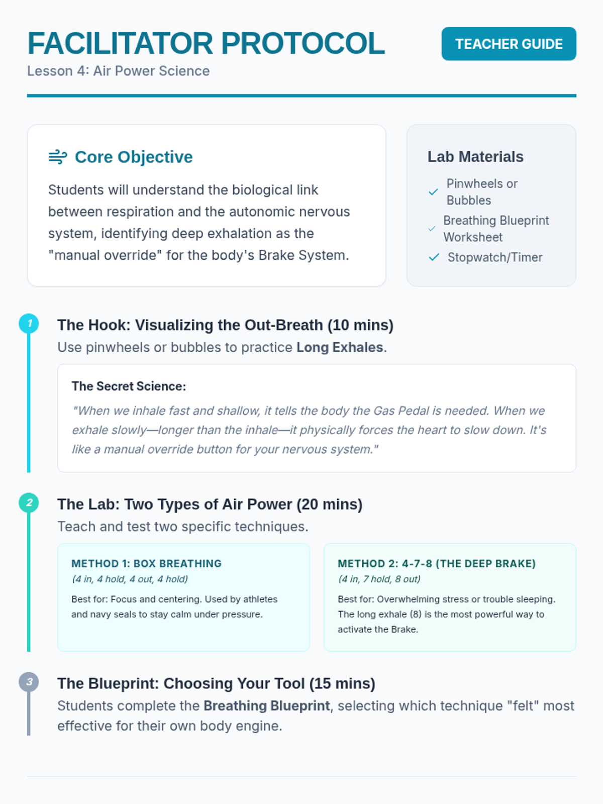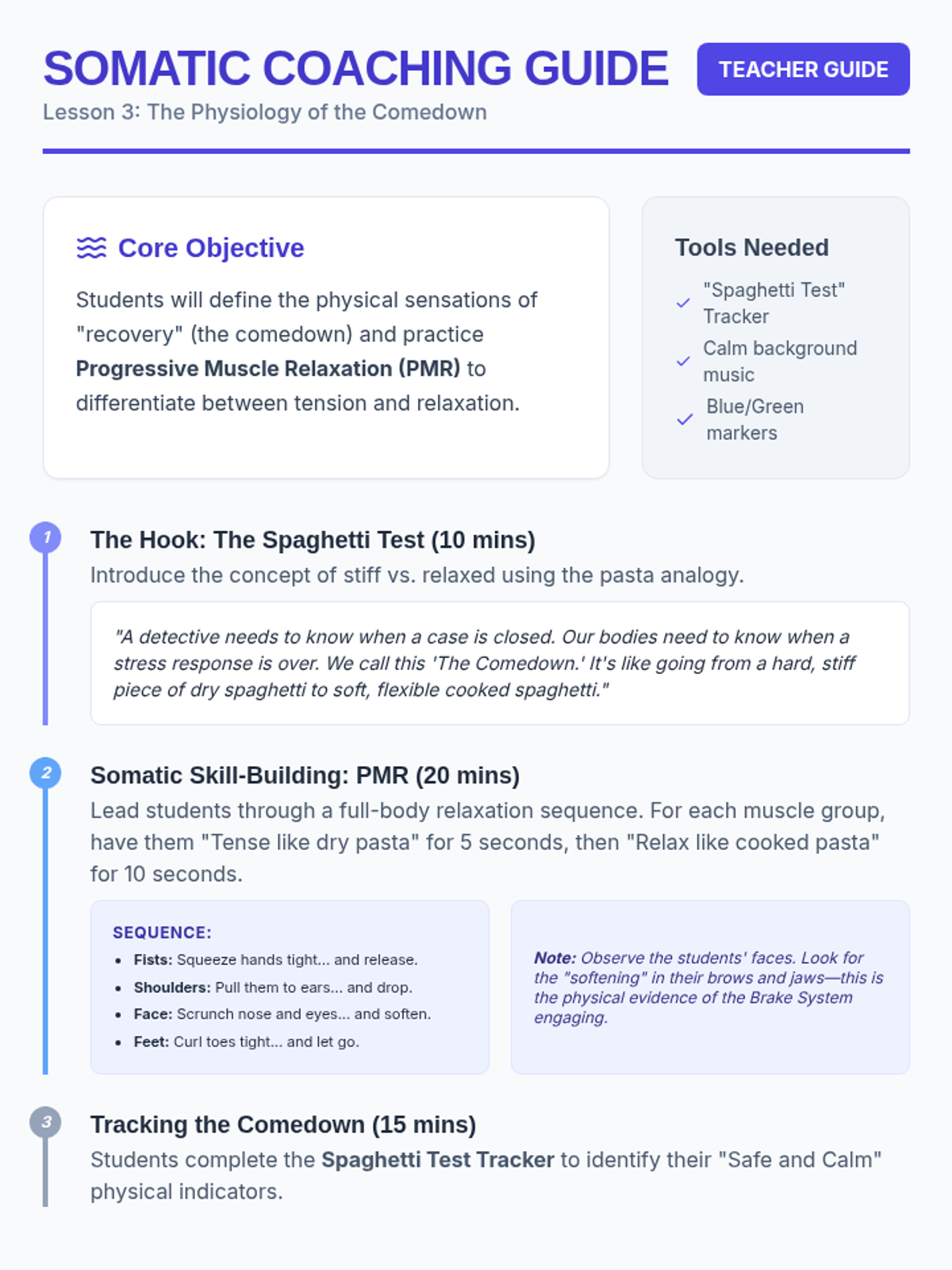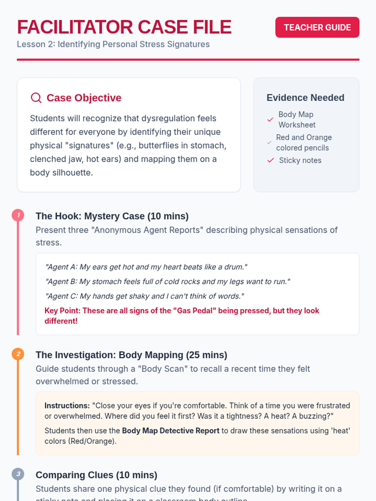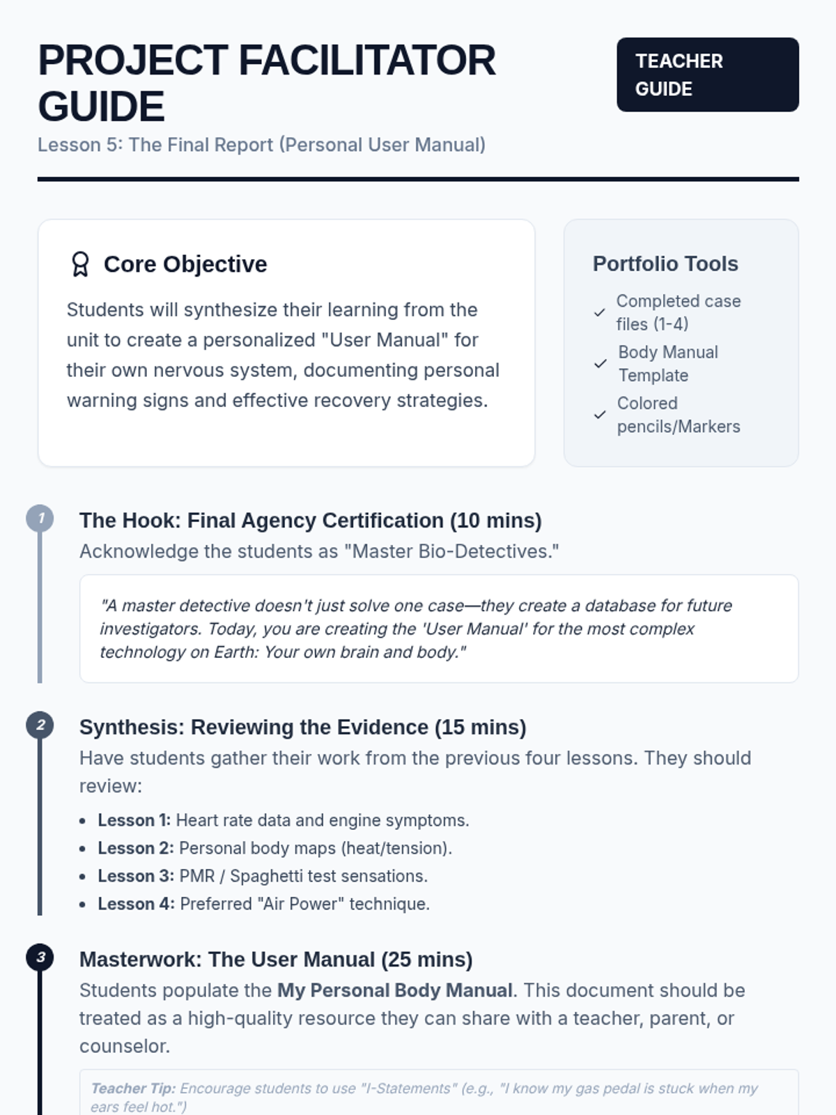 This sequence guides 5th-grade students through identifying physiological signals of dysregulation and the recovery process. Using a 'Bio-Detective' theme, students explore interoception, somatic techniques, and the autonomic nervous system to create a personalized 'Body Manual' for self-regulation.