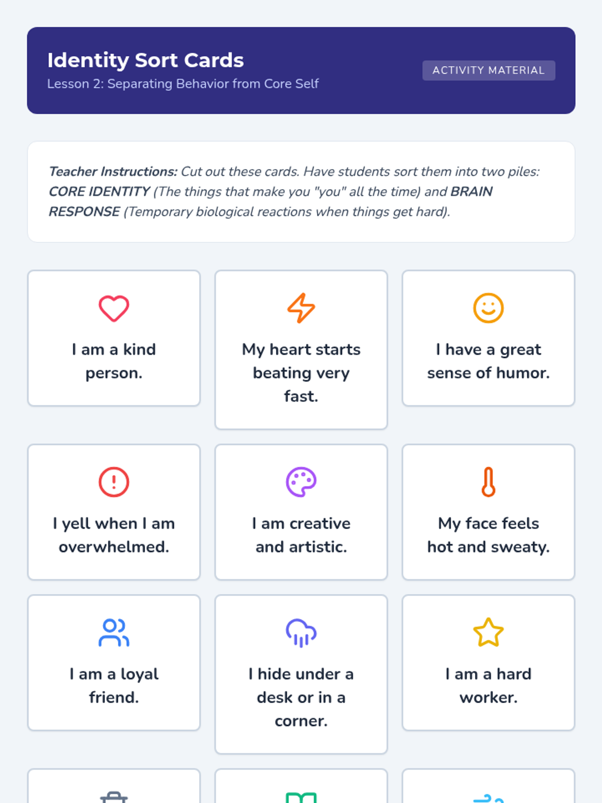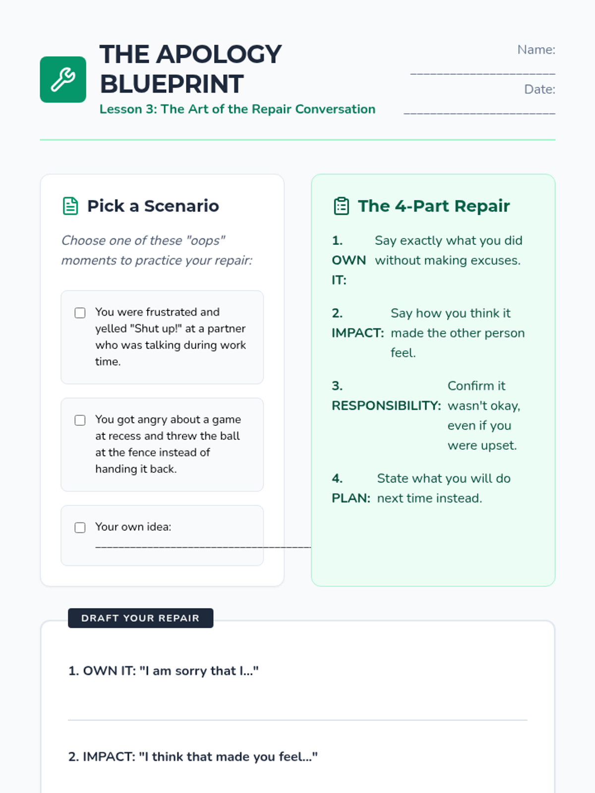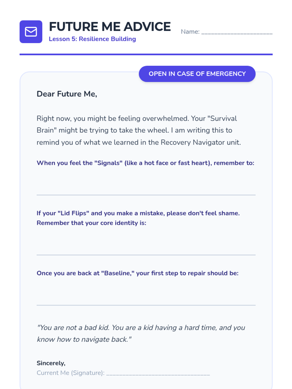 This sequence explores dysregulation recovery through a restorative lens. Students use case studies and fictional scenarios to analyze meltdowns, separate behavior from identity to reduce shame, and master the art of repair conversations. The unit culminates in creating personal debriefing habits and future planning for emotional resilience.