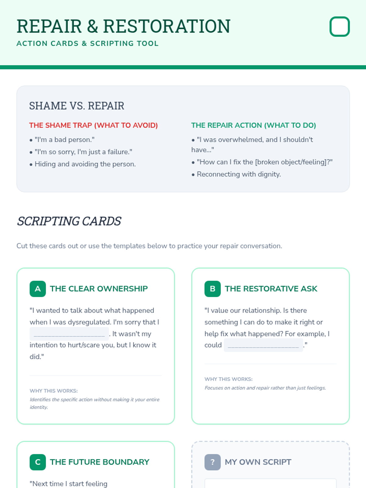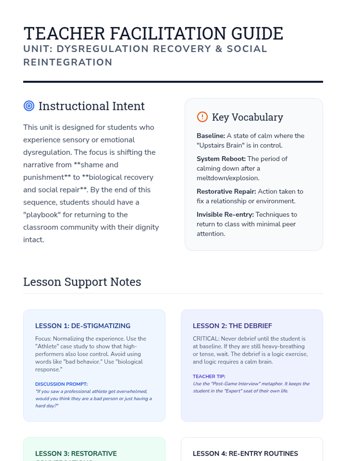 This sequence focuses on the restorative phase following a dysregulation event, emphasizing social-emotional repair and reintegration into the classroom community. Students explore how to process feelings of shame or embarrassment and how to debrief effectively with adults once baseline is restored.