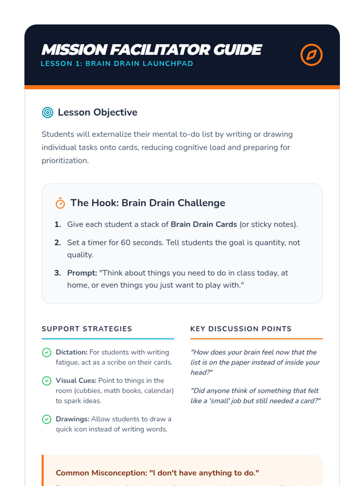 A 5-lesson sequence for 3rd-grade students focused on breaking down complex, multi-step tasks into manageable single-step directions to support working memory and executive function. Students learn to identify the first step, 'debug' complex instructions, and use metacognitive strategies to manage overwhelm.