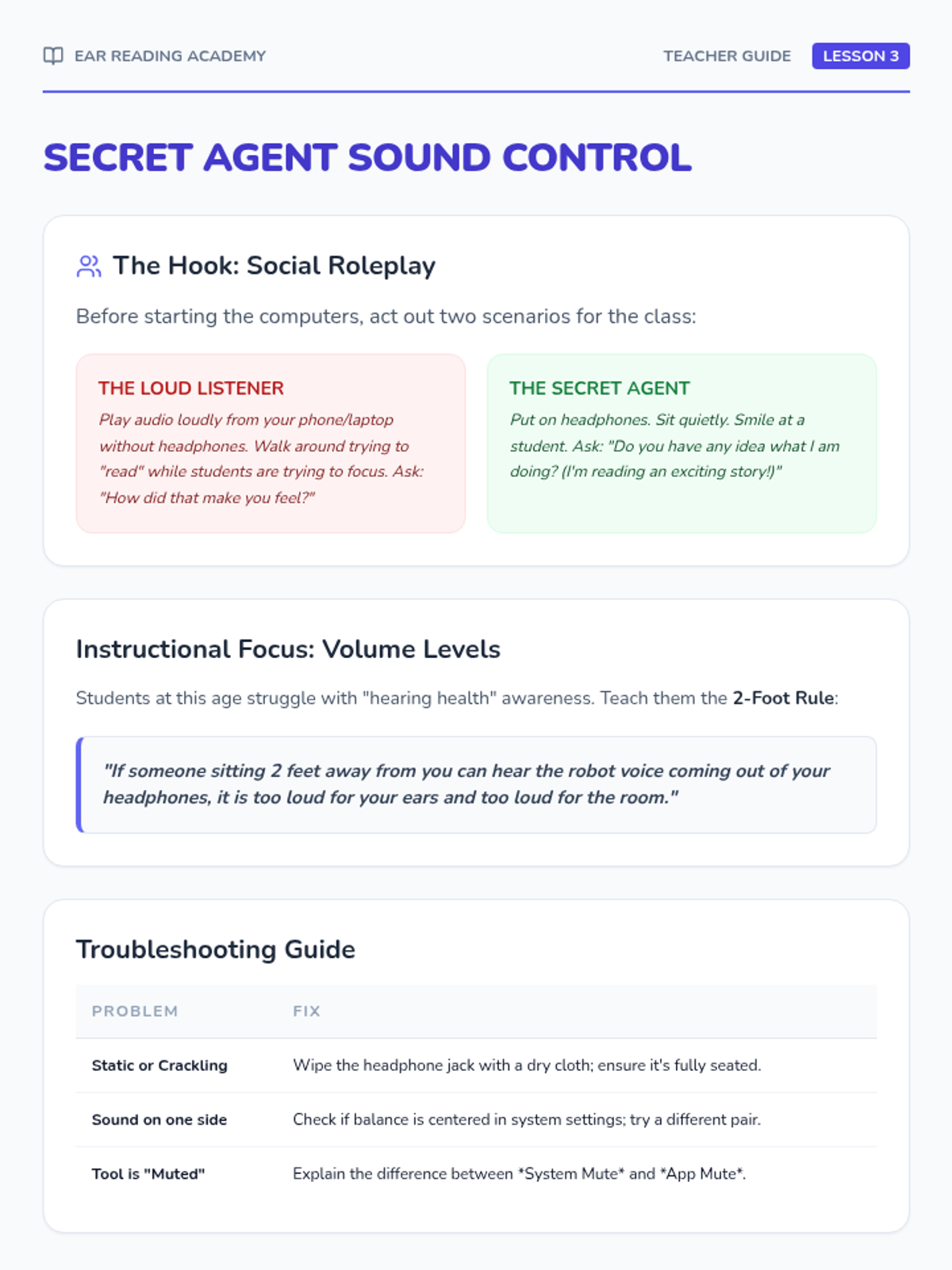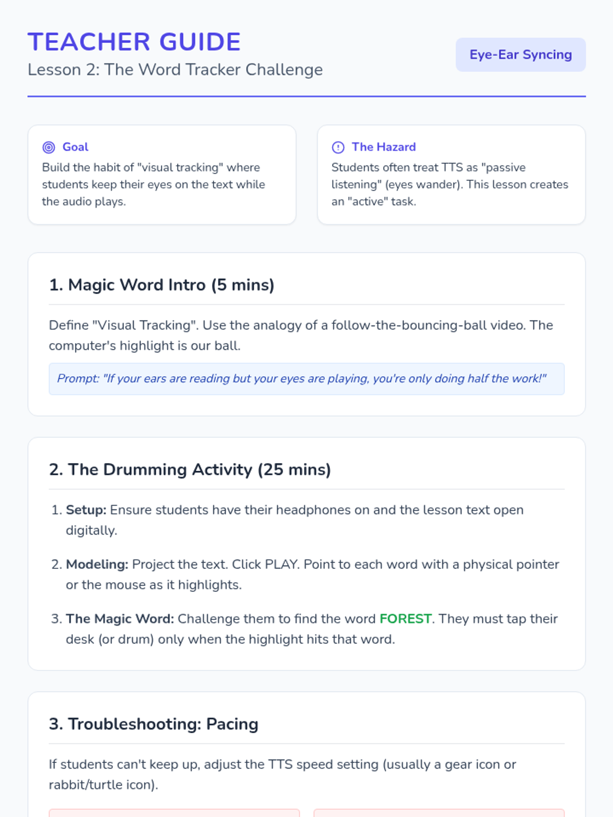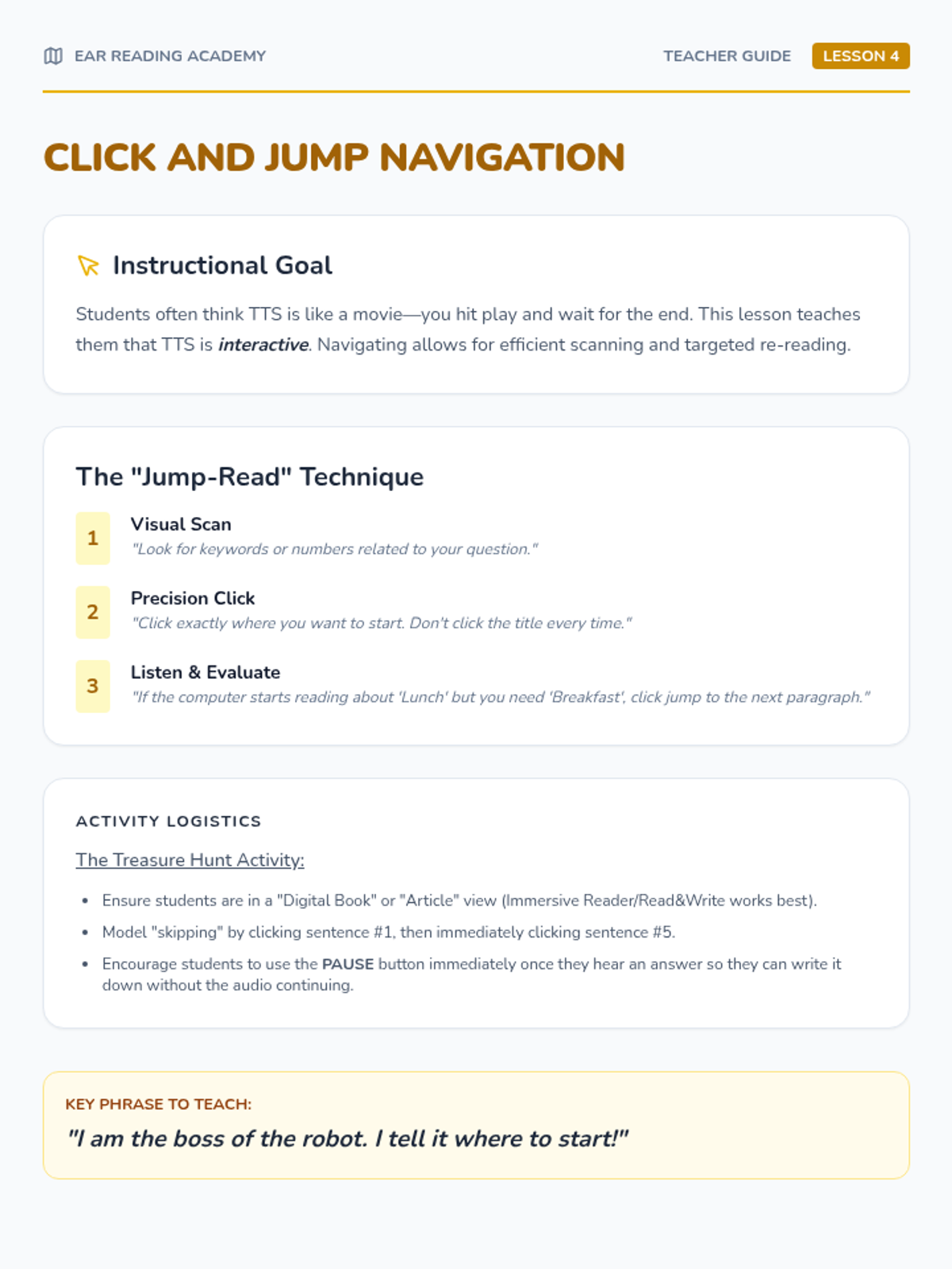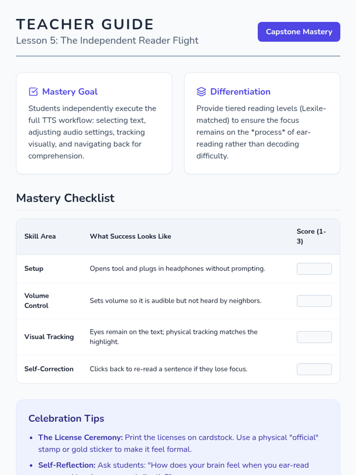 A 5-lesson sequence for 3rd graders to master text-to-speech (TTS) technology. Students progress from identifying basic controls to independent 'ear reading' with grade-level digital texts.