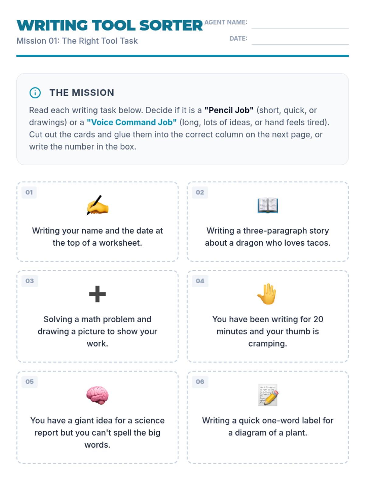 A 5-lesson sequence for 3rd-grade students to master independent use of speech-to-text dictation tools, focusing on self-awareness, environment management, troubleshooting, and self-advocacy.