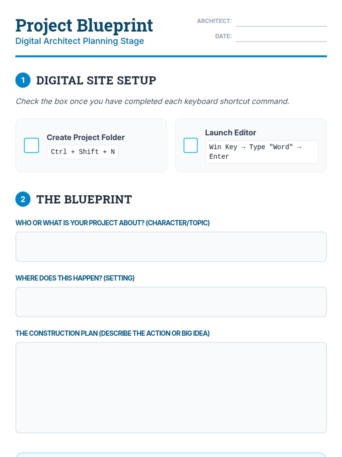 A project-based sequence for 3rd graders to master assistive technology through keyboard shortcuts. Students act as 'Digital Architects,' building a project from setup to final save using essential navigation and formatting commands.