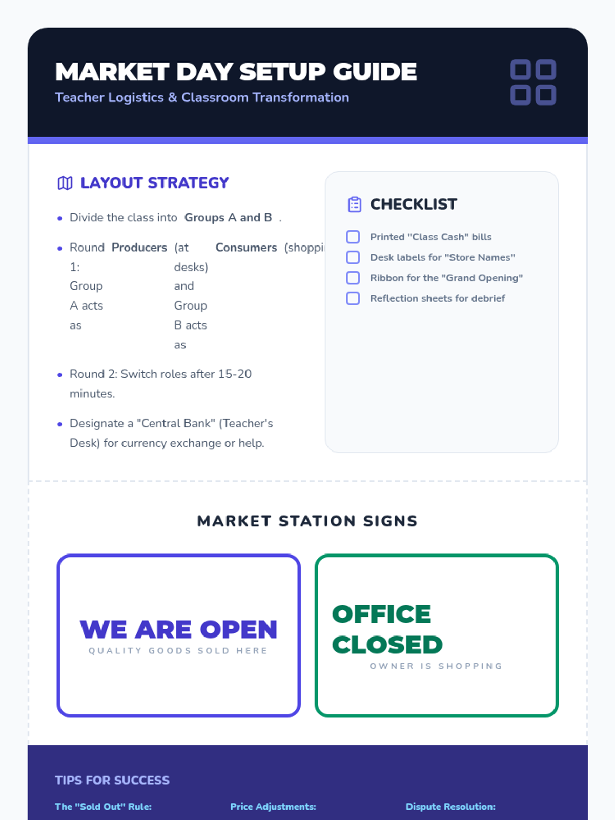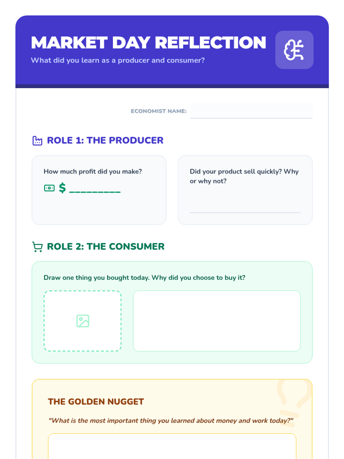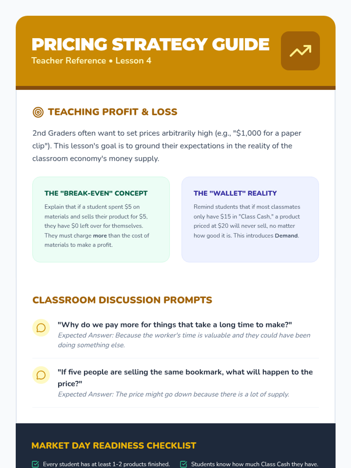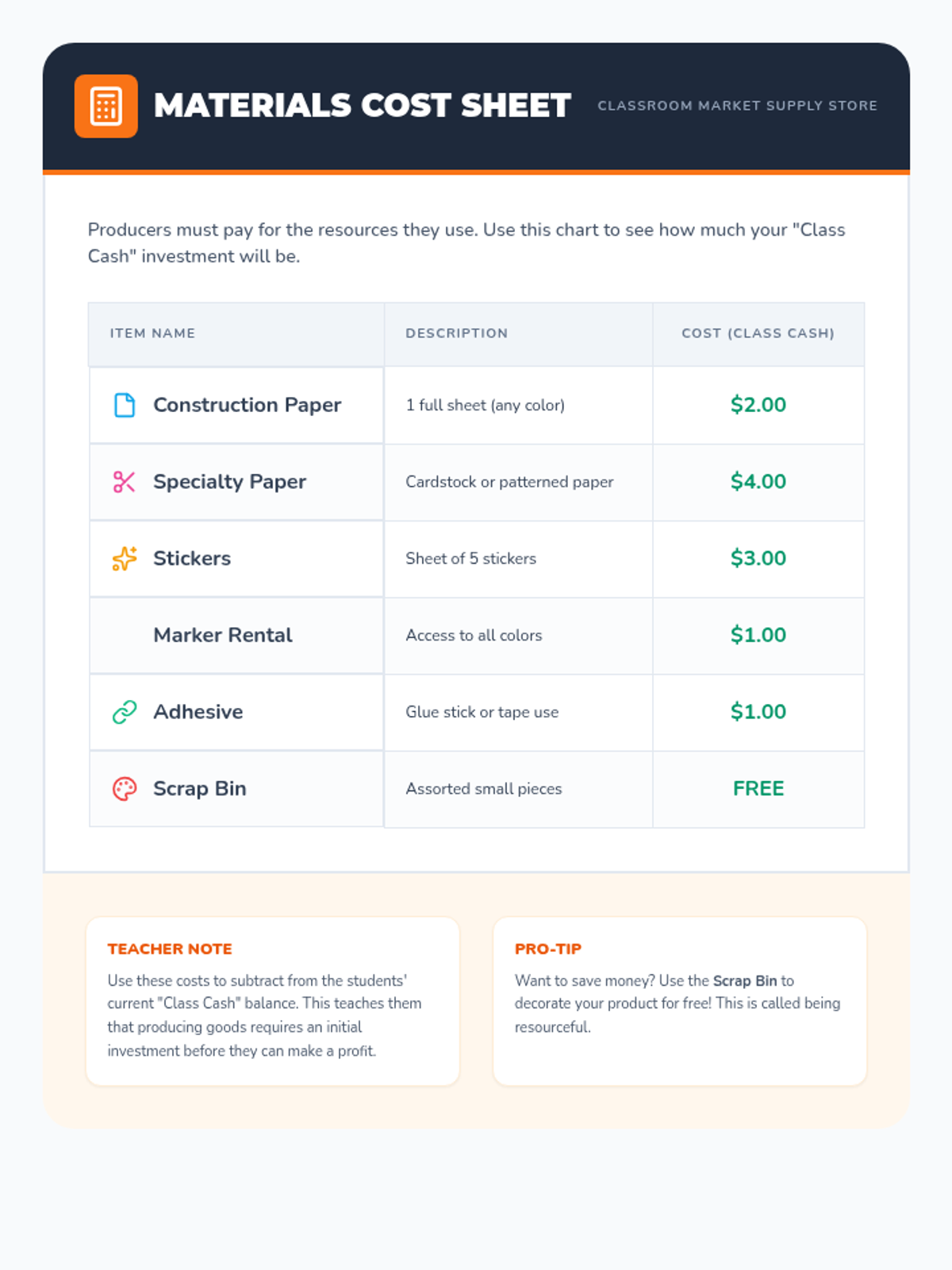 This sequence introduces 2nd graders to the fundamentals of economics through the lens of production and earning. Students learn to distinguish between goods and services, understand the link between labor and income, and participate in a project-based learning experience where they create products and simulate a classroom market.