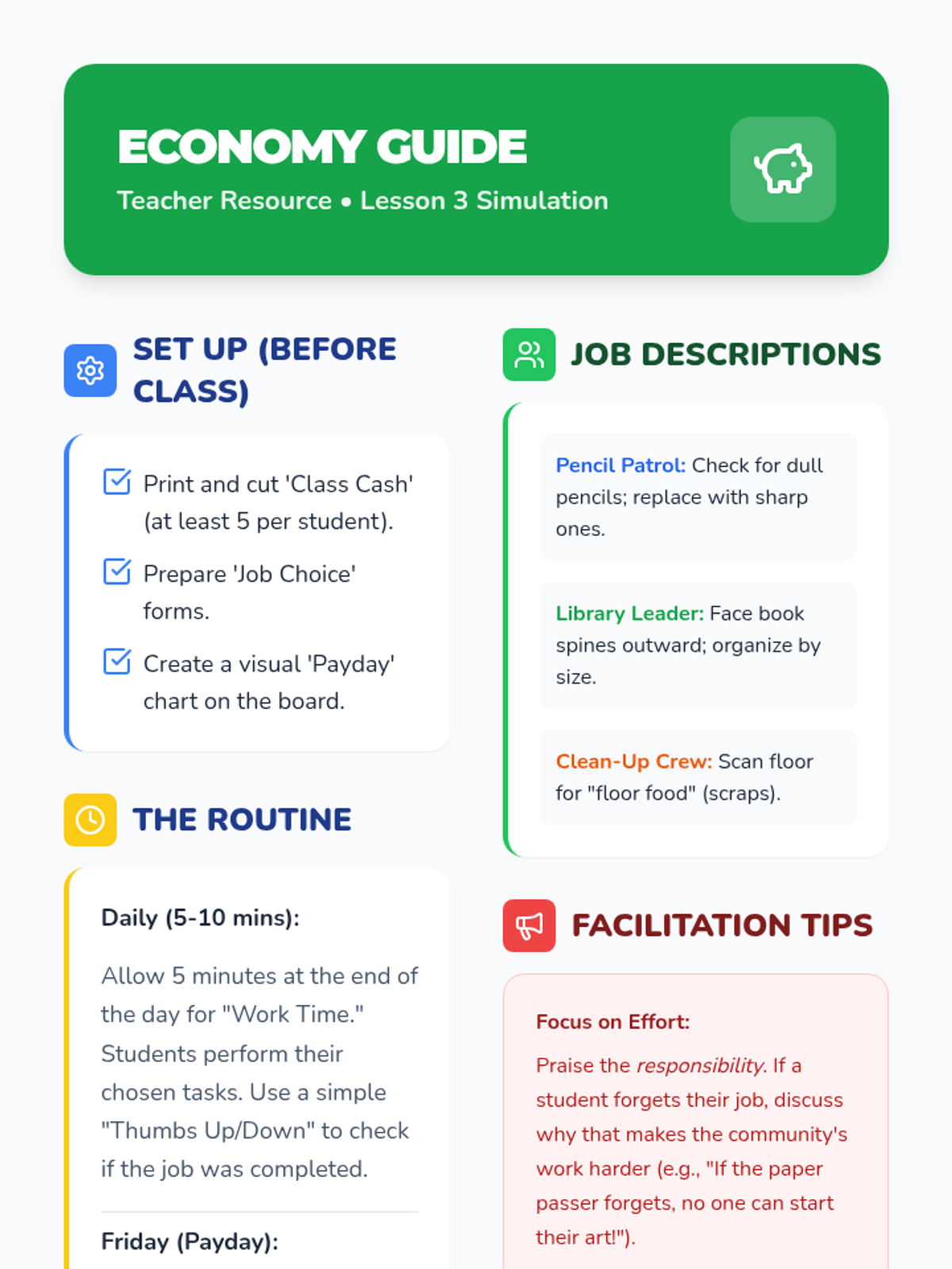 This Kindergarten sequence introduces students to the concept of earning money through work. It explores community roles, distinguishes between work and play, simulates a classroom economy, and explains the difference between goods and services, culminating in a reflection on how families use earned income.