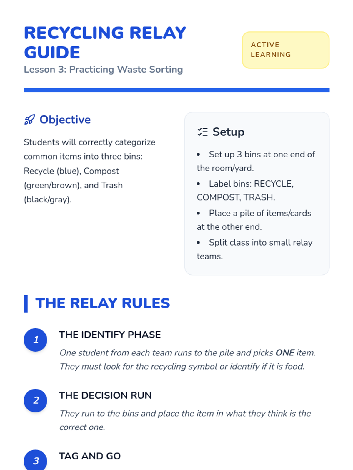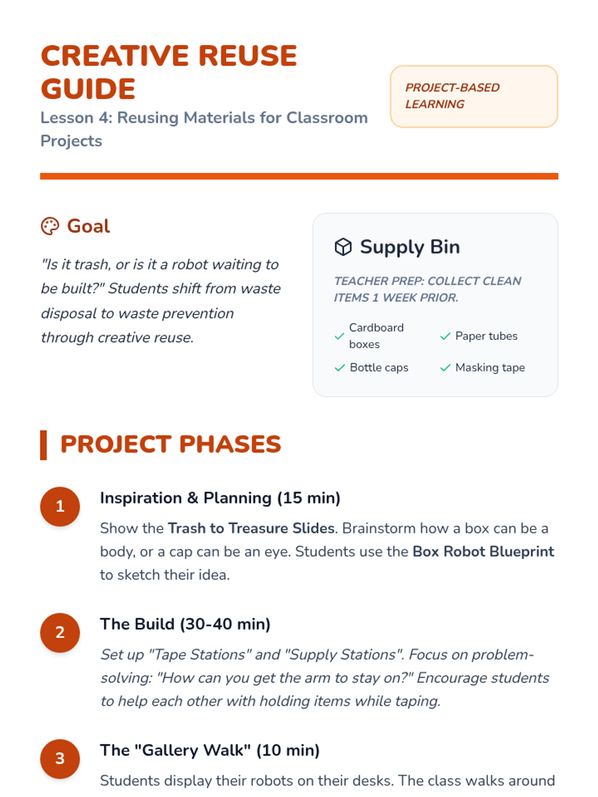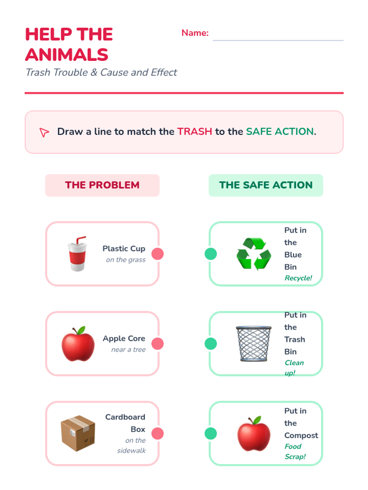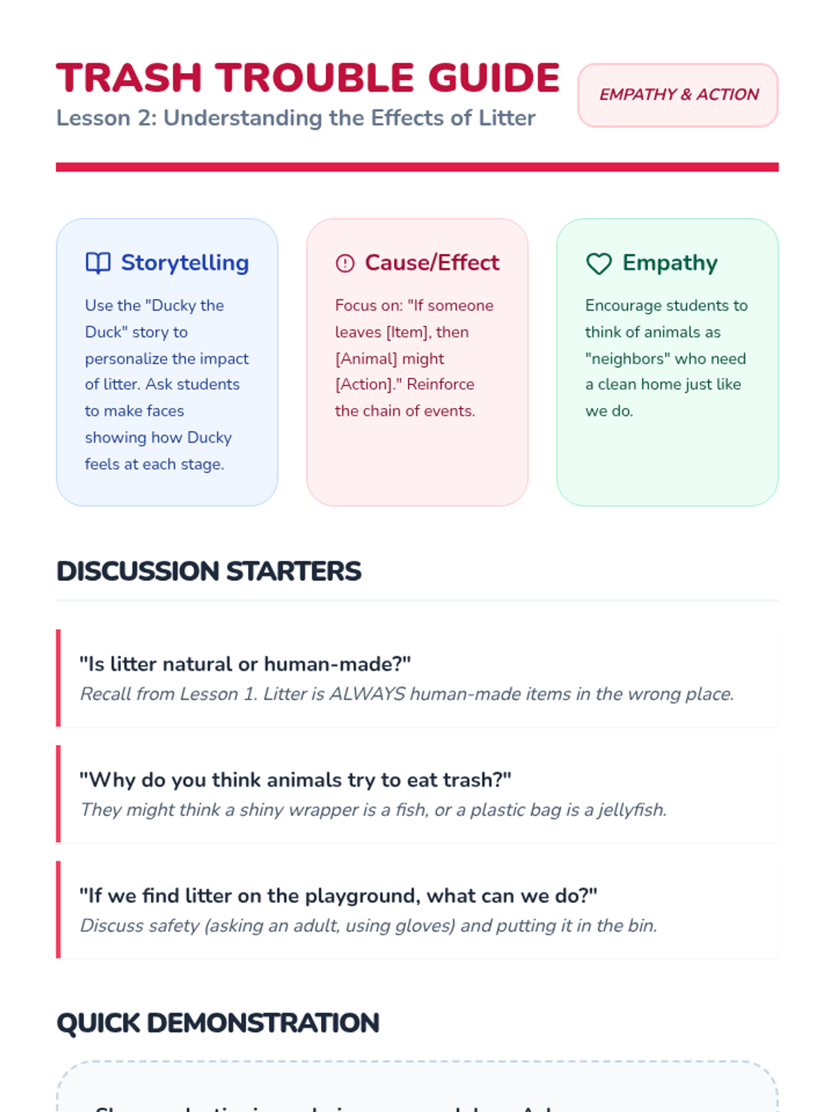 A Kindergarten sequence focused on human impacts, waste management, and environmental protection. Students learn to distinguish natural from human-made objects, understand the effects of litter, practice sorting, explore reuse, and commit to sustainable habits.