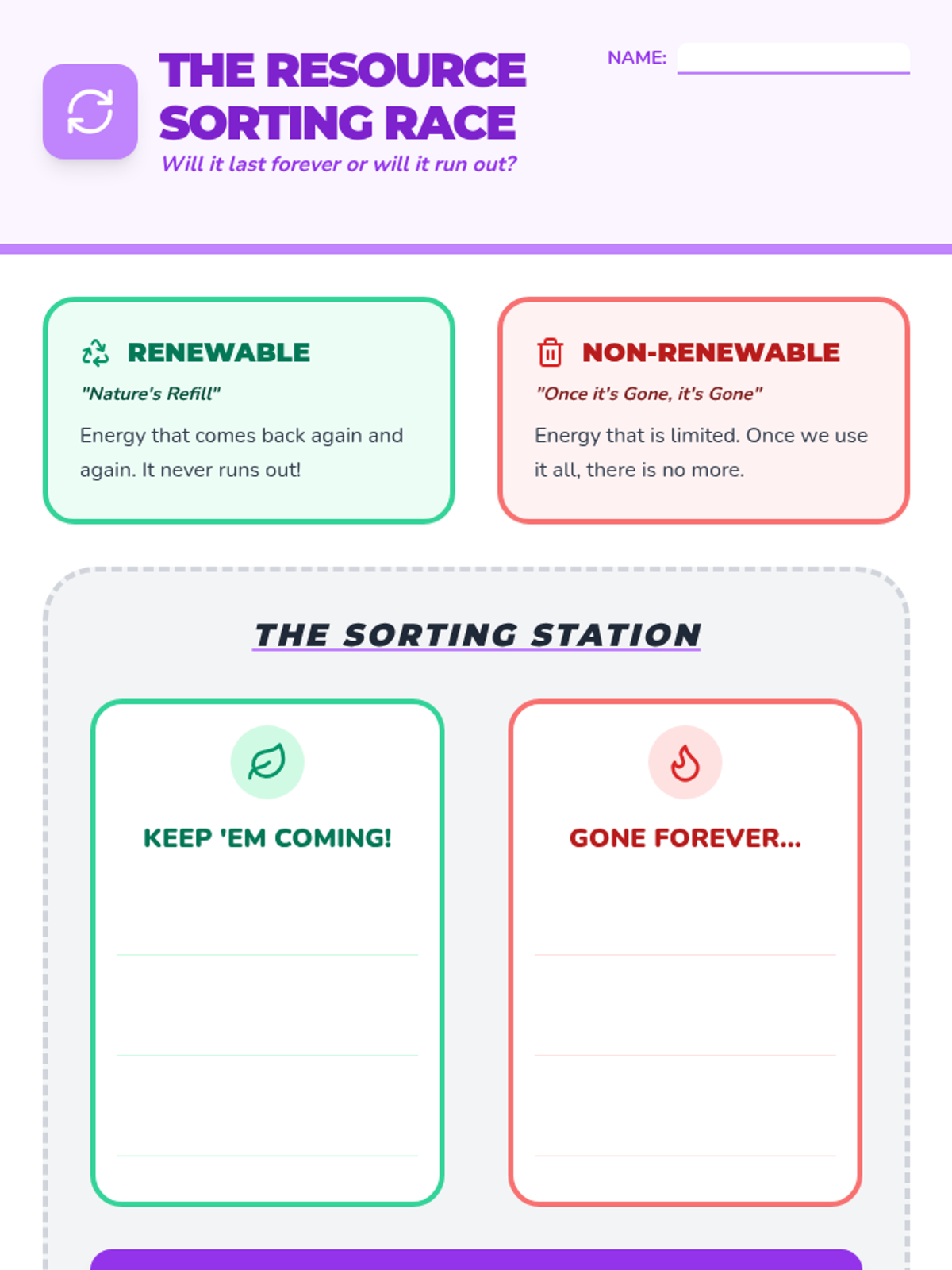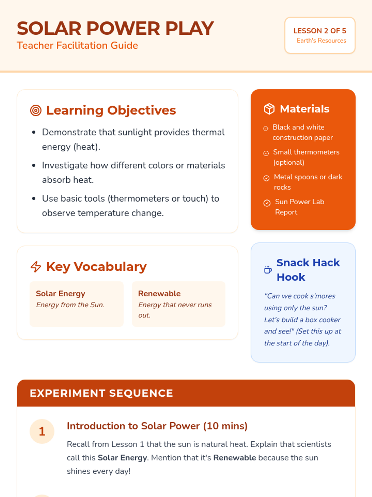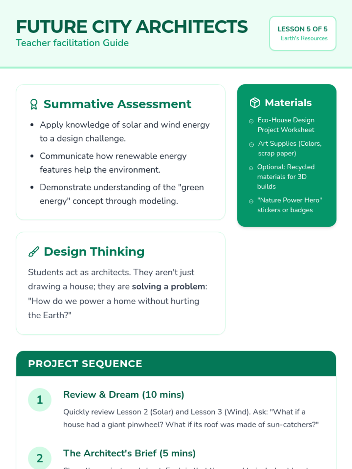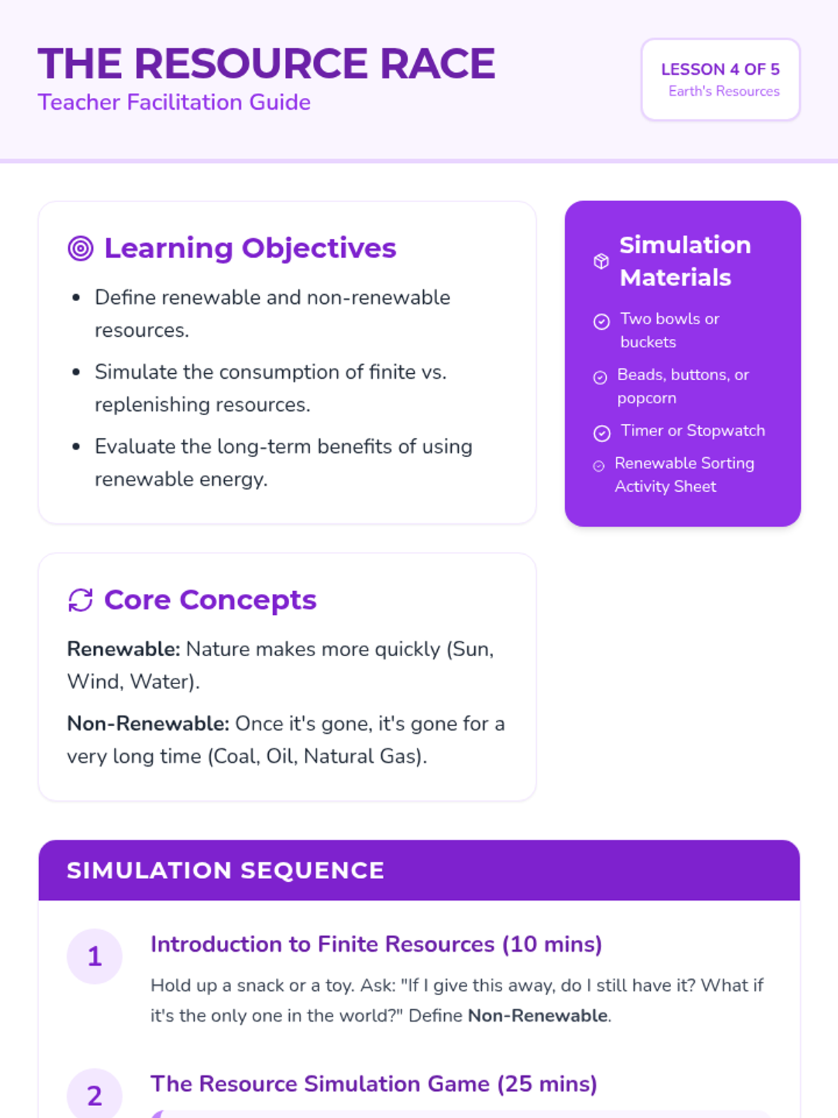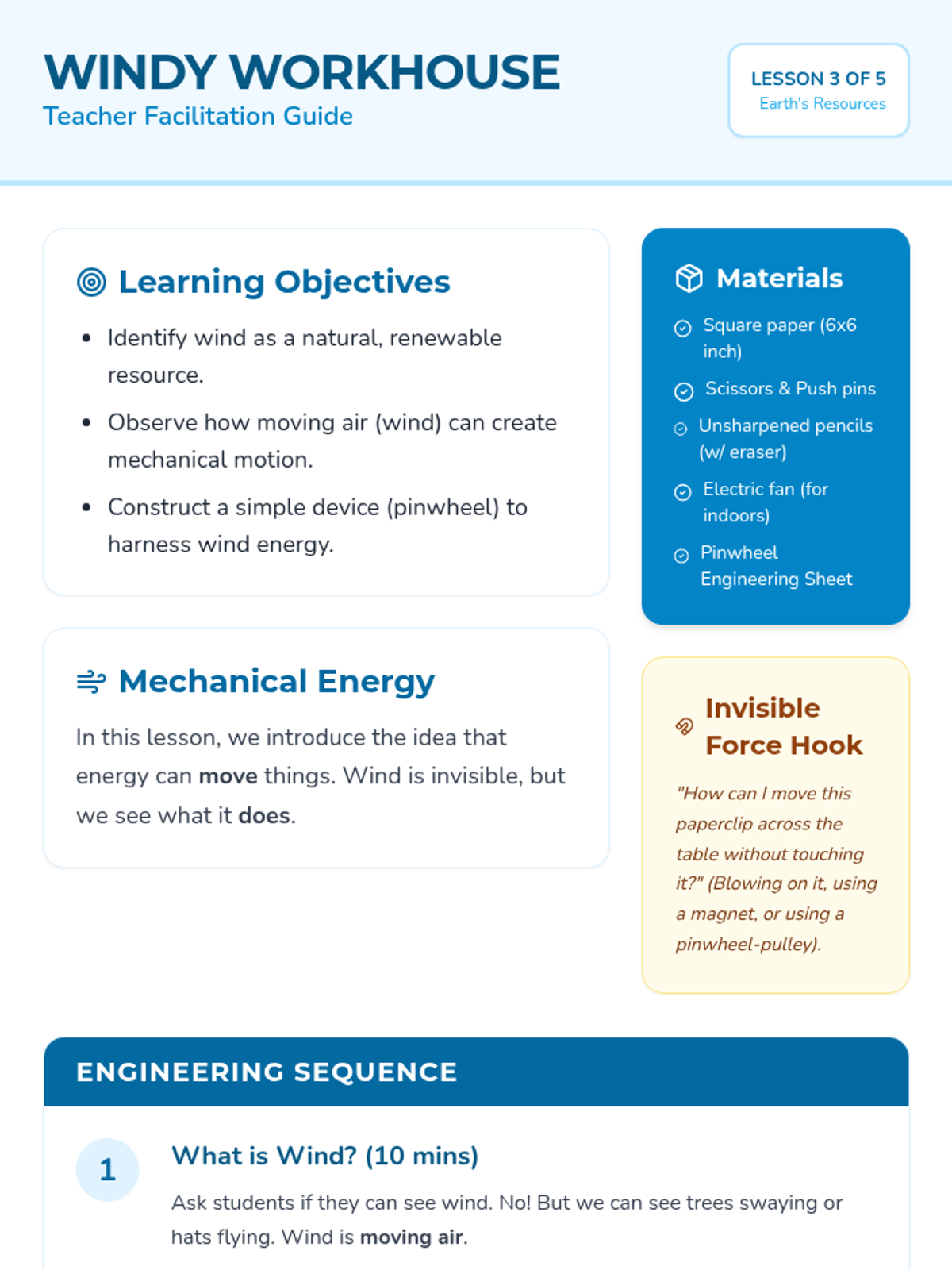 A 2nd-grade science unit exploring renewable and non-renewable energy resources through hands-on inquiry, experiments, and a final design challenge. Students learn to distinguish between different energy sources and understand the importance of sustainability.
