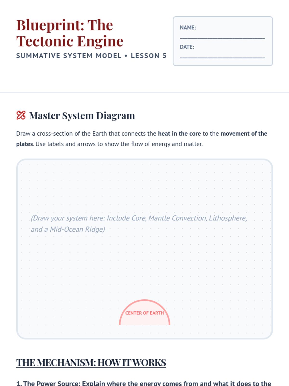 A 5th-grade sequence exploring the physical mechanisms of plate tectonics through modeling and simulation. Students investigate Earth's compositional and mechanical layers, convection currents, and seafloor spreading to understand the 'engine' driving plate movement.
