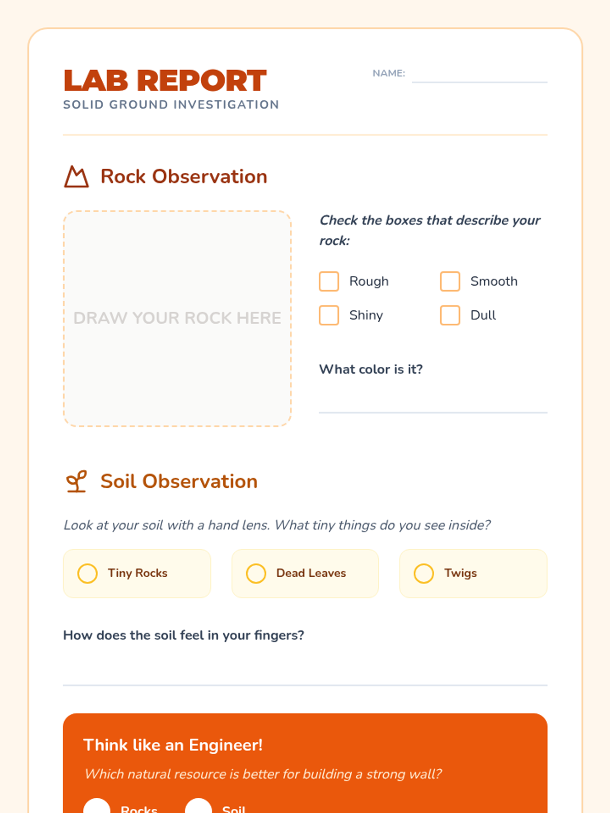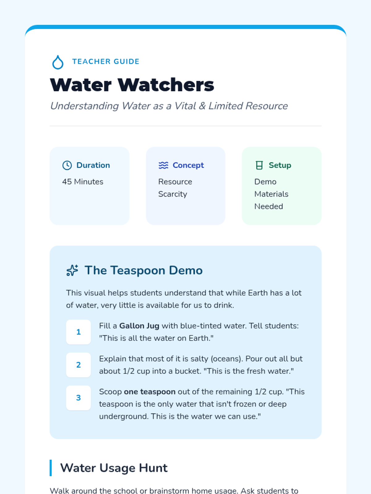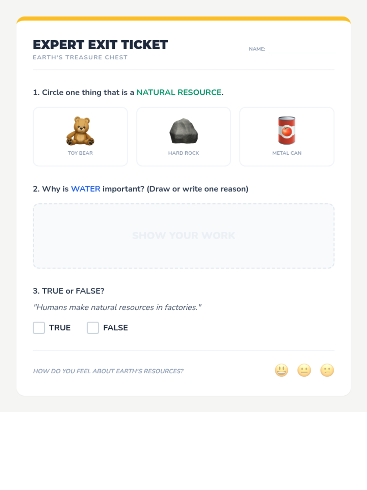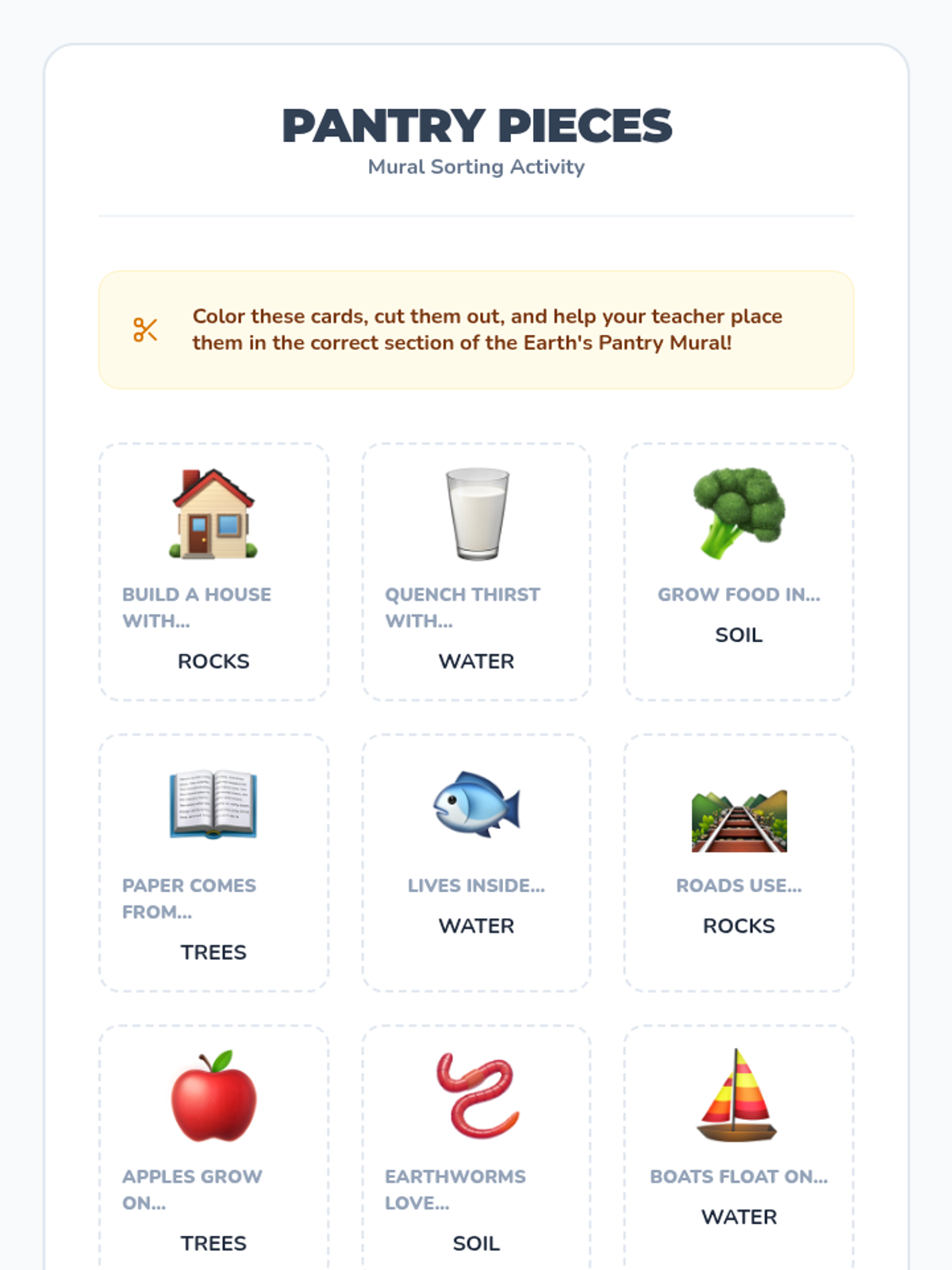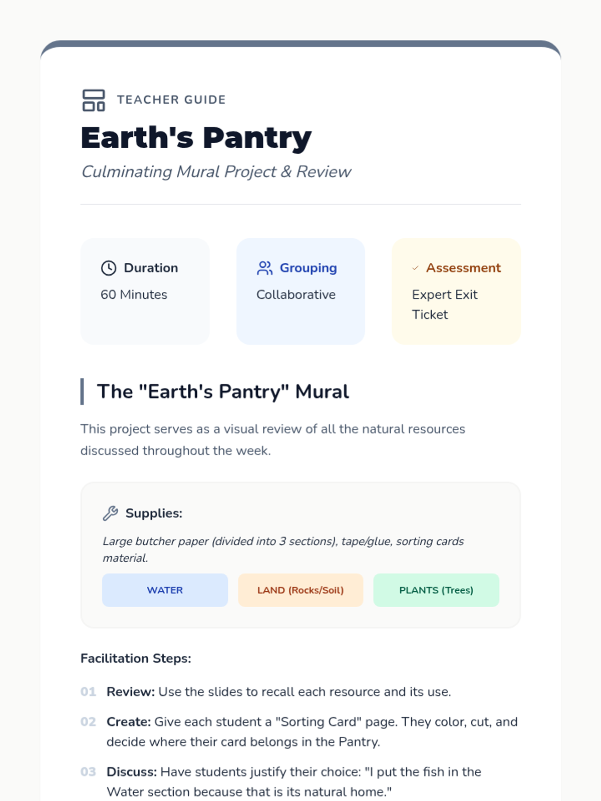 A 1st-grade sequence exploring natural resources (water, rocks, soil, plants) vs. human-made objects, emphasizing Earth's provisions for daily life.