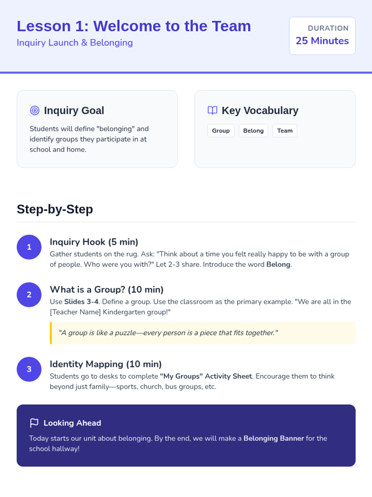 A 15-day Kindergarten Social Studies inquiry unit focused on belonging, roles, and navigation. Students explore their identities, map their environments, and investigate why and how people move. Uses the C3 framework to move from inquiry to informed action.