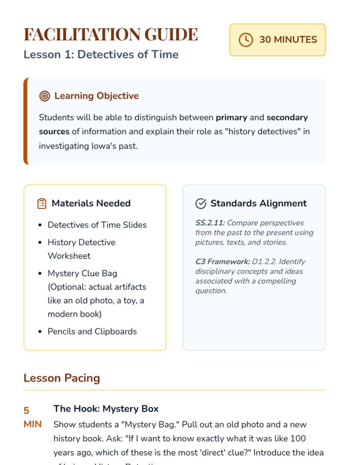 A comprehensive 20-lesson inquiry unit for 2nd grade exploring Iowa's history, focusing on changes in daily life, significant individuals, and community celebrations using the C3 Framework.